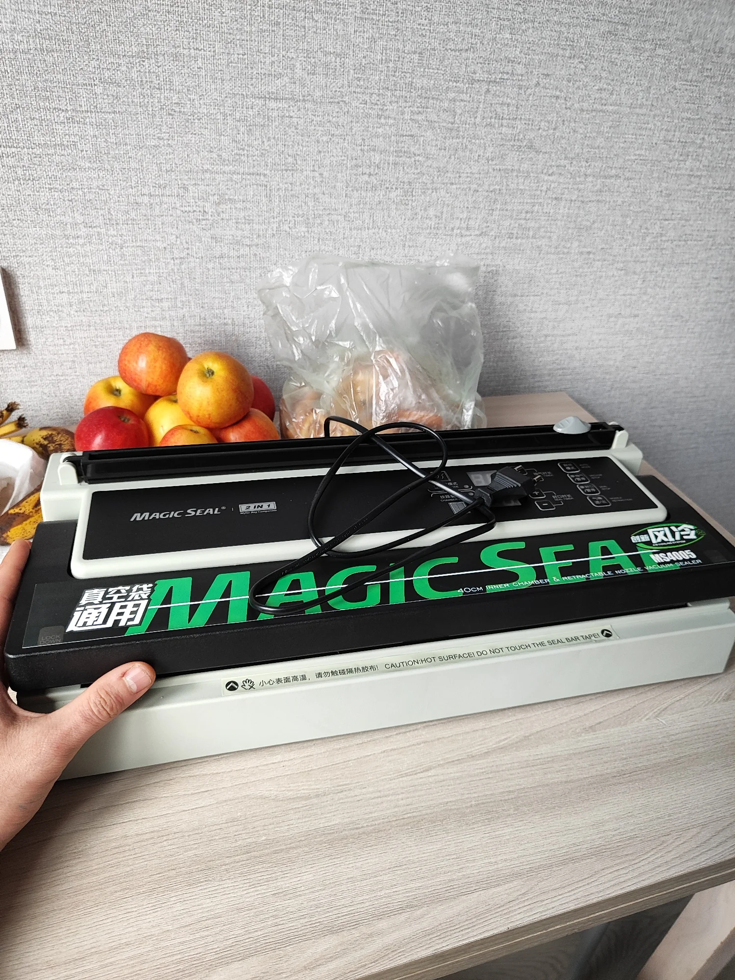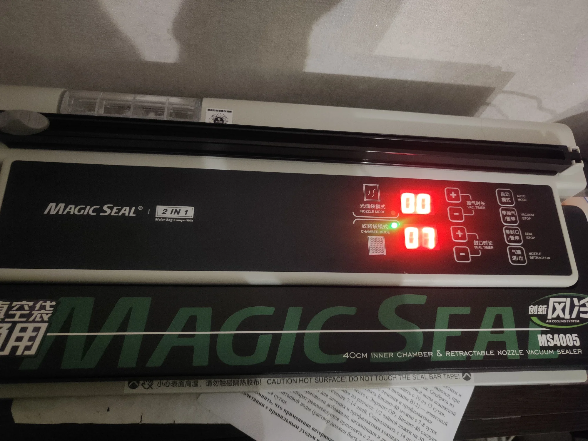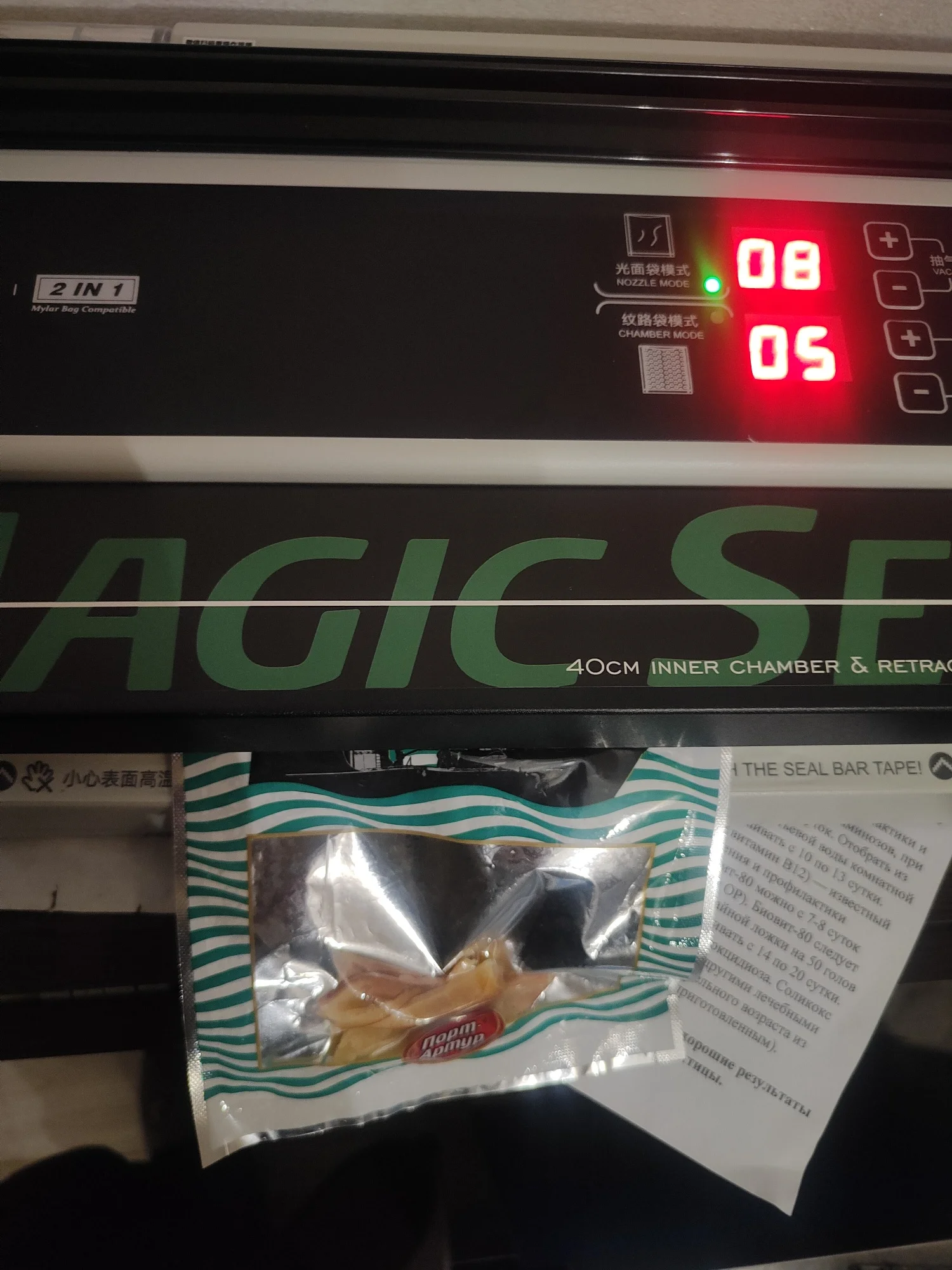 Отличная штука Пришла быстро доставка до пятерочки, пришло в в целости и сохранности. Сам аппарат упакован хорошо коробка хоть и замята но не критично. Выглядит уверенно качество сборки хорошее со своей задачей справляется на ура, в комплекте идёт ёмкость для сбора жидкости с комплектом шлангов инструкция на английском ( но по картинкам всё можно понять ) и комплект пробных пакетов (гладкие, рифлёные). Понравился режим работы с возможностью ручной настройки времени запайки. Аппарат и вправду универсальный берёт любые пакеты на запайку от толстых вакуумных то тонких одноразовых. Шов получается ровный толстый как на заводских упаковщиках. По поводу двух режимов гладкий - рифленый, рифленые вакуумирует сильнее к гладким надо приноровиться. В общем отличный аппарат Рекомендую !!!