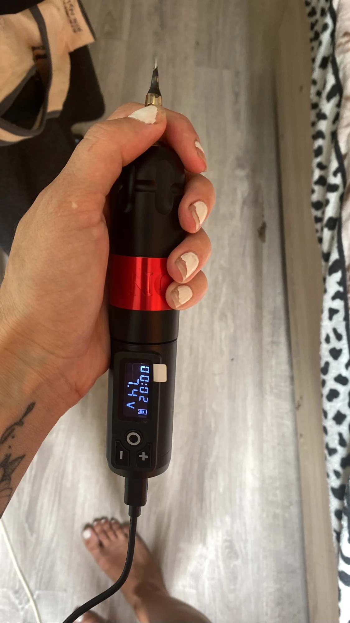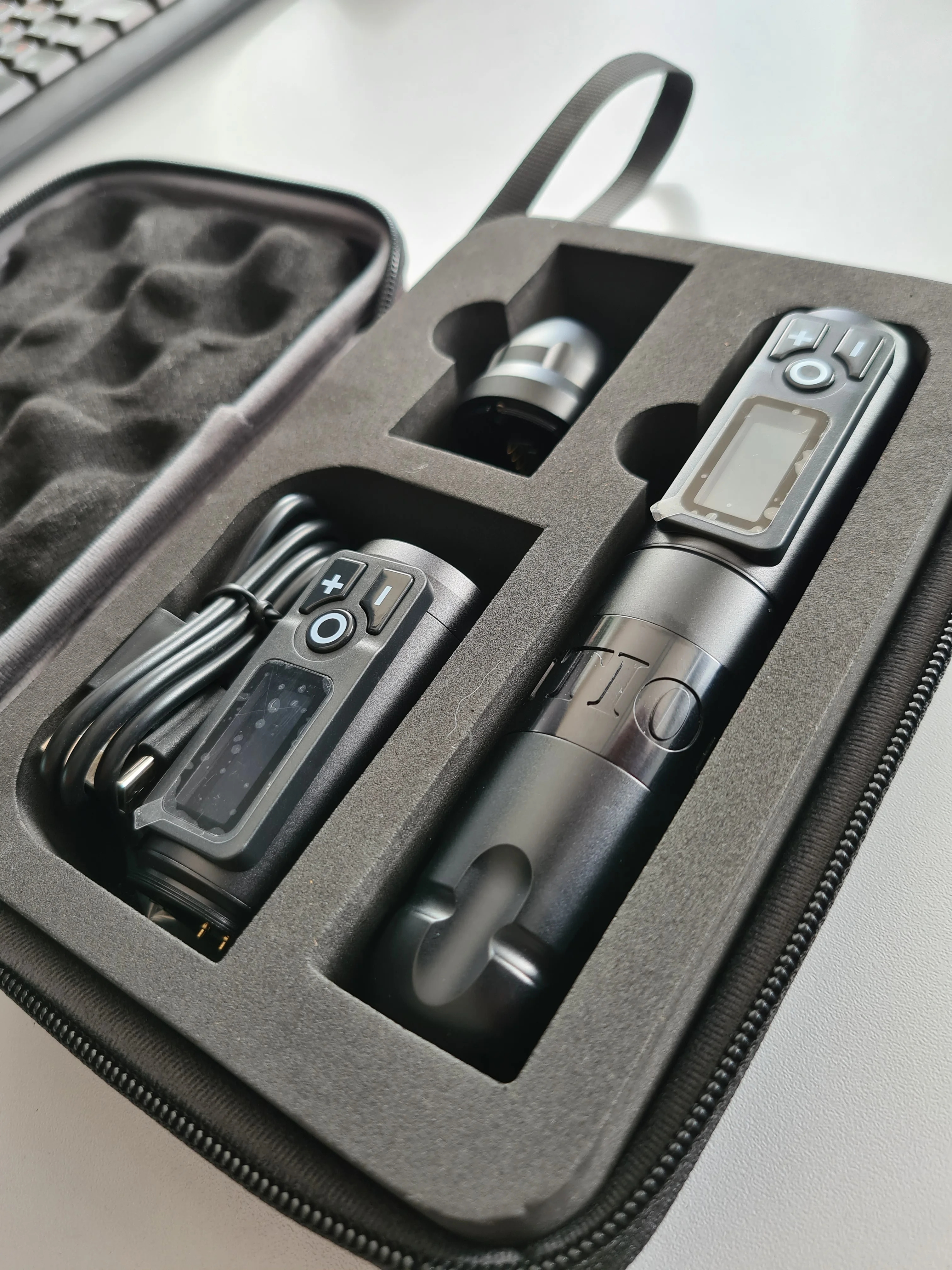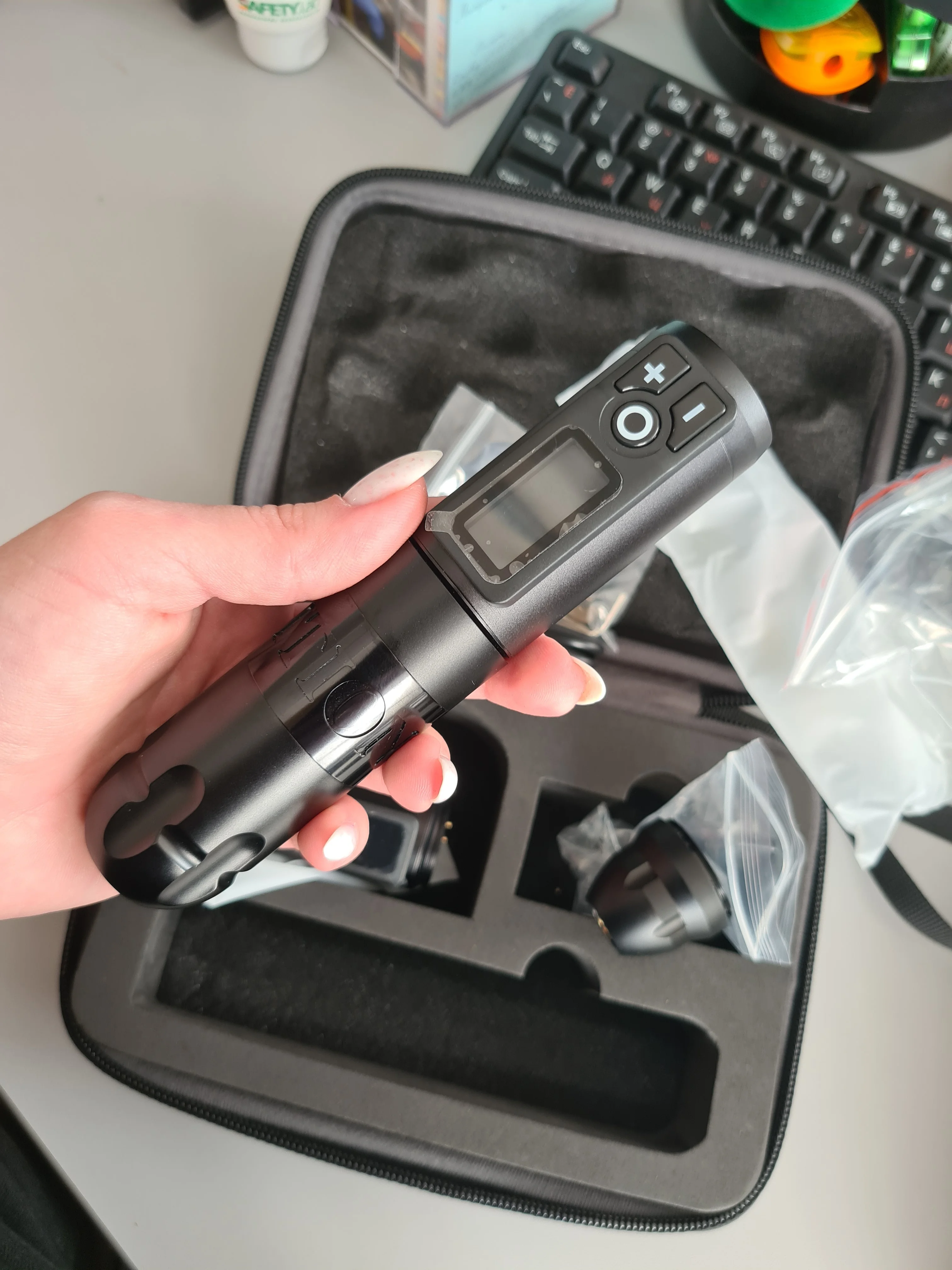 Машинка огонь! После inkjecta кажется немного тяжёлой, но это дело привычки. Тихая, вибрации практически нет, кроме кнопок больше нигде никакого люфта замечено не было. Аккумулятора хватает на 2 больших или 3 средних сессии 100%, когда батарея разряжена, машинка не останавливается, даже наоборот немного увеличивает мощность, но при этом гаснет дисплей, но это не точно, пока что у меня такое случилось только однажды. В большинство барьерных рукавов машинка входит без напряга, контуры, тени, цвет - ей всё под силу и всё в кайф, в умелых руках и рыбная кость отлично контурит, кстати о рукастых - можете самостоятельно сменить двигатель на оригинальный Faulhaber, надо только измерить диаметр и высоту движка в мм. За кейс отдельный лайк! P.S все фото без фильтров, лошадь 4 часа, носорог 6:45 если верить таймеру, однако в реальности больше, в обоих случаях заряд батареи ещё оставалсяAydar S. 15 декабря 2021