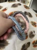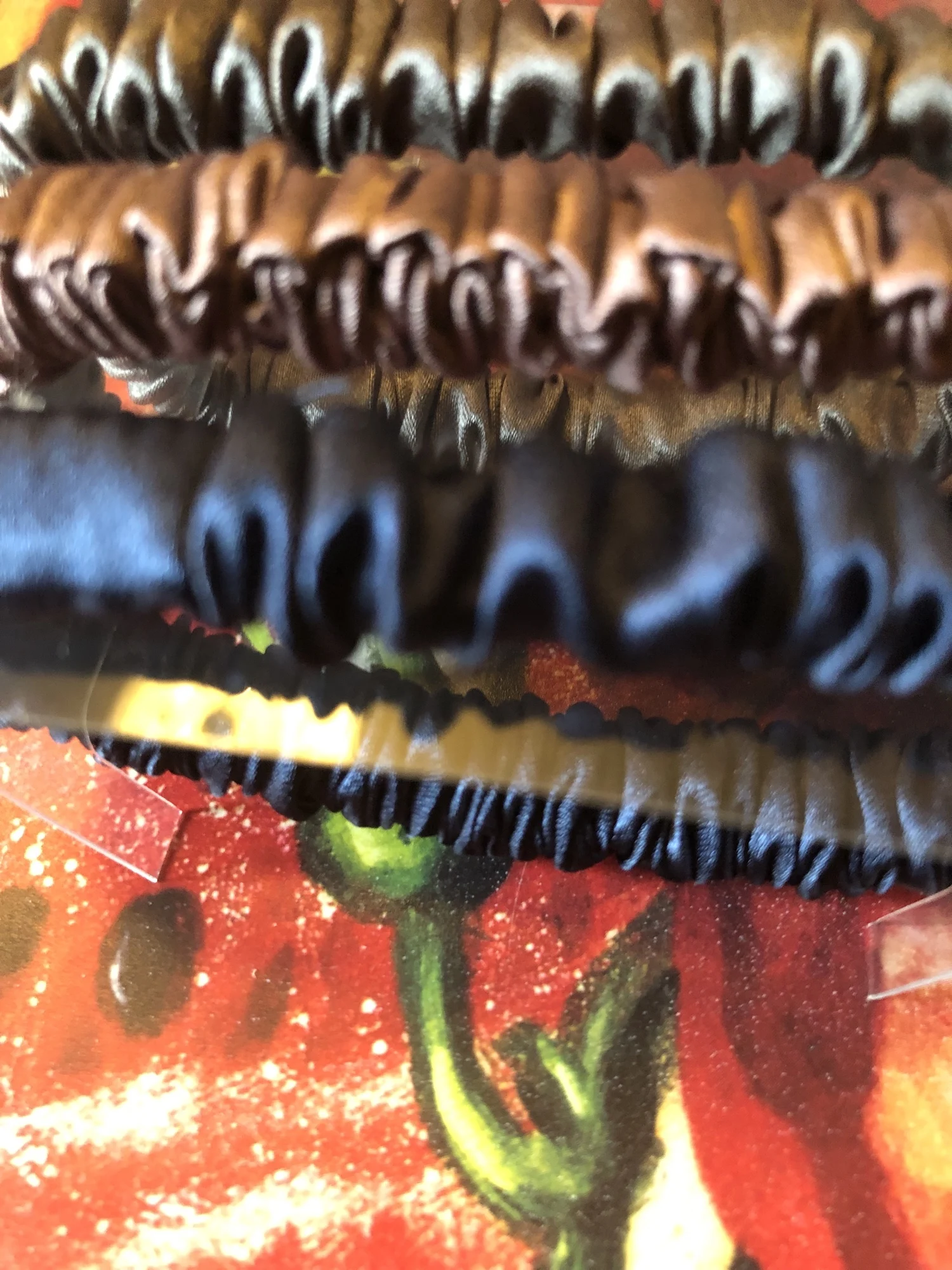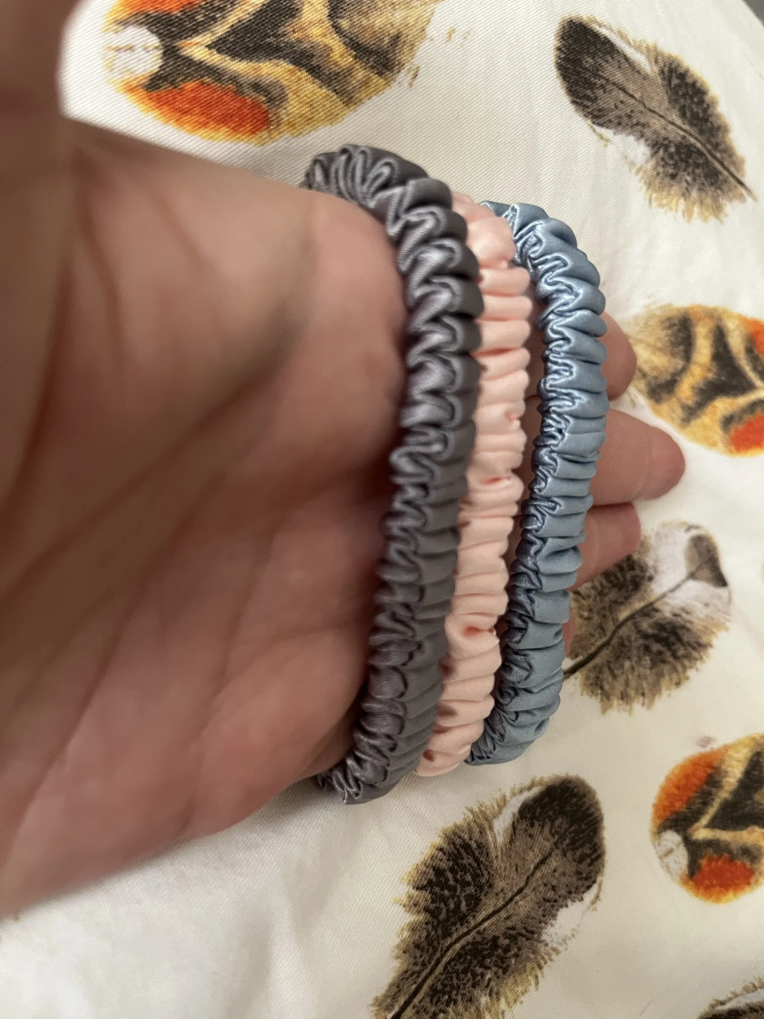 Доставка быстрая, заказала 10.06. получила 18.06. На одной резинке были нитки и они все три разного размера. Есть запах. Но в целом красивые резинки.