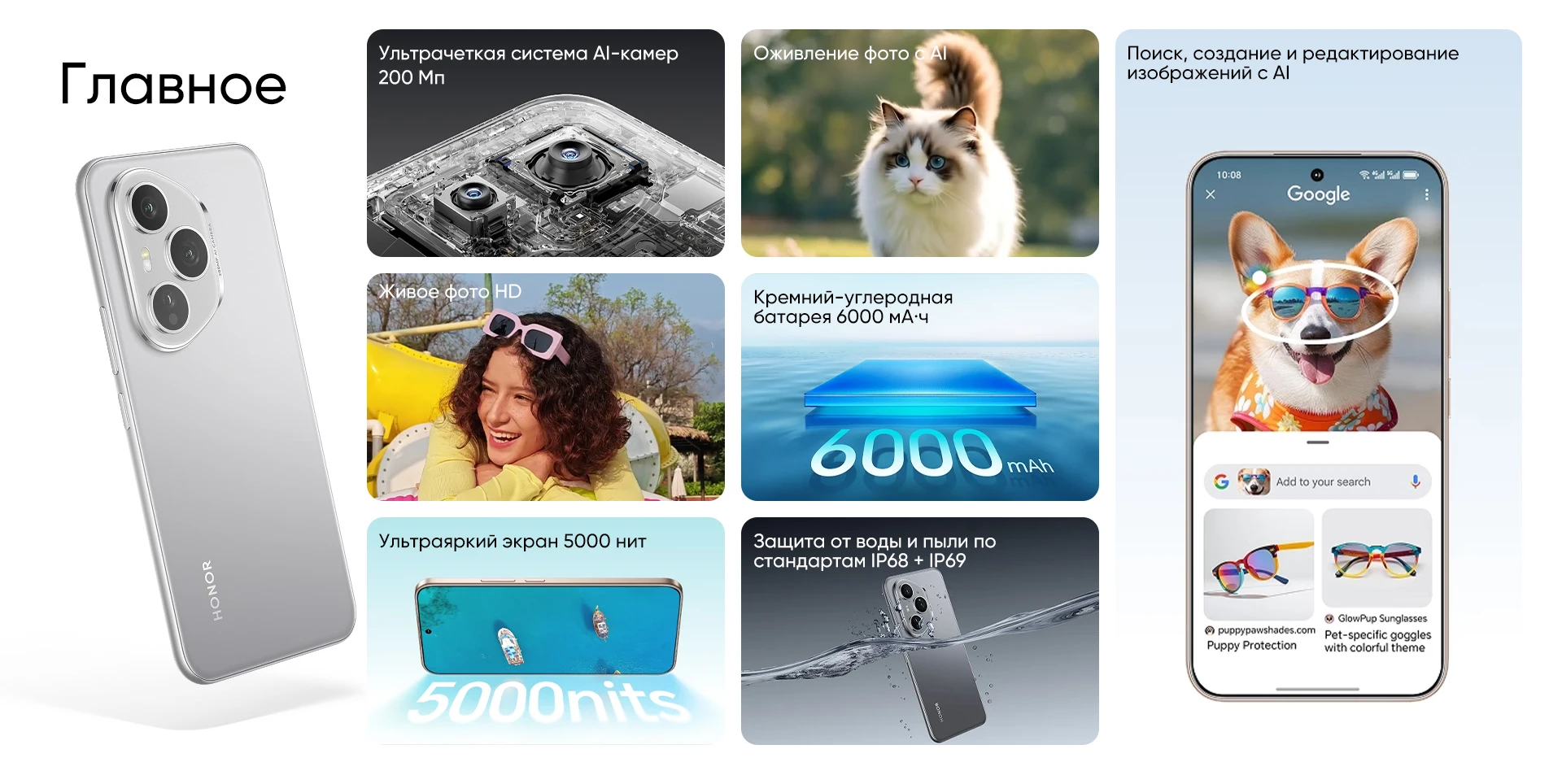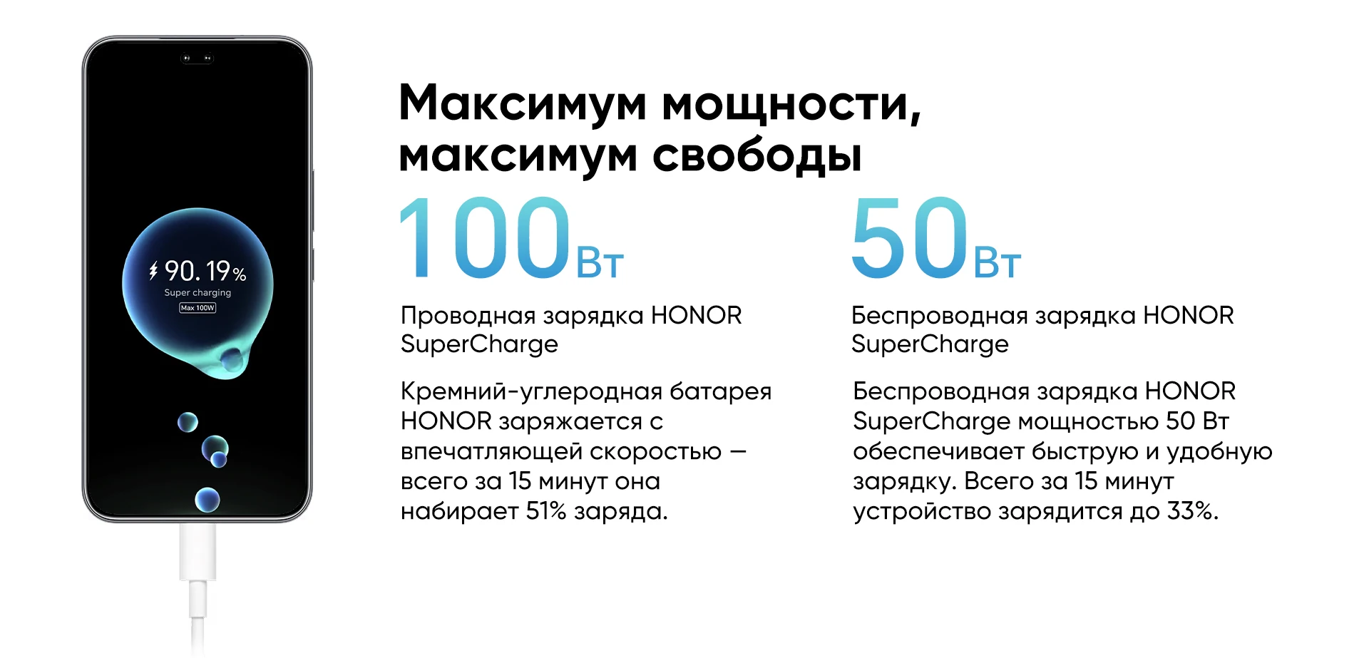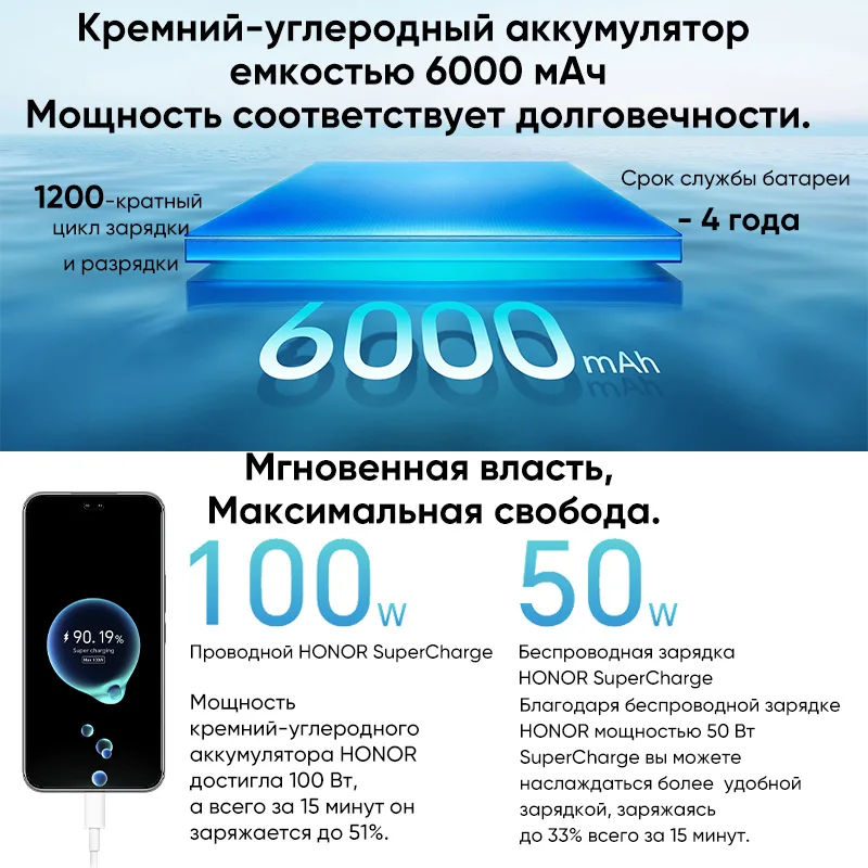 Аккумулятор: 6000 мАч (типичное значение),100 Вт HONOR Supcharge, Беспроводная зарядка 50 Вт;
