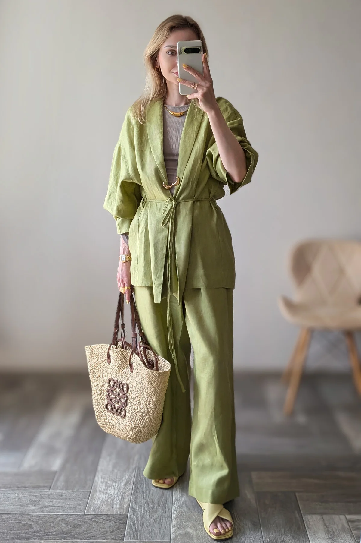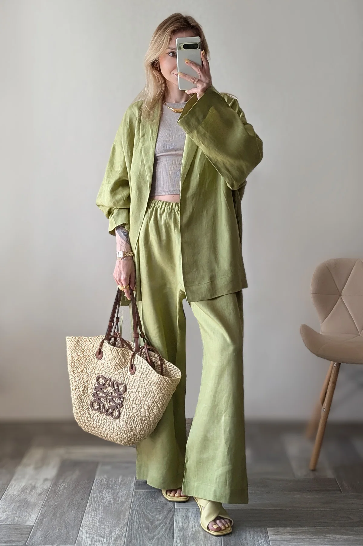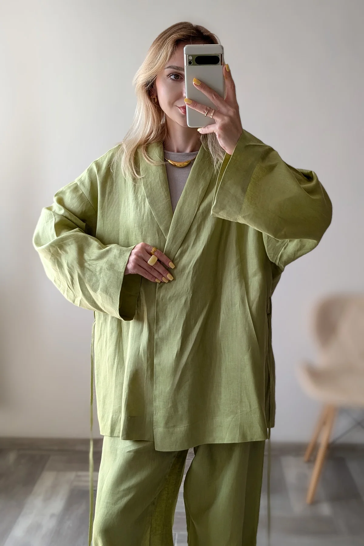 Больше обзоров и находок на моём канале Костюм идеален на прогулки, можно верх и низ комбинировать в другие образы На свои параметры 86-57-86 см и рост 165 см я взяла костюм в размере М У продавца на выбор четыре расцветки — есть и базовые расцветки — трендовый голубой и шоколад Но я выбрала Olive green Исполнение прекрасное: пошив фабричный, торчащих ниток не было По составу - чистый лён Костюм состоит из кимоно и брюк Верх на меня довольно объёмный, но ситуацию я спасла любимыми брошами-круассанами Ну и пояском, который идёт в комплекте А вот брюки по ростовке на мои 165 см - как раз (не наступаю, посему этот костюм я активно ношу На девочках выше - будут смотреться аки кюлоты, которые вновь возвращаются в моду Резиночка на талии мягкая, эластичная, следов не оставляет Посадка довольно комфортная Костюм смотрится просто бесподобно Да, мнётся, но со льном по-другому не бывает Что визуально, что по качеству - ТОП! ОЧЕНЬ ГРОМКО советую к покупке: на лето - идеально