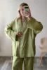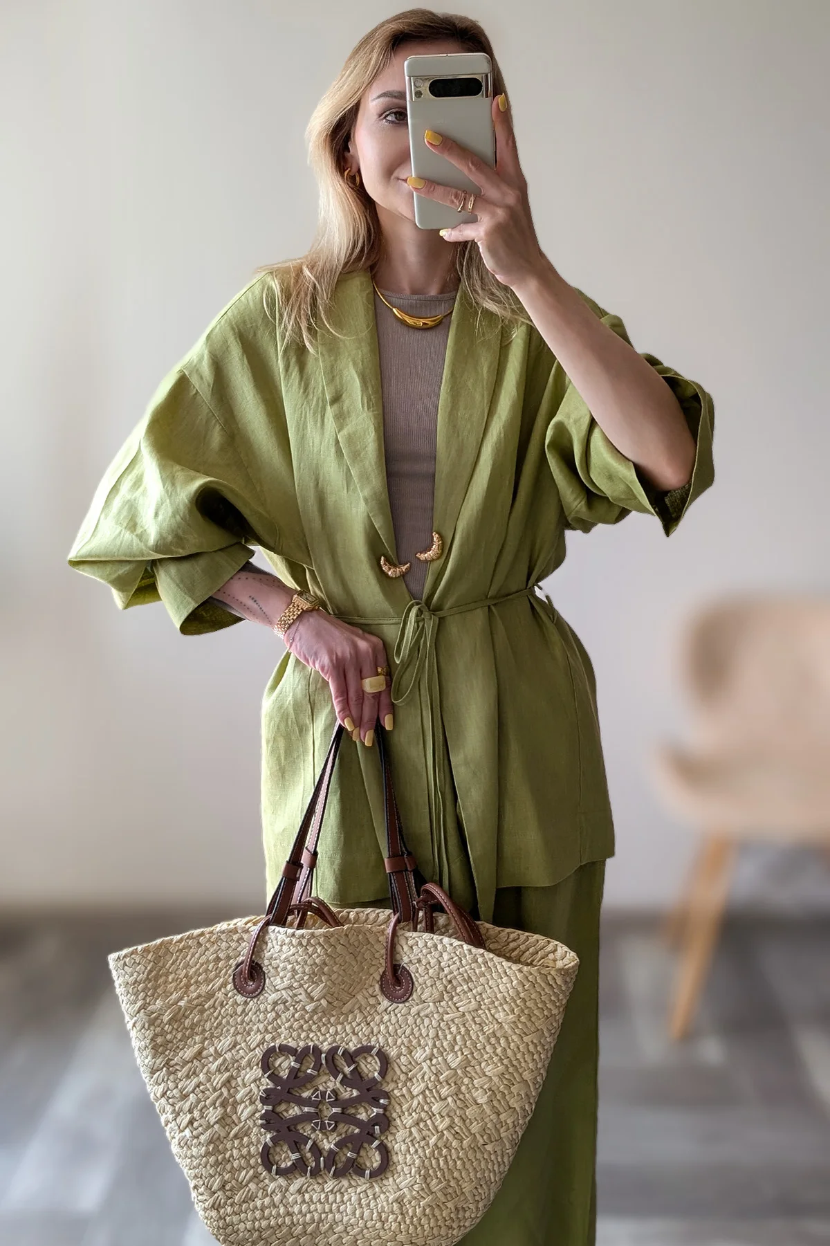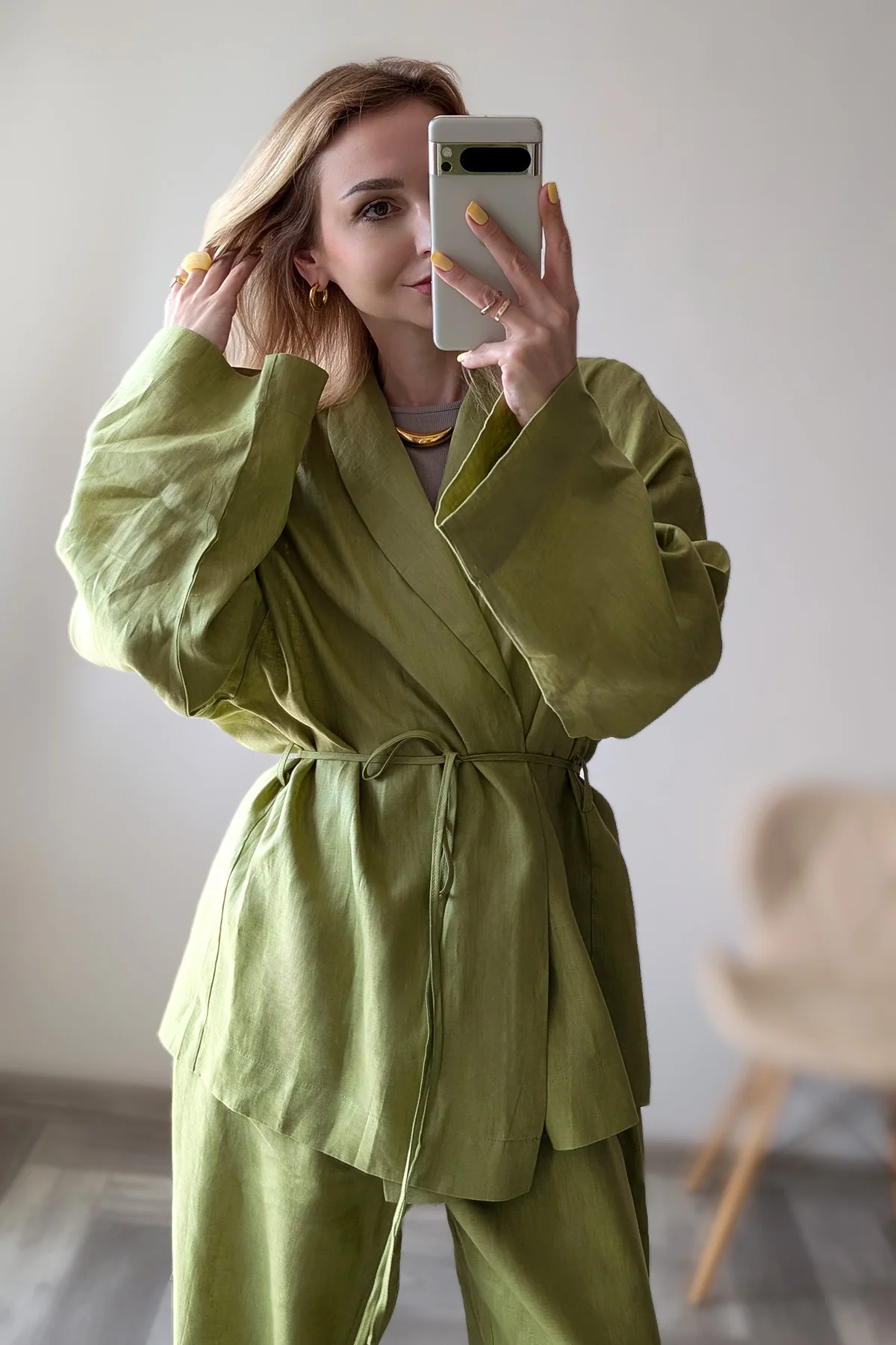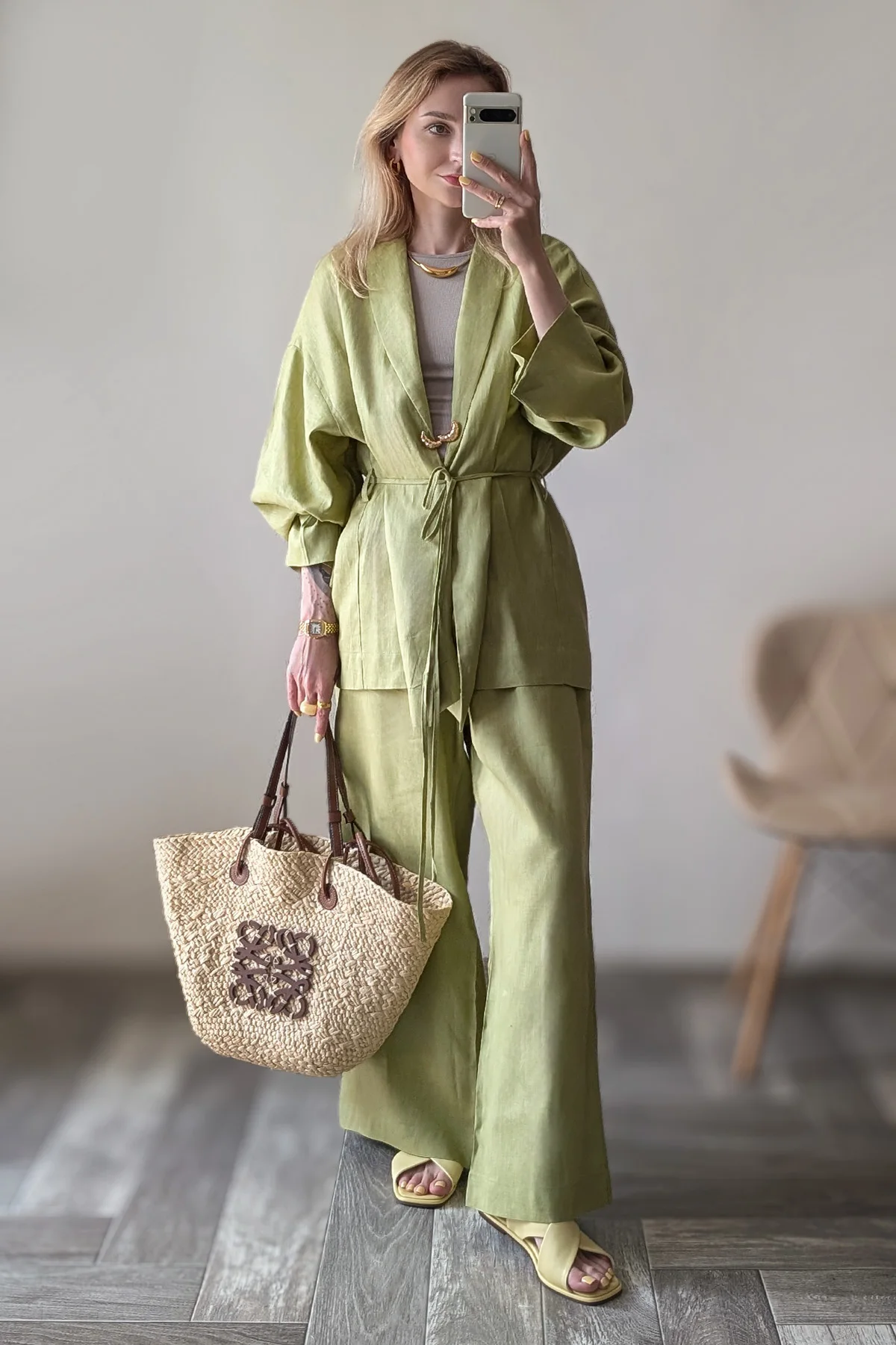 Больше обзоров и находок на моём канале Костюм идеален на прогулки, можно верх и низ комбинировать в другие образы На свои параметры 86-57-86 см и рост 165 см я взяла костюм в размере М У продавца на выбор четыре расцветки — есть и базовые расцветки — трендовый голубой и шоколад Но я выбрала Olive green Исполнение прекрасное: пошив фабричный, торчащих ниток не было По составу - чистый лён Костюм состоит из кимоно и брюк Верх на меня довольно объёмный, но ситуацию я спасла любимыми брошами-круассанами Ну и пояском, который идёт в комплекте А вот брюки по ростовке на мои 165 см - как раз (не наступаю, посему этот костюм я активно ношу На девочках выше - будут смотреться аки кюлоты, которые вновь возвращаются в моду Резиночка на талии мягкая, эластичная, следов не оставляет Посадка довольно комфортная Костюм смотрится просто бесподобно Да, мнётся, но со льном по-другому не бывает Что визуально, что по качеству - ТОП! ОЧЕНЬ ГРОМКО советую к покупке: на лето - идеально