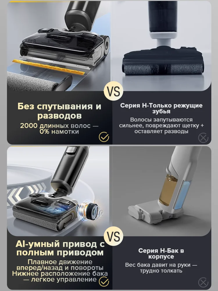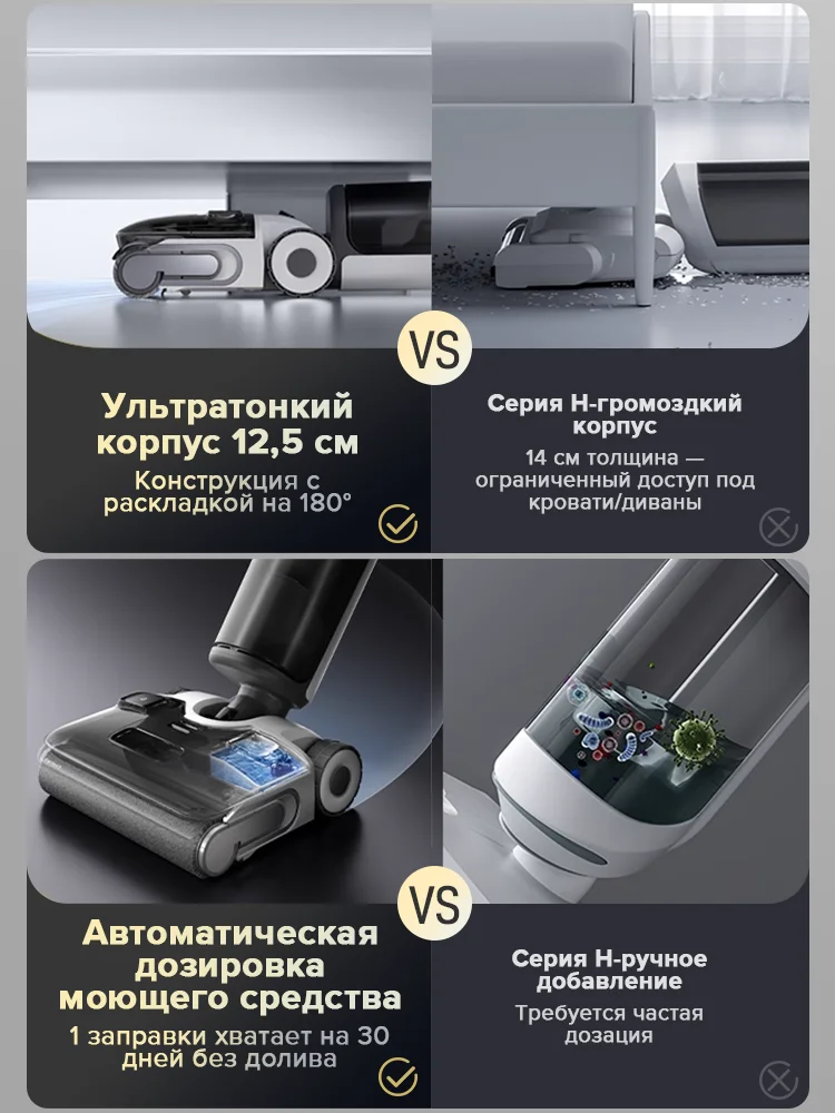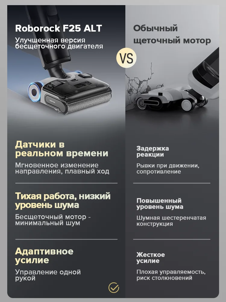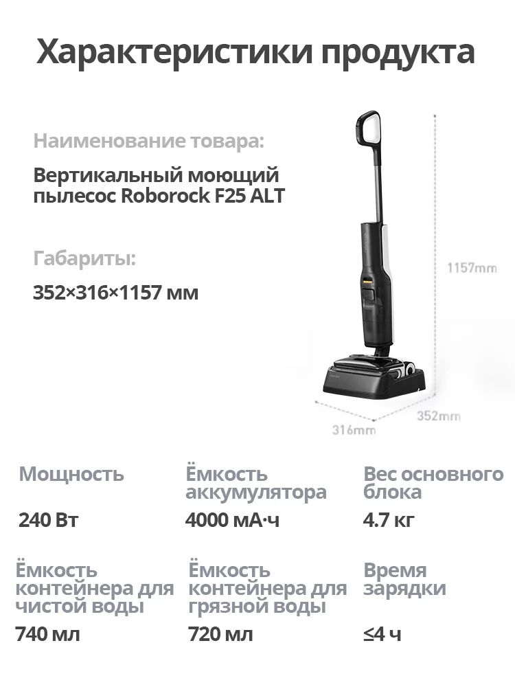 Отзыв будет сравнительный. Так получилось, что в начале протестировал Roborock F25 ACE, потом когда начал искать данный моющий пылесос в процессе поиска встретил много модификаций Roborock F25, но нигде нет пояснений чем они друг от друга отличаются и в итоге по фотографиям выбрал Roborock F25 ALT и вот теперь могу достоверно сказать отличия. Данный пылесос ALT имеет автоподачу моющего средства, интеллектуальные колёсики и станцию сушки, по функционалу по сути всё тоже самое что и у ACE, но он не подсоединяется к приложению. Всё управление происходит в ручную с кнопок на ручке. Также у ALT озвучка голоса на русском языке, на АСЕ была английская. Убирает ALT отлично, очень удобно, что есть станция самоочистки и сушки. Если всё суммировать, то самая лучшая модель среди всех Roborock F25 это ACE (в нем есть все функции и настройки с приложения), модель Roborock F25 ALT на ступеньку ниже нежели ACE так как у него нет управления с приложения и датчика по распознаванию типа грязи, а в остальном тоже самое что и ACE. Все остальные виды Roborock F25 будут на ступень ниже, чем ACE и ALT, потому что у кого-то не будет автодозатора моющего средства и т.д., т.е. чего-то не хватать.