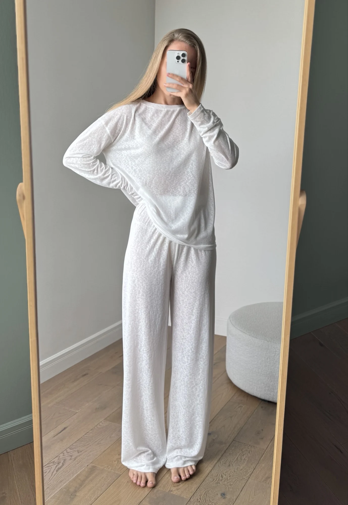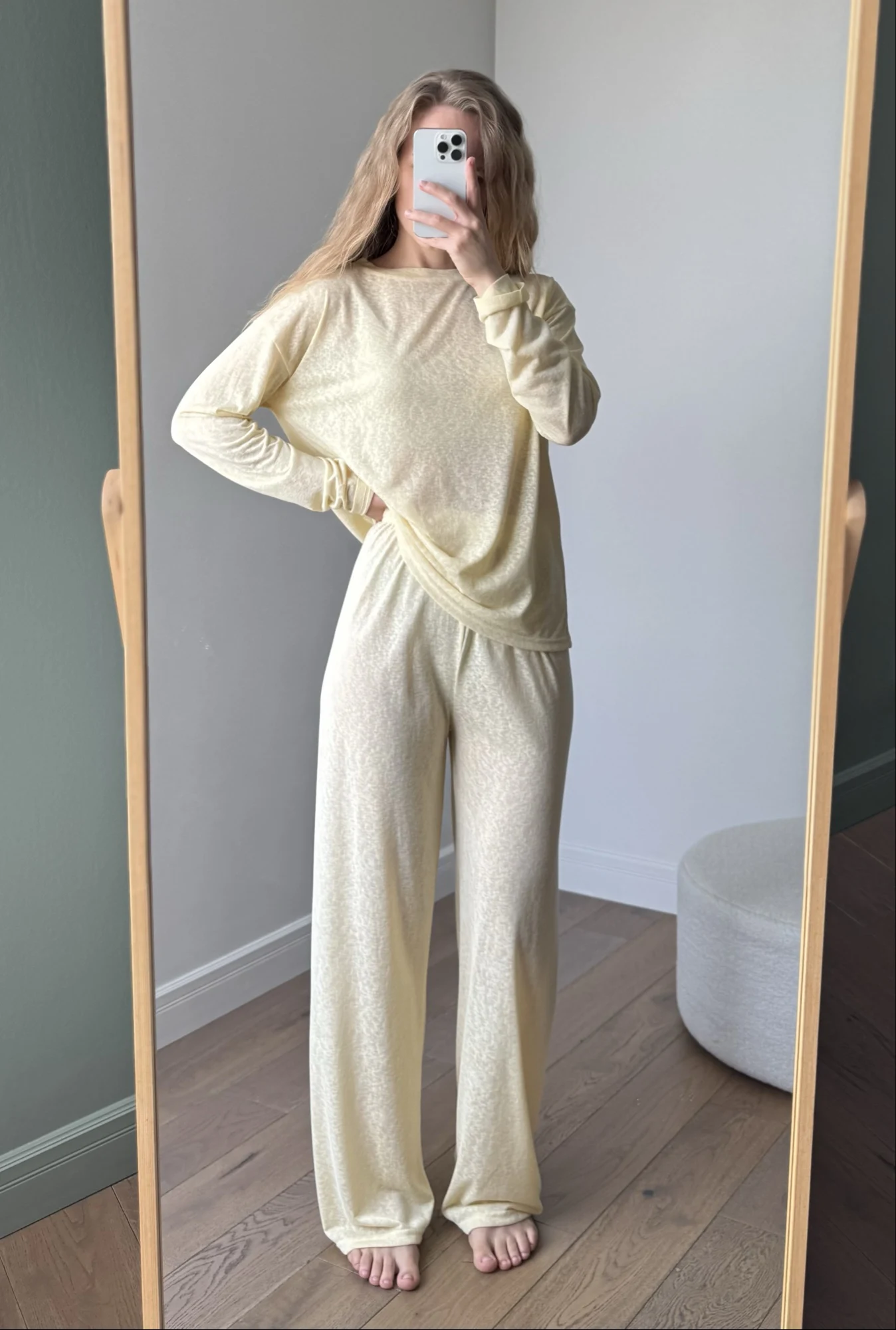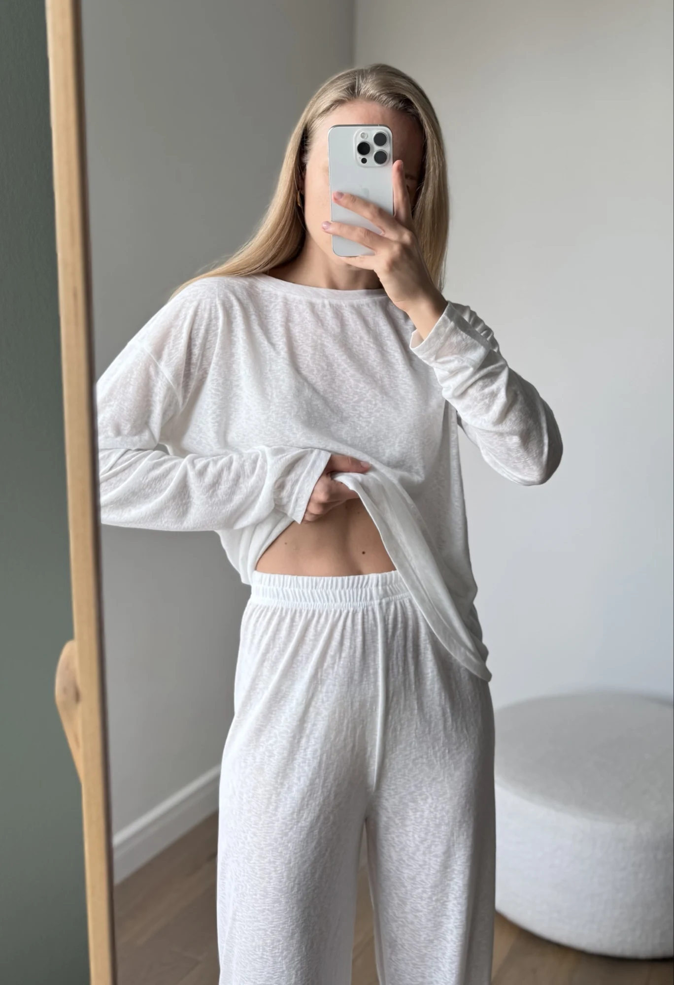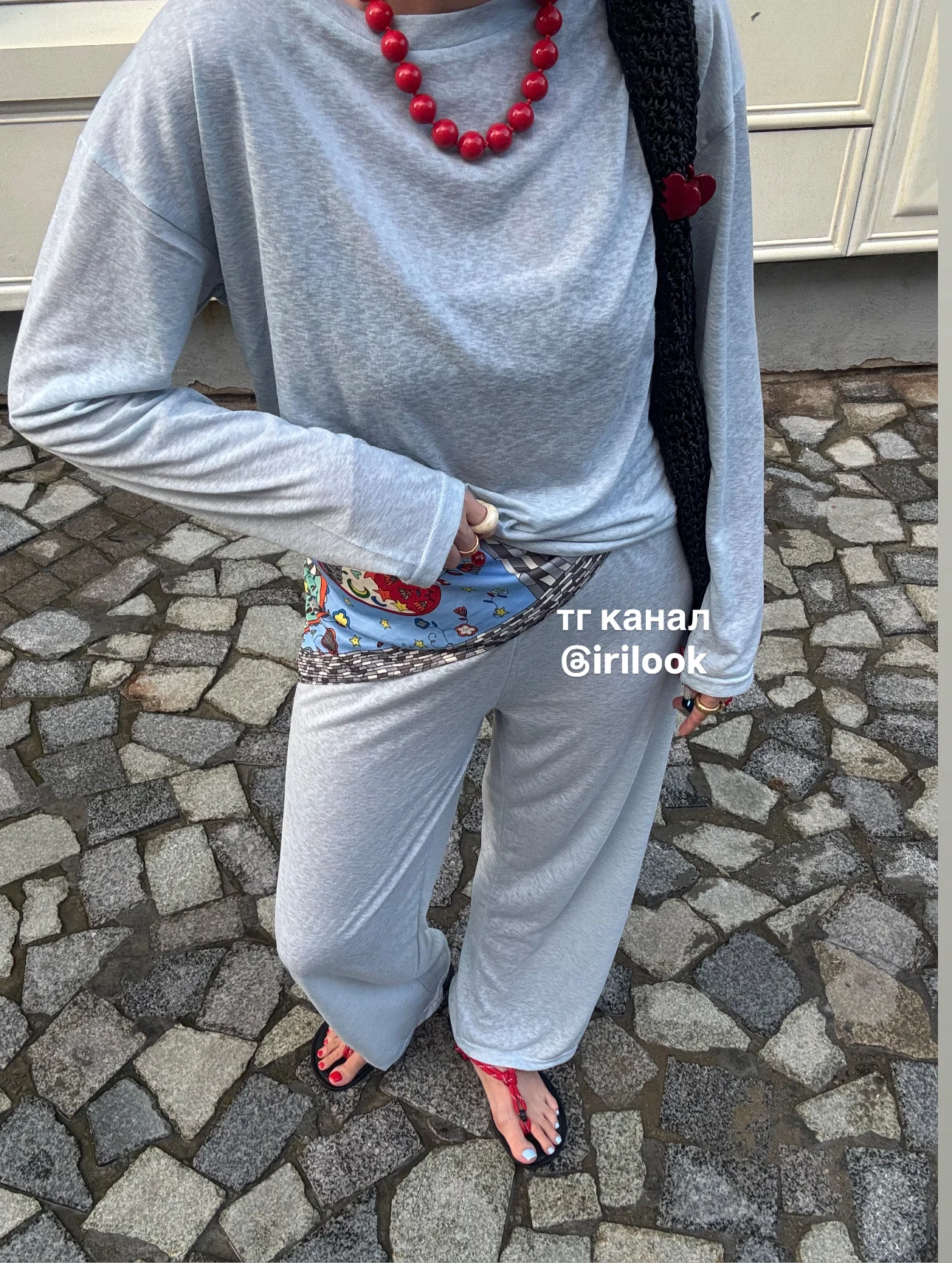 Полупрозрачный комплект из лонгслива и брюк. На свои параметры 80/63/94, рост 165 я взяла и верх, и низ в размере М. Комплект сел свободно, есть запас под большие параметры. В составе 30% вискозы и 70% полиэстера. Материал легкий и комфортный. Лонгслив и брюки продаются по отдельности.