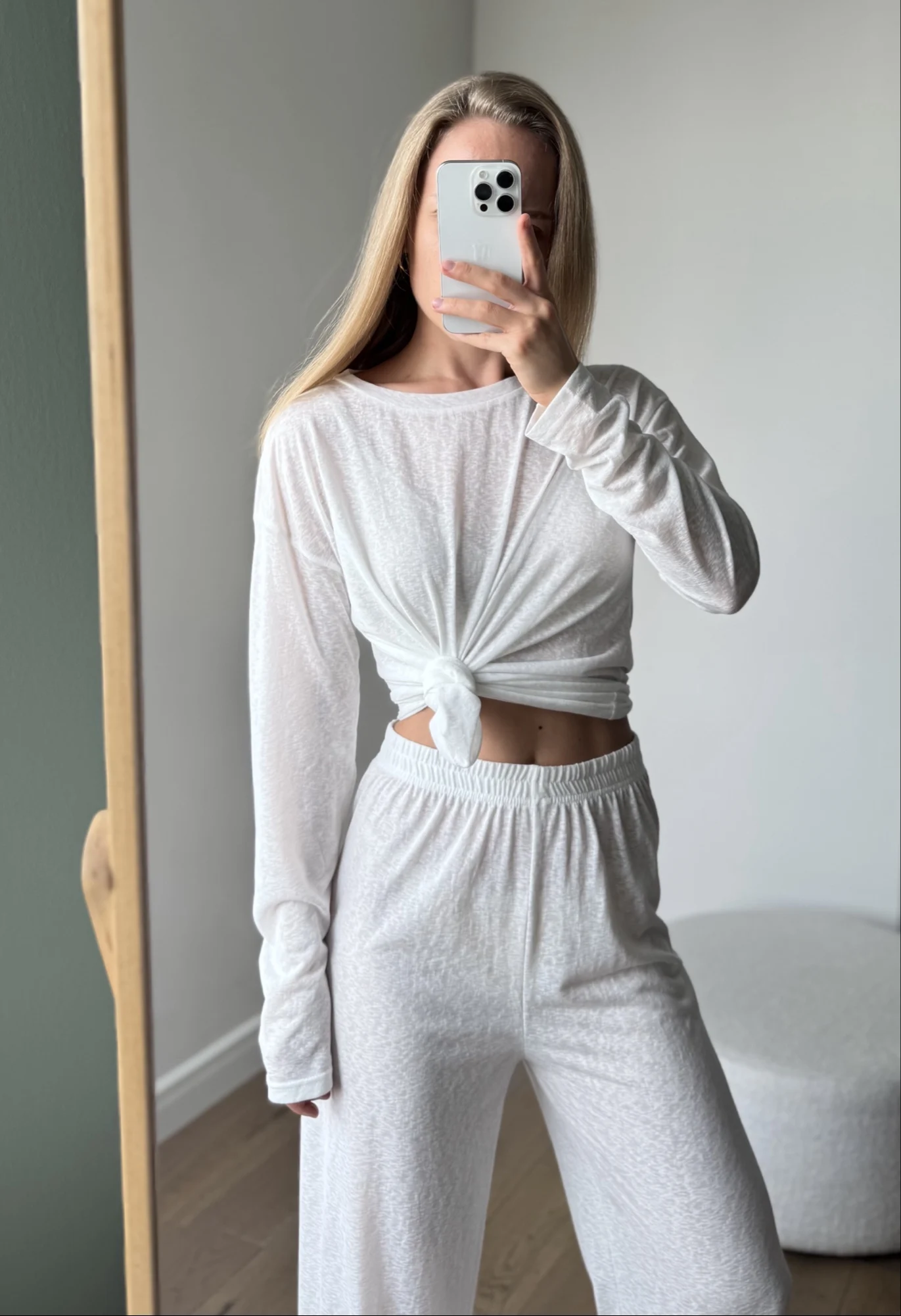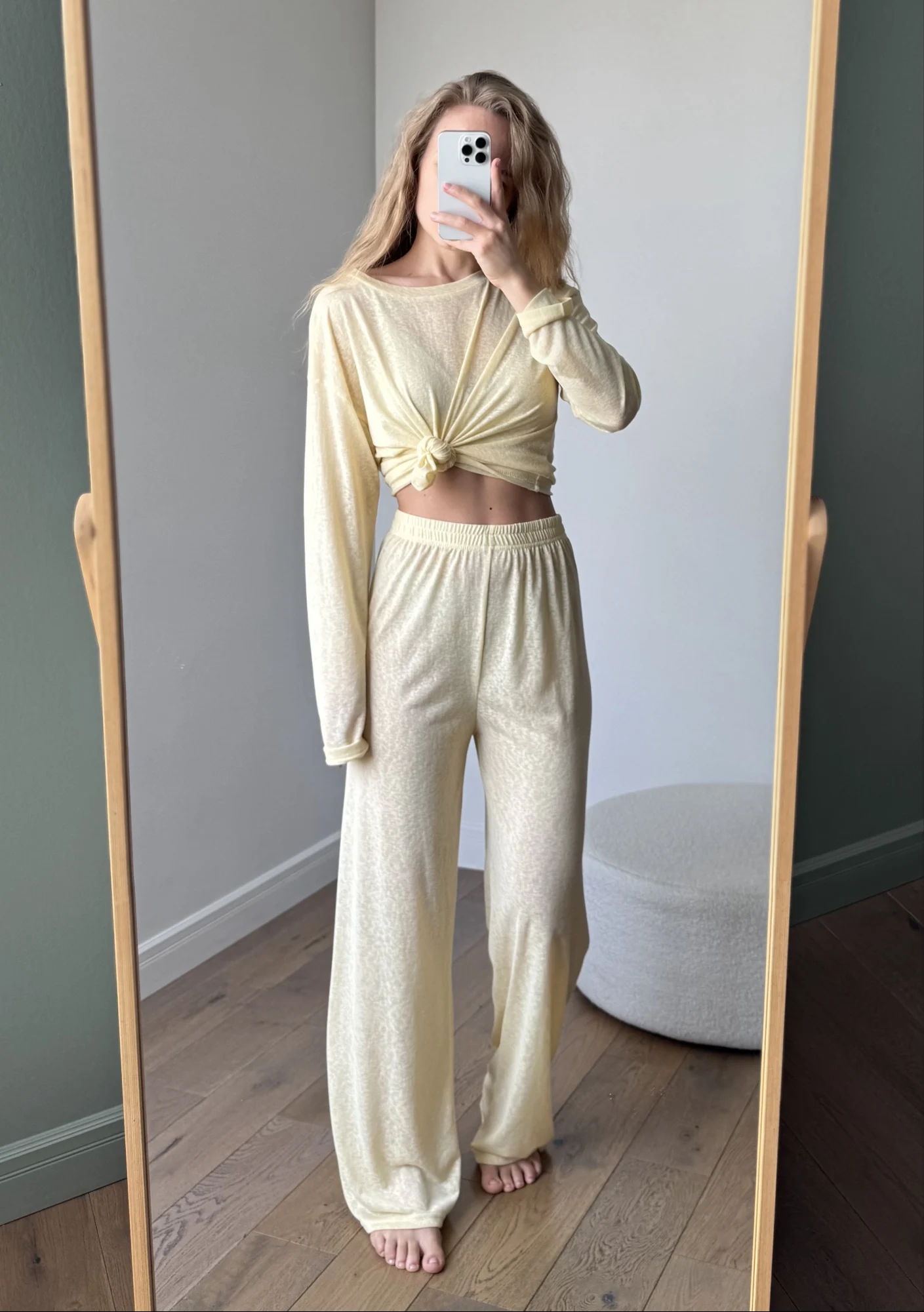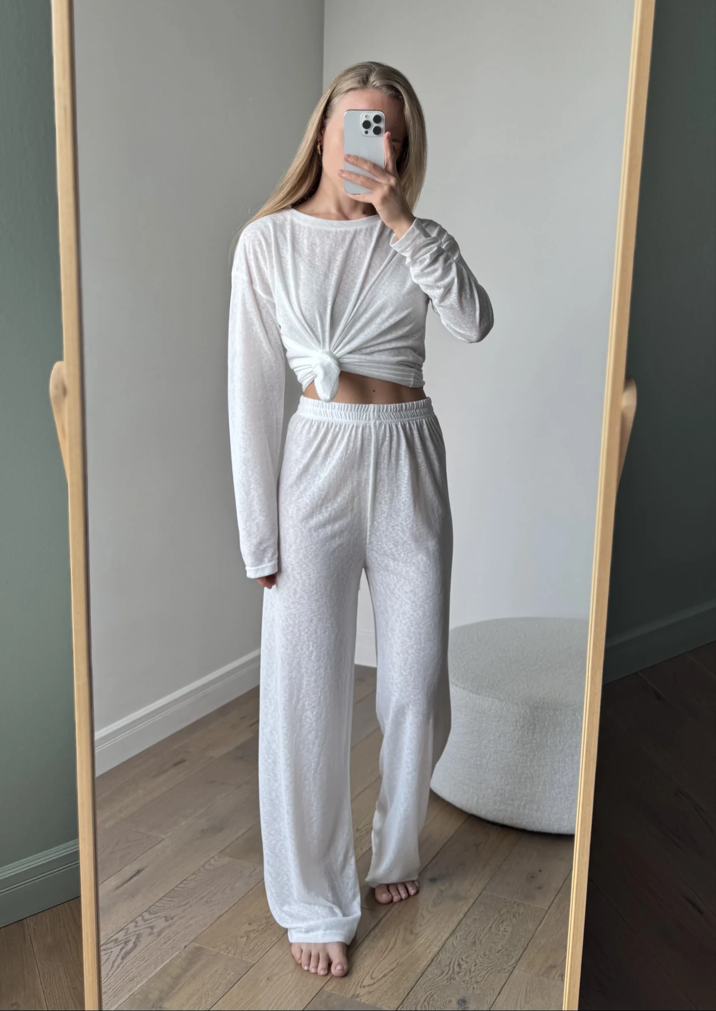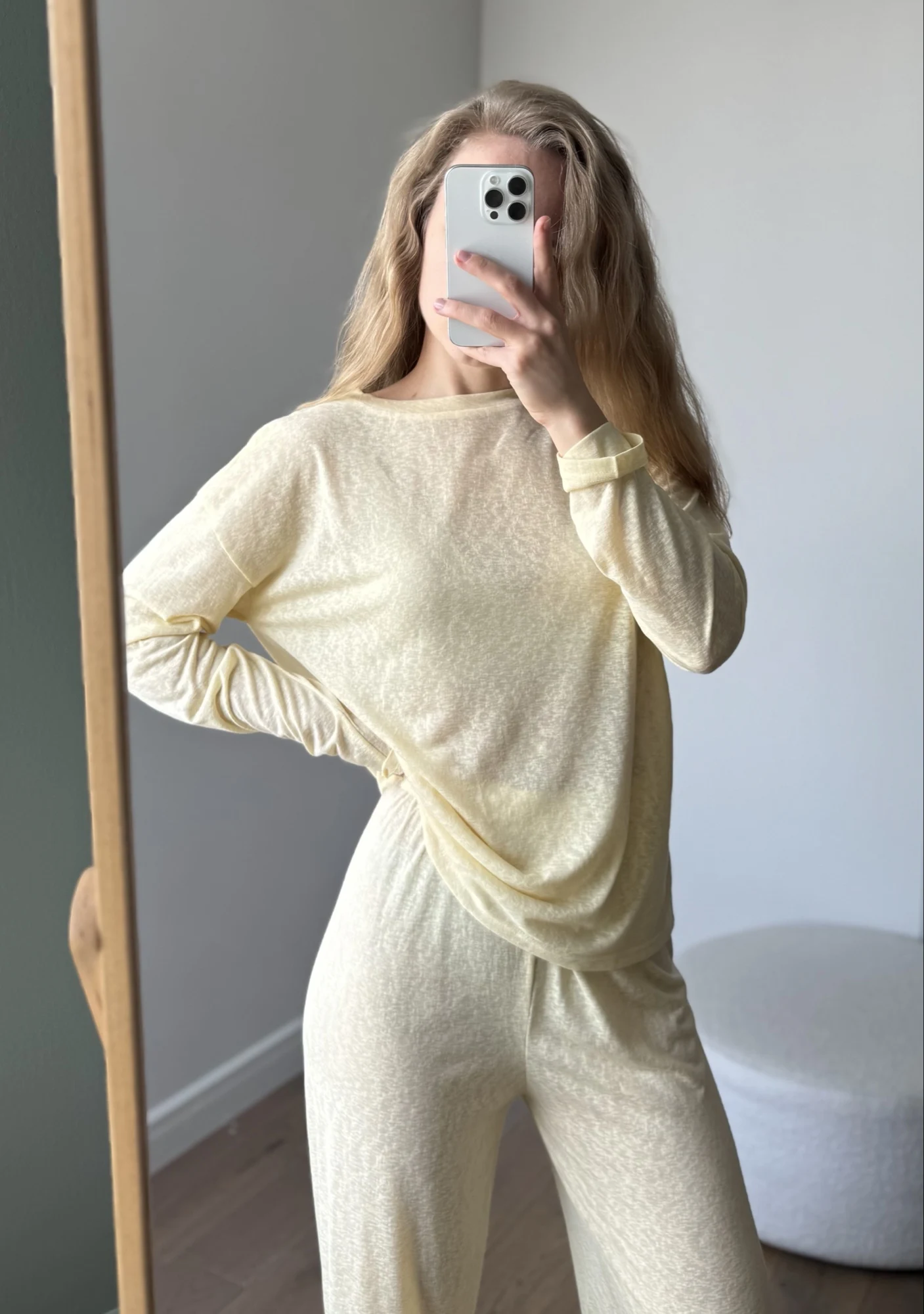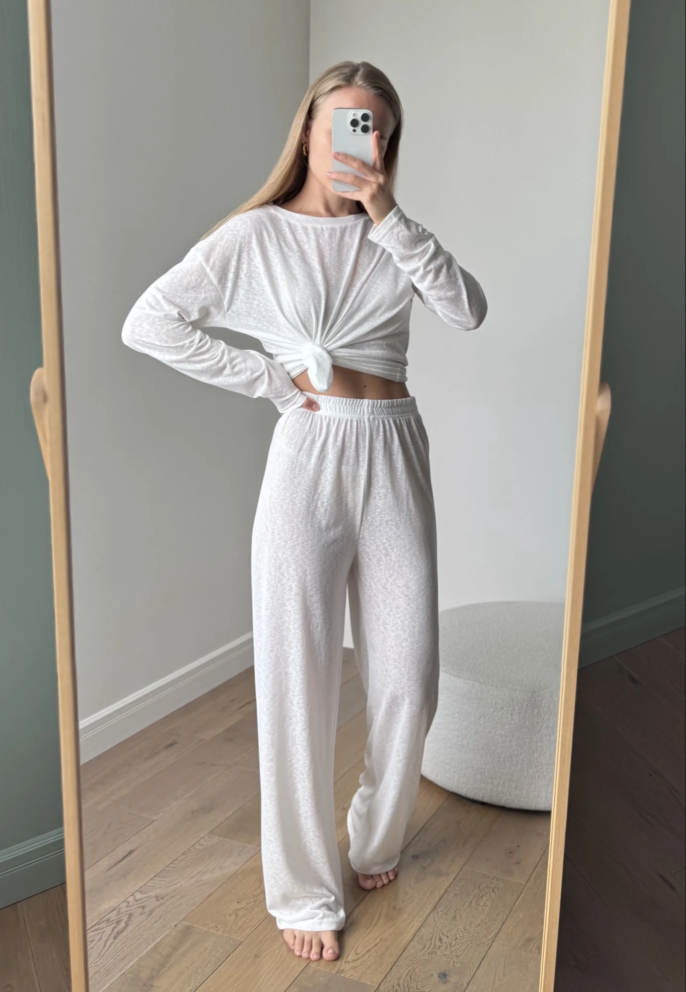 Полупрозрачный комплект из лонгслива и брюк. На свои параметры 80/63/94, рост 165 я взяла и верх, и низ в размере М. Комплект сел свободно, есть запас под большие параметры. В составе 30% вискозы и 70% полиэстера. Материал легкий и комфортный. Лонгслив и брюки продаются по отдельности.