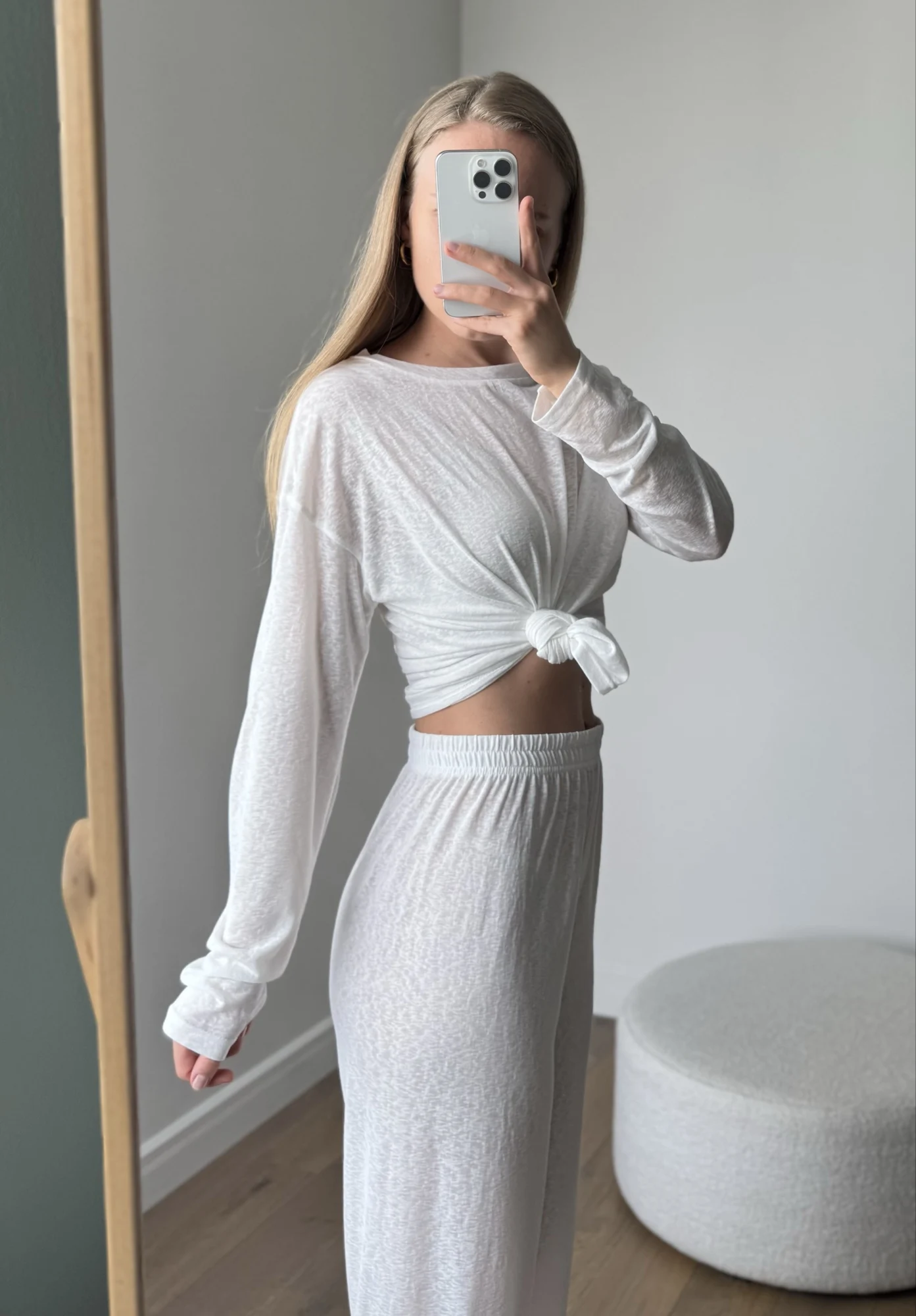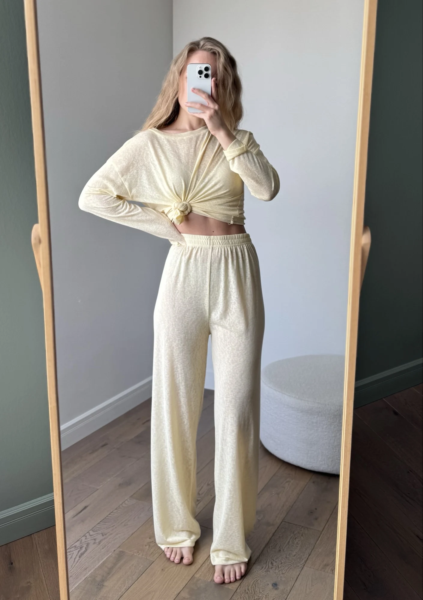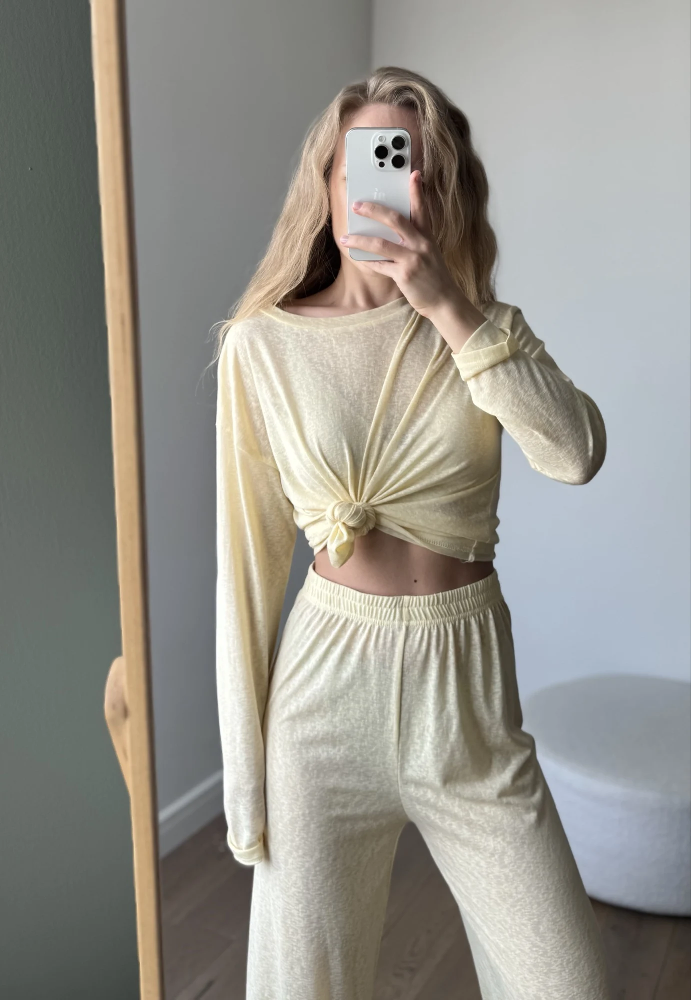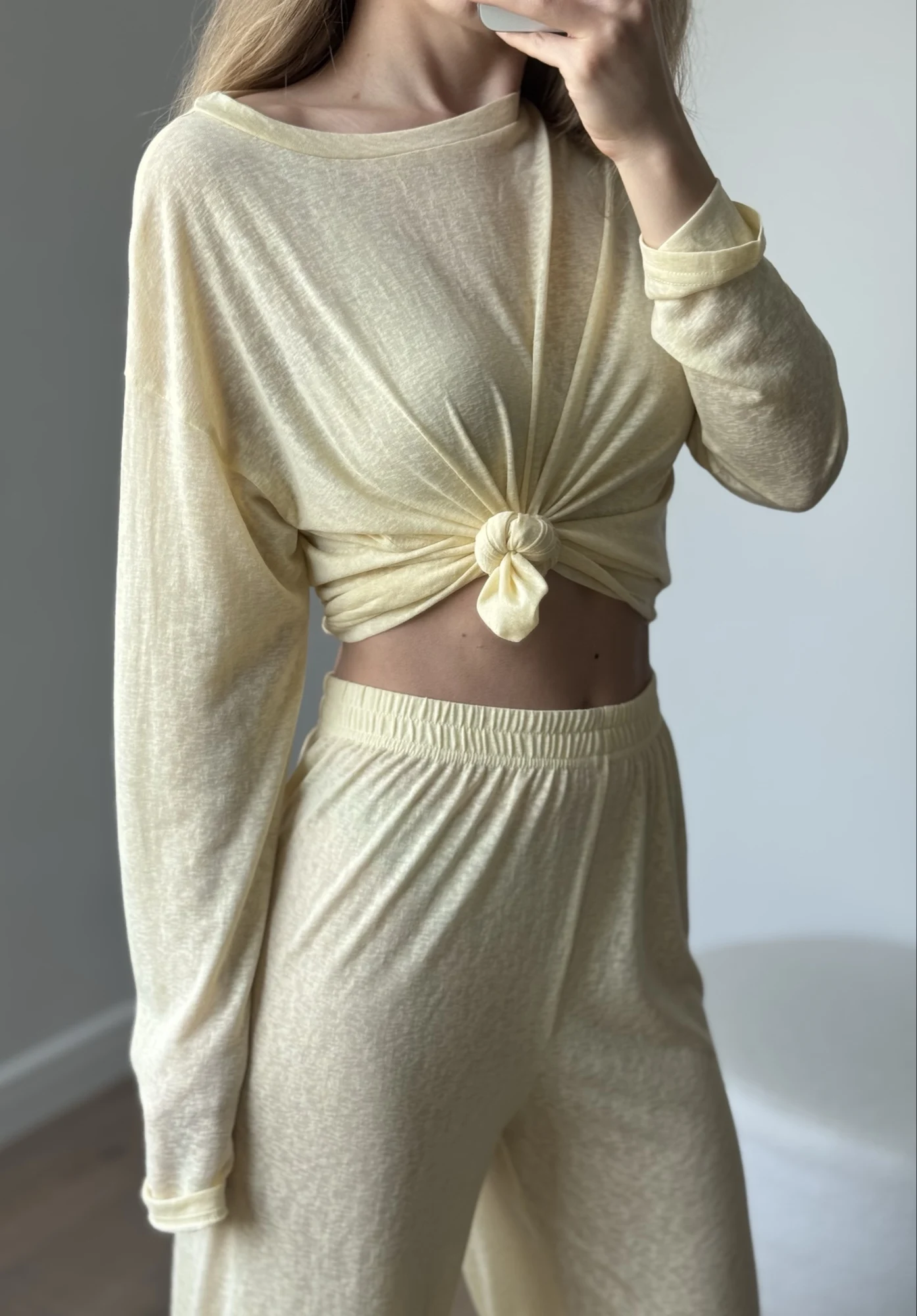 Полупрозрачный комплект из лонгслива и брюк. На свои параметры 80/63/94, рост 165 я взяла и верх, и низ в размере М. Комплект сел свободно, есть запас под большие параметры. В составе 30% вискозы и 70% полиэстера. Материал легкий и комфортный. Лонгслив и брюки продаются по отдельности.