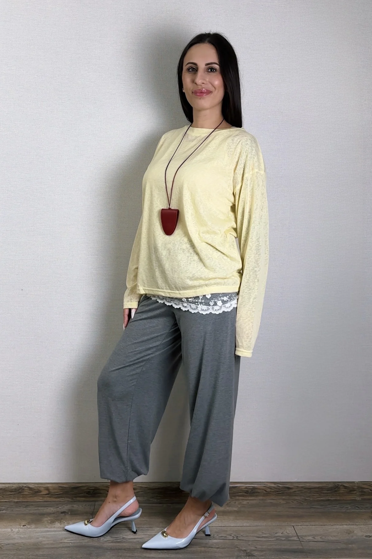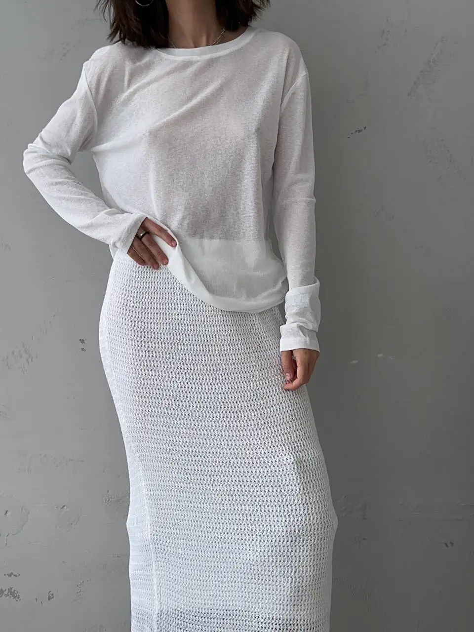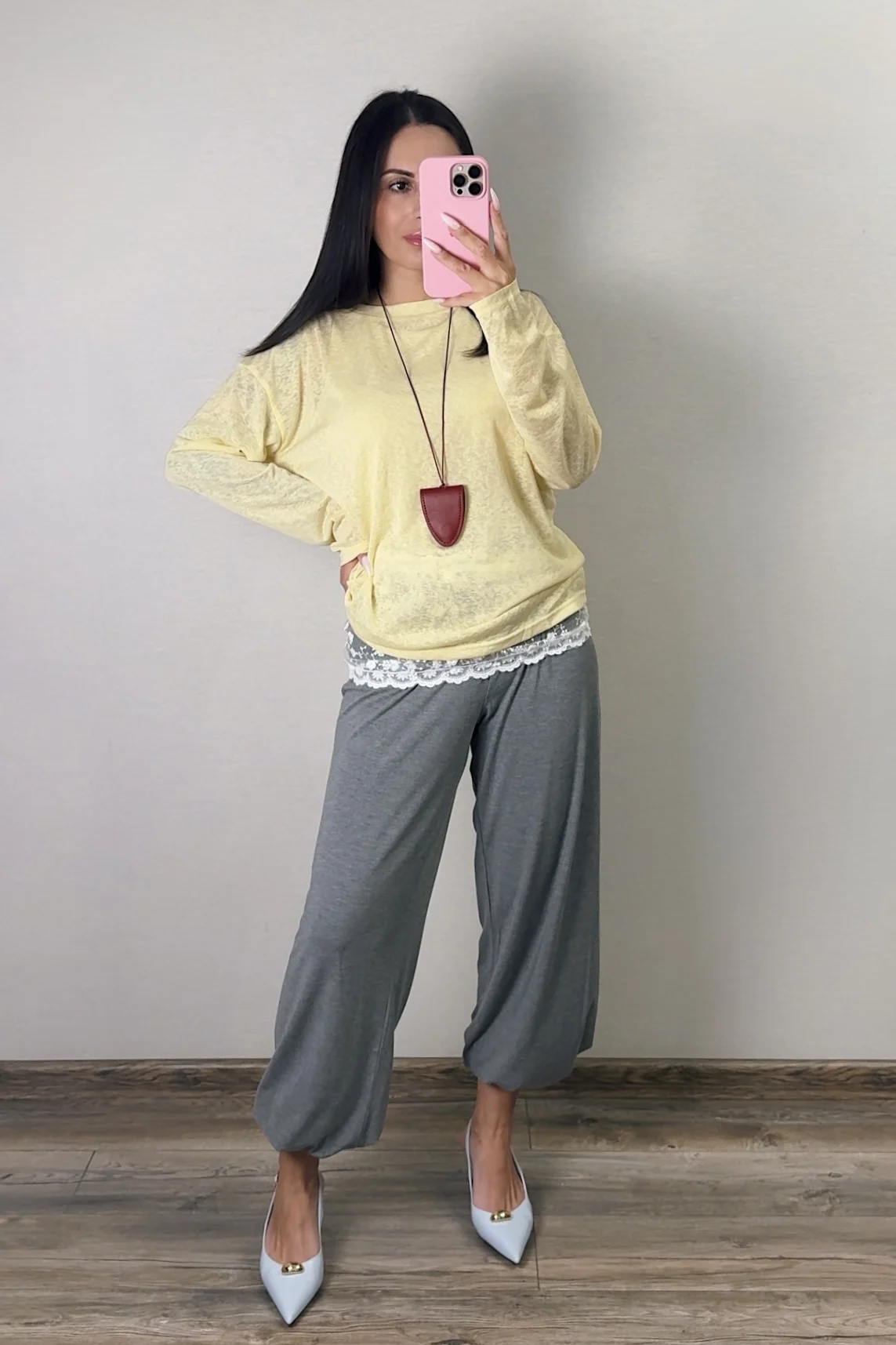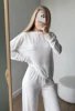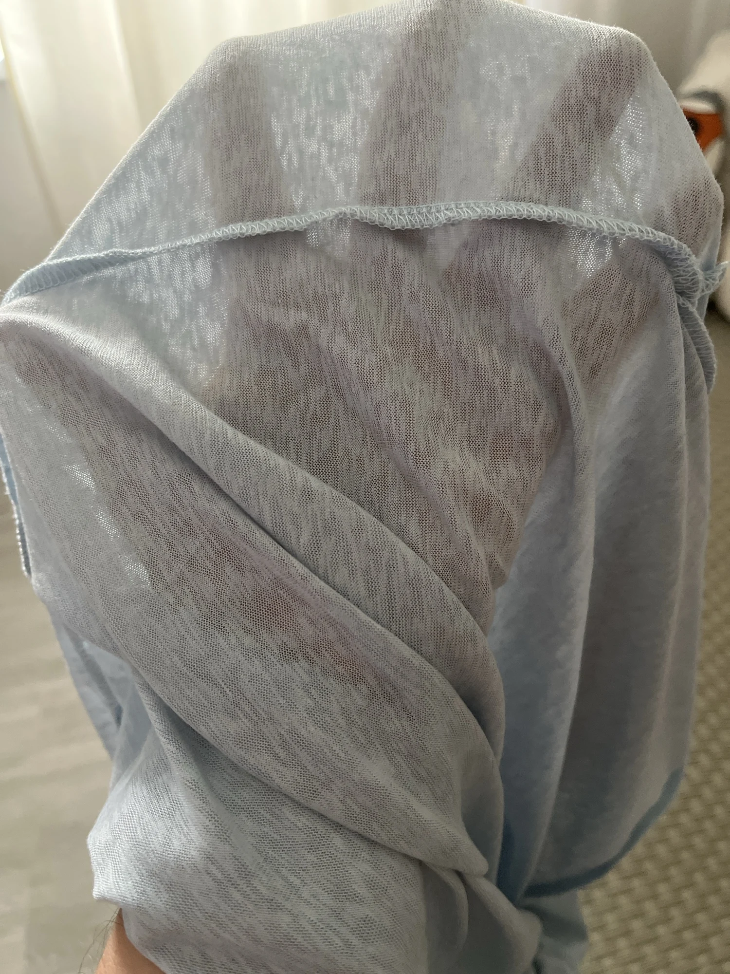 Полупрозрачный комплект из лонгслива и брюк. На свои параметры 80/63/94, рост 165 я взяла и верх, и низ в размере М. Комплект сел свободно, есть запас под большие параметры. В составе 30% вискозы и 70% полиэстера. Материал легкий и комфортный. Лонгслив и брюки продаются по отдельности.