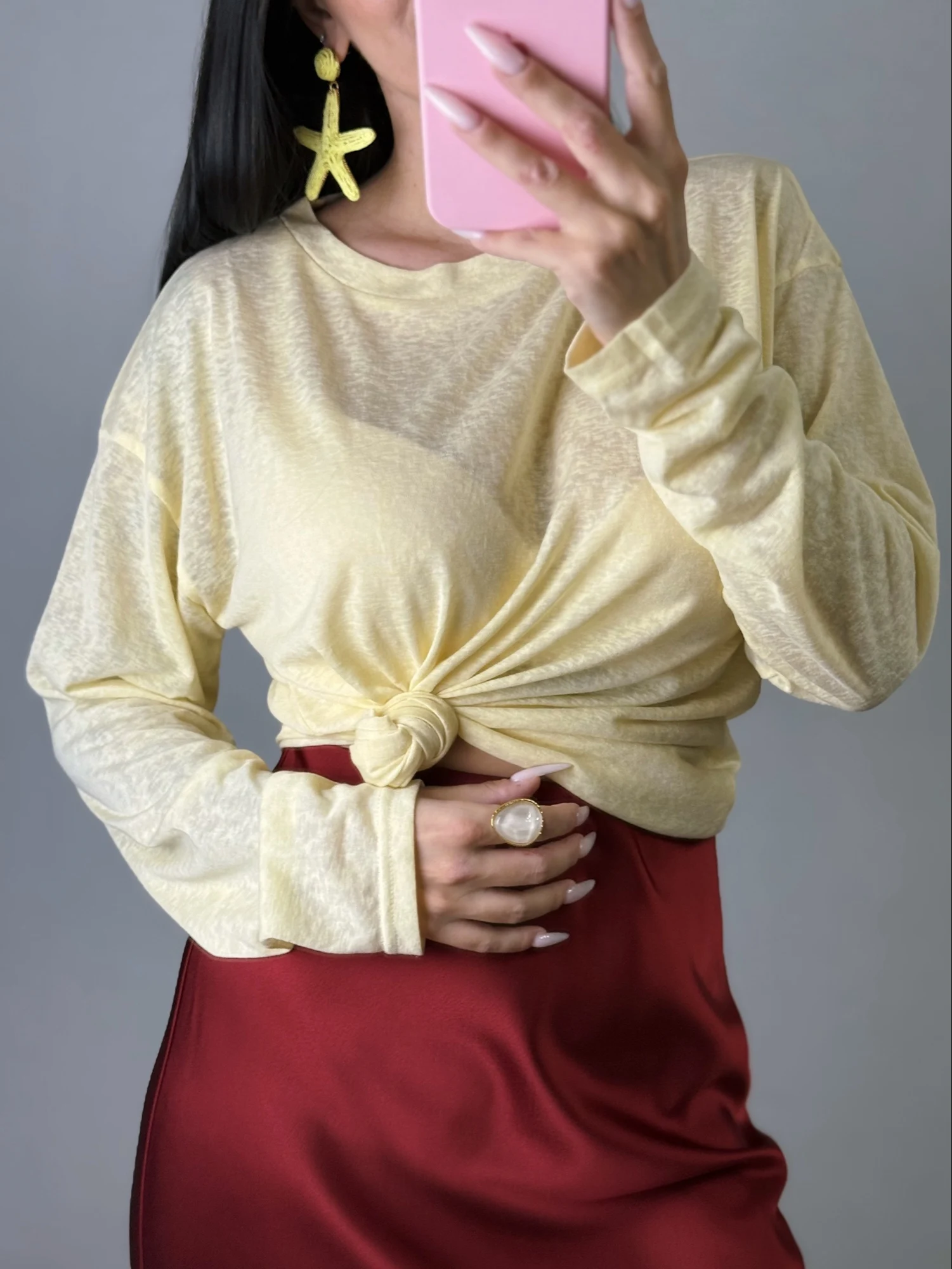 Прекрасный полупрозрачный лонгслив в нежно-желтом оттенке Совершенно легкий и не ощущается на теле, материал тоненький. Цвет в крапинку. Состав: 70% полиэстер, 30% вискоза. Не смотря на это, не жаркий. Это базовая вещь, которая легко сочетается фактически со всеми низами. Особенно мне нравится такие Лонги носить слоями и подворачивать в узелок. Ссылки на все вещи, которые я использую в образах, публикую у себя на kанале. Так что буду Рада, если присоединитесь к моему дружелюбному женскому комьюнити. Каждый день новые и интересные посты. На рост 158, параметры 94-69-92 заказала размер М. Сел свободно, и S-ка была бы хорошо. Но если взять меньший размер, то как раз -таки можно носить слоями , например белый под низ.