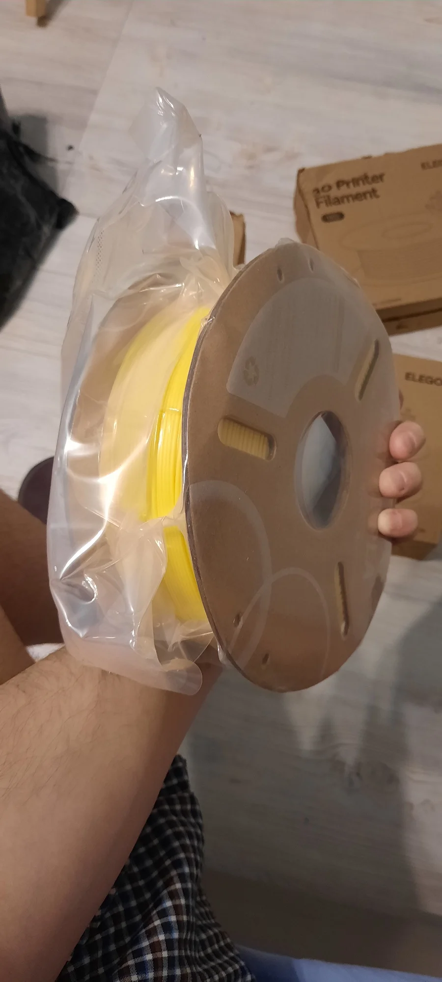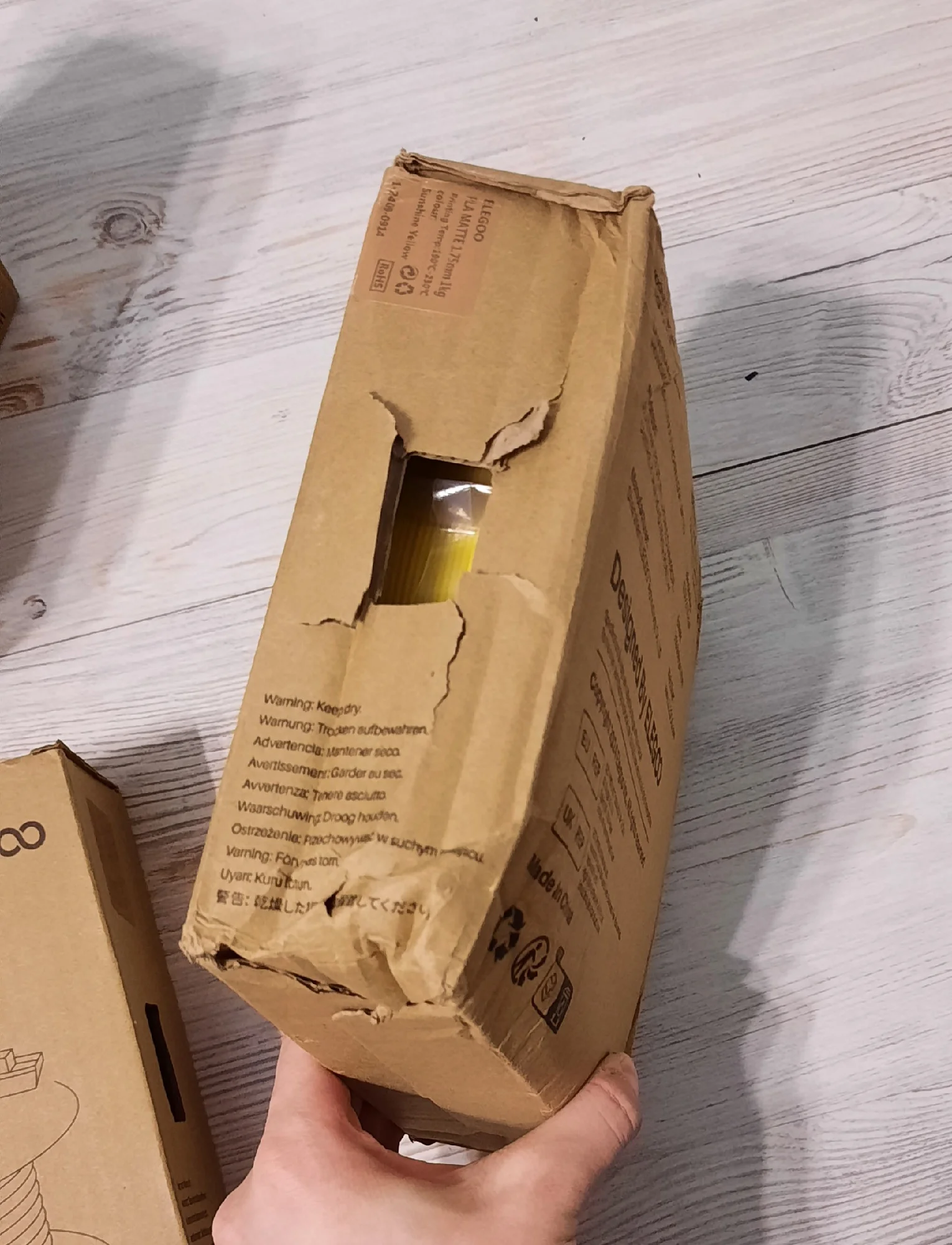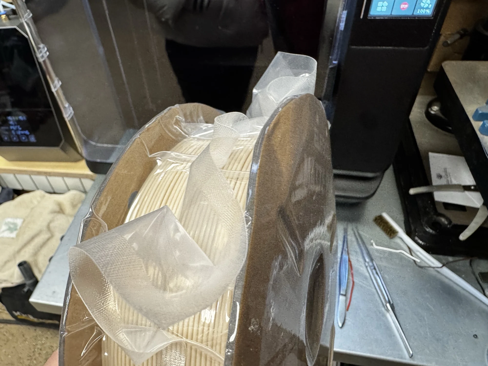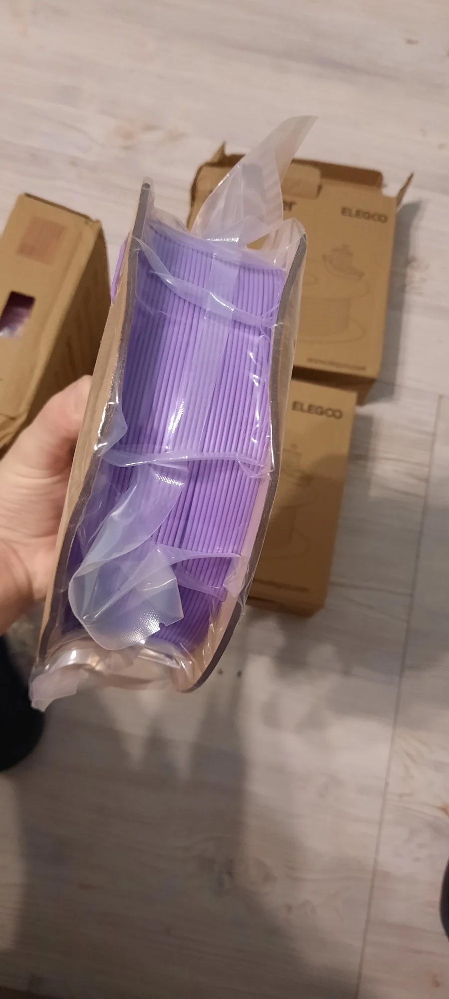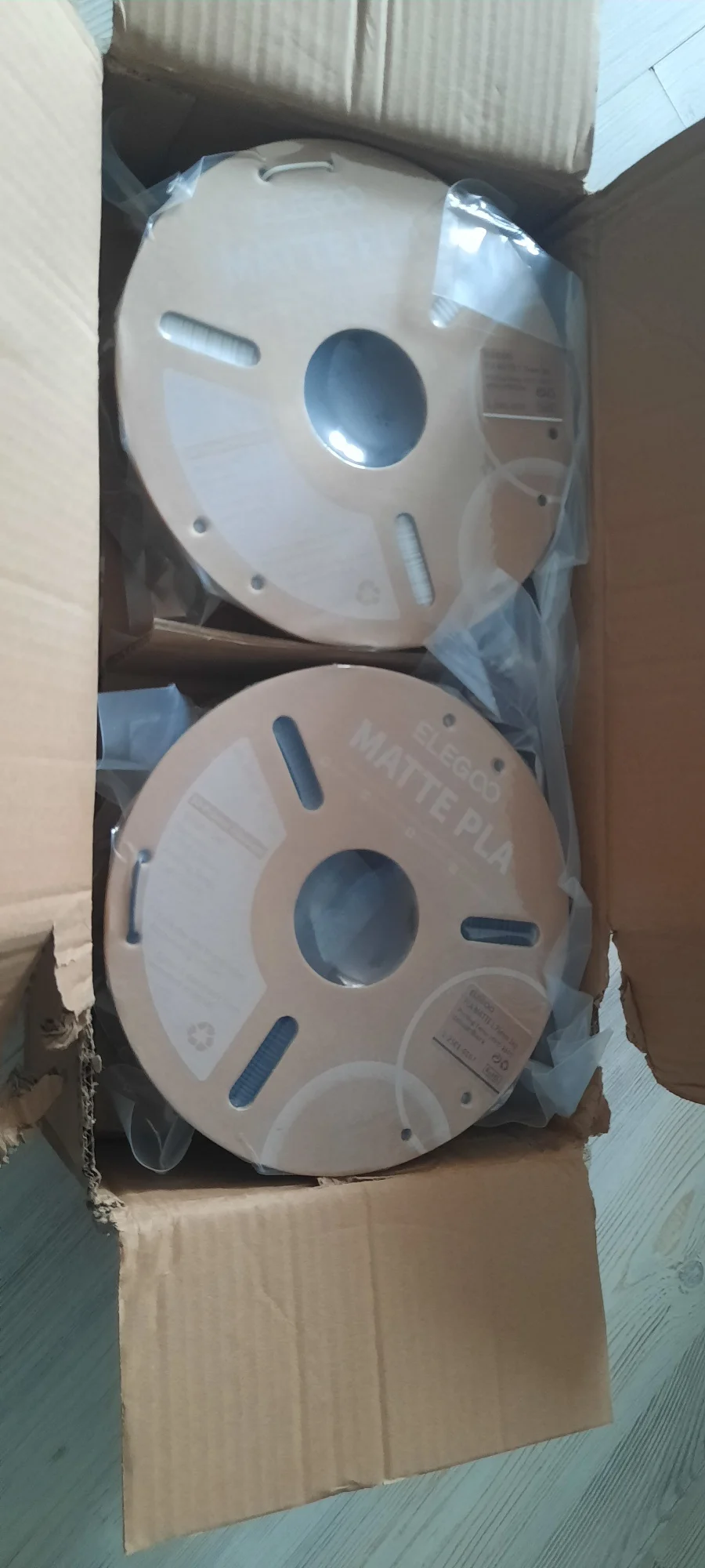 Пластик хороший, матовый, даже не смотря на то, что гермитичность одного из пакетов была нарушена, печать идёт хорошо даже без сушки. В этот раз порадовало то, что теперь катушки упакованы в коробку, в прошлый раз заказ был просто в чёрном пакете обратный скотчем, соответственно при доставке пострадал сильнее чем в этот раз, катушки практически не помяты. Коробка была слегка вскрыта.