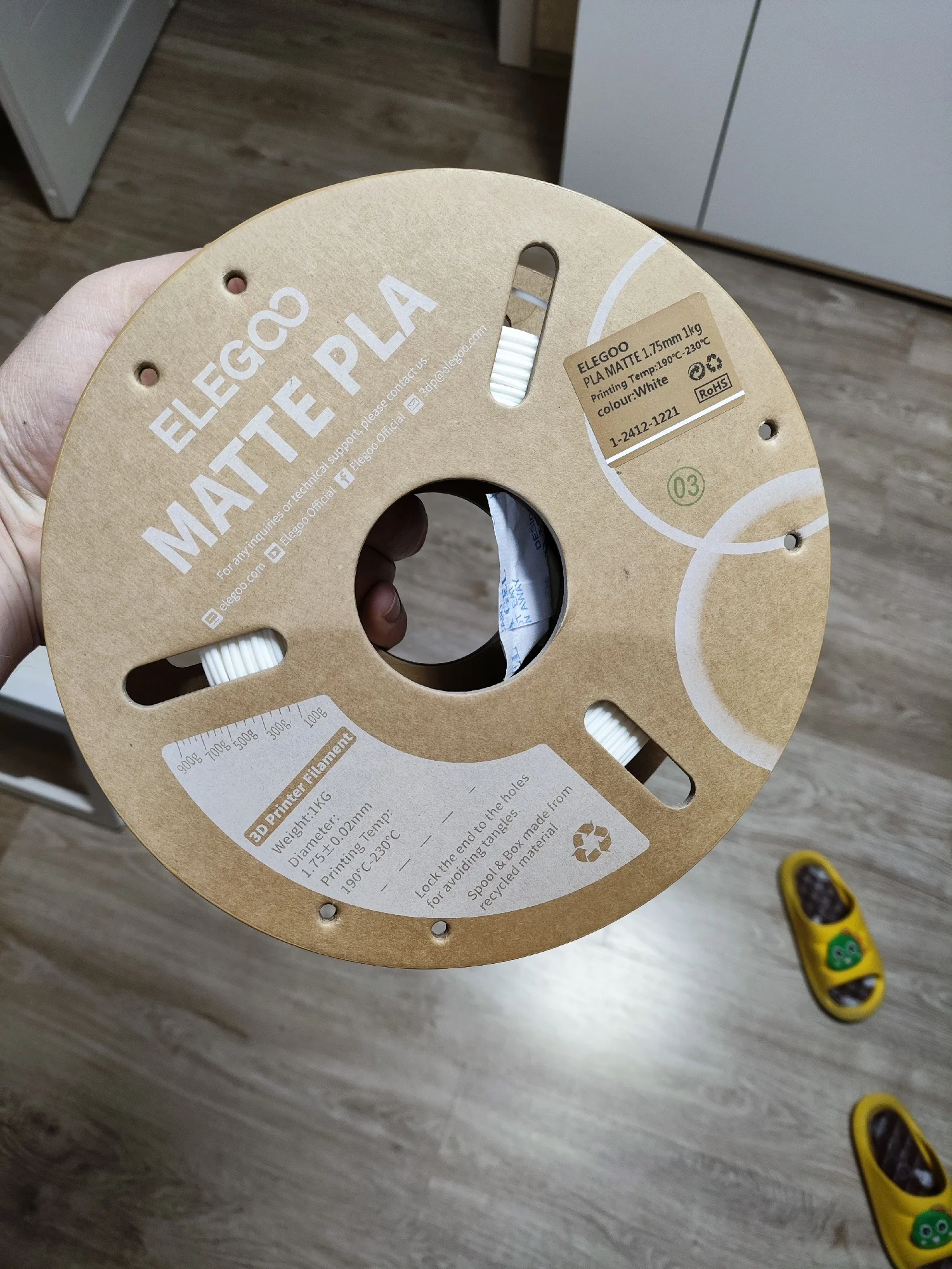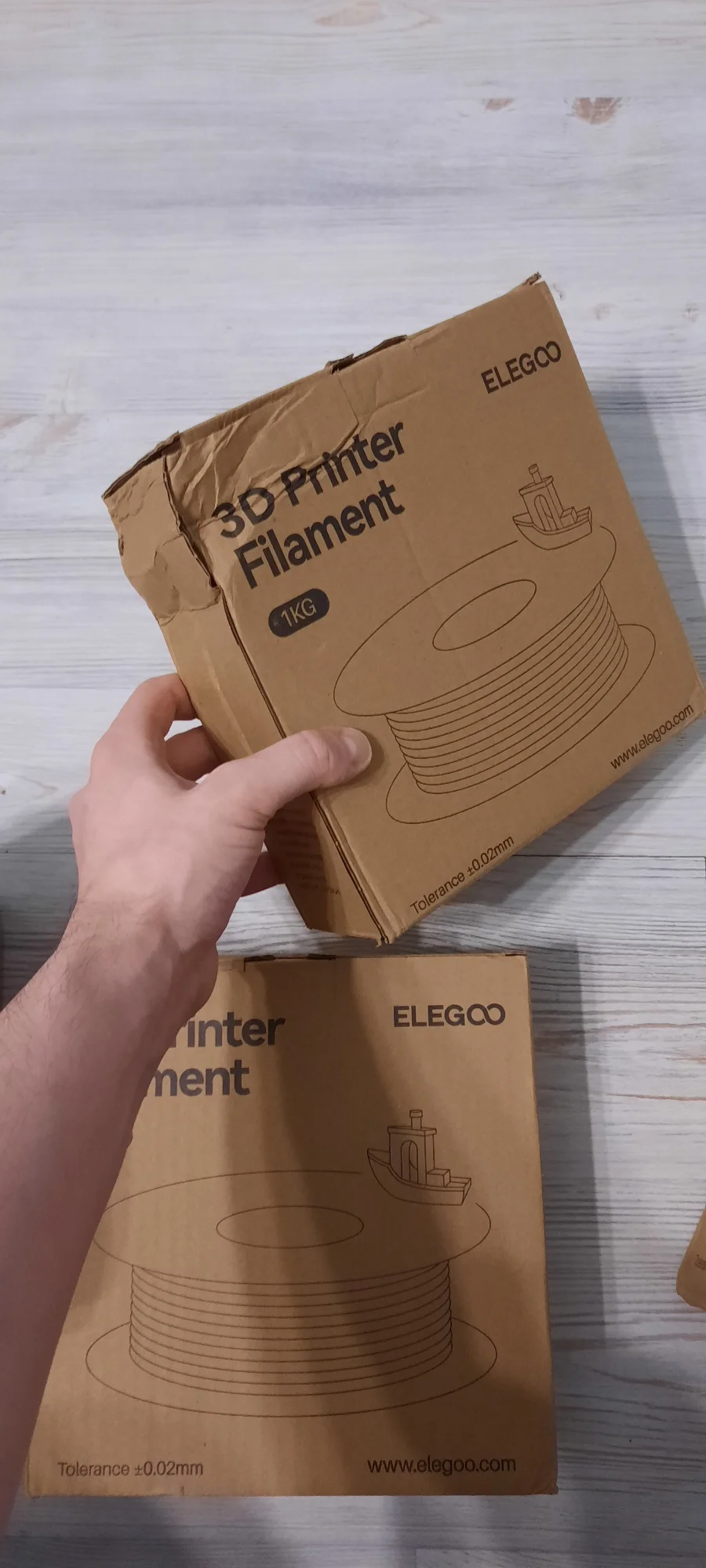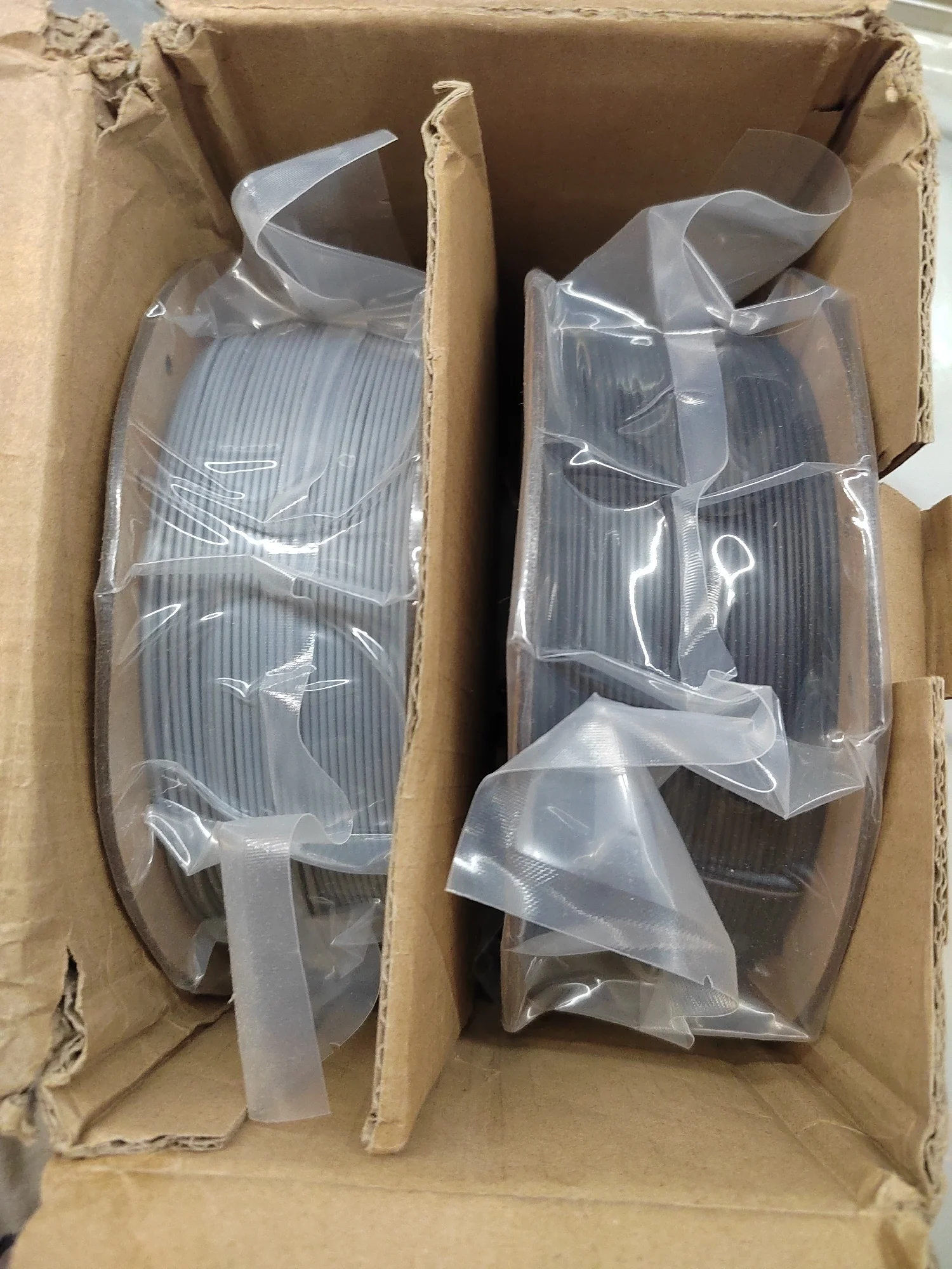 заказал два белых - пришел серый и чёрный. Не заказывайте такие пачки - пересорт. На коробке нет опознавательных наклеек о цвете. Скорее всего покупка такой коробки с двумя катушками - рандом. Решил попробовать взять в такой коробке и вот тебе презент на новый год. Так что не заказывайте такой "комбо". Стандартные коробки приходят с заказанными цветами - все отлично. Этот пластик потом куда нибудь использую. А белый придется заказывать по одной коробке.