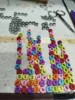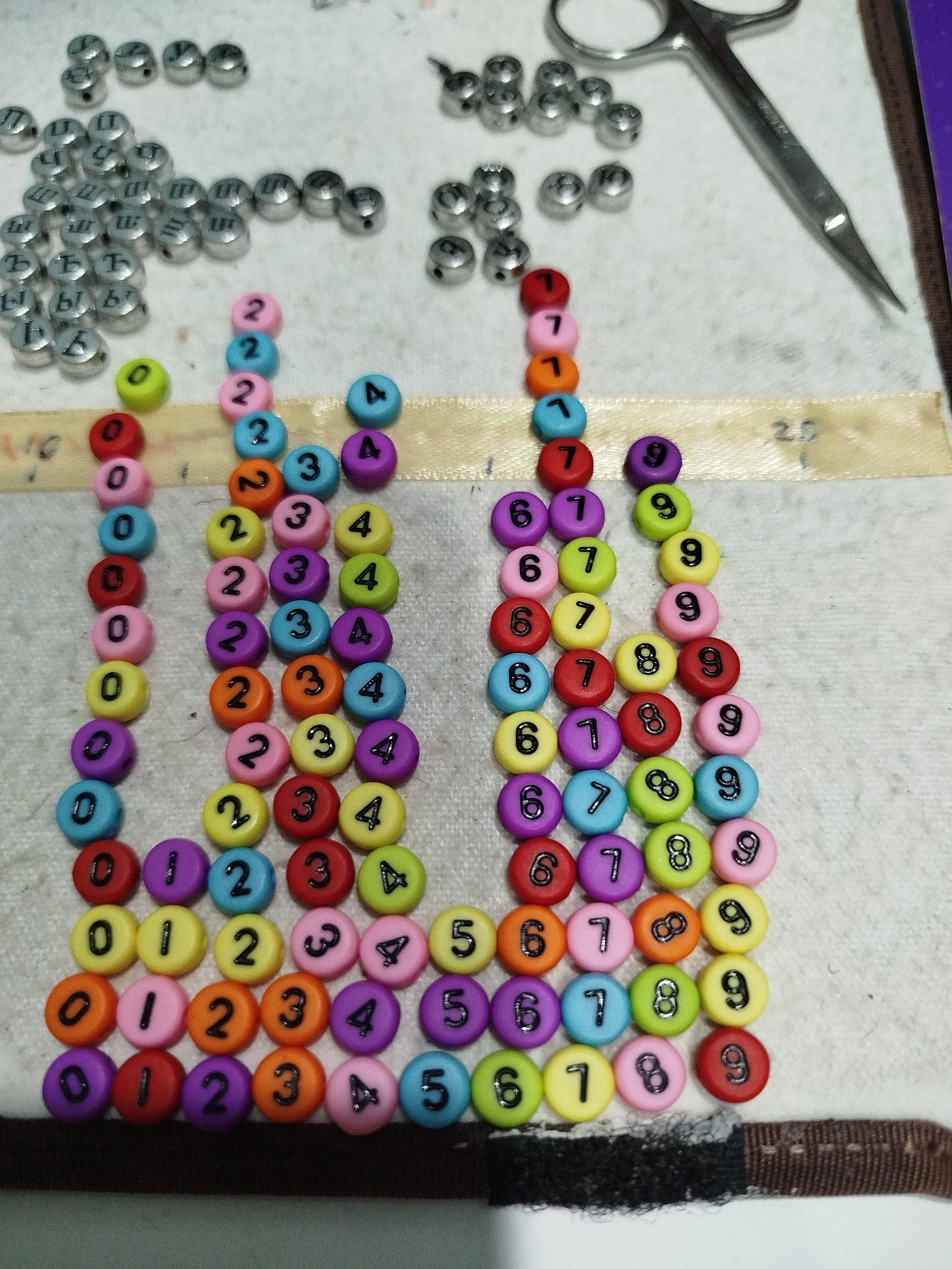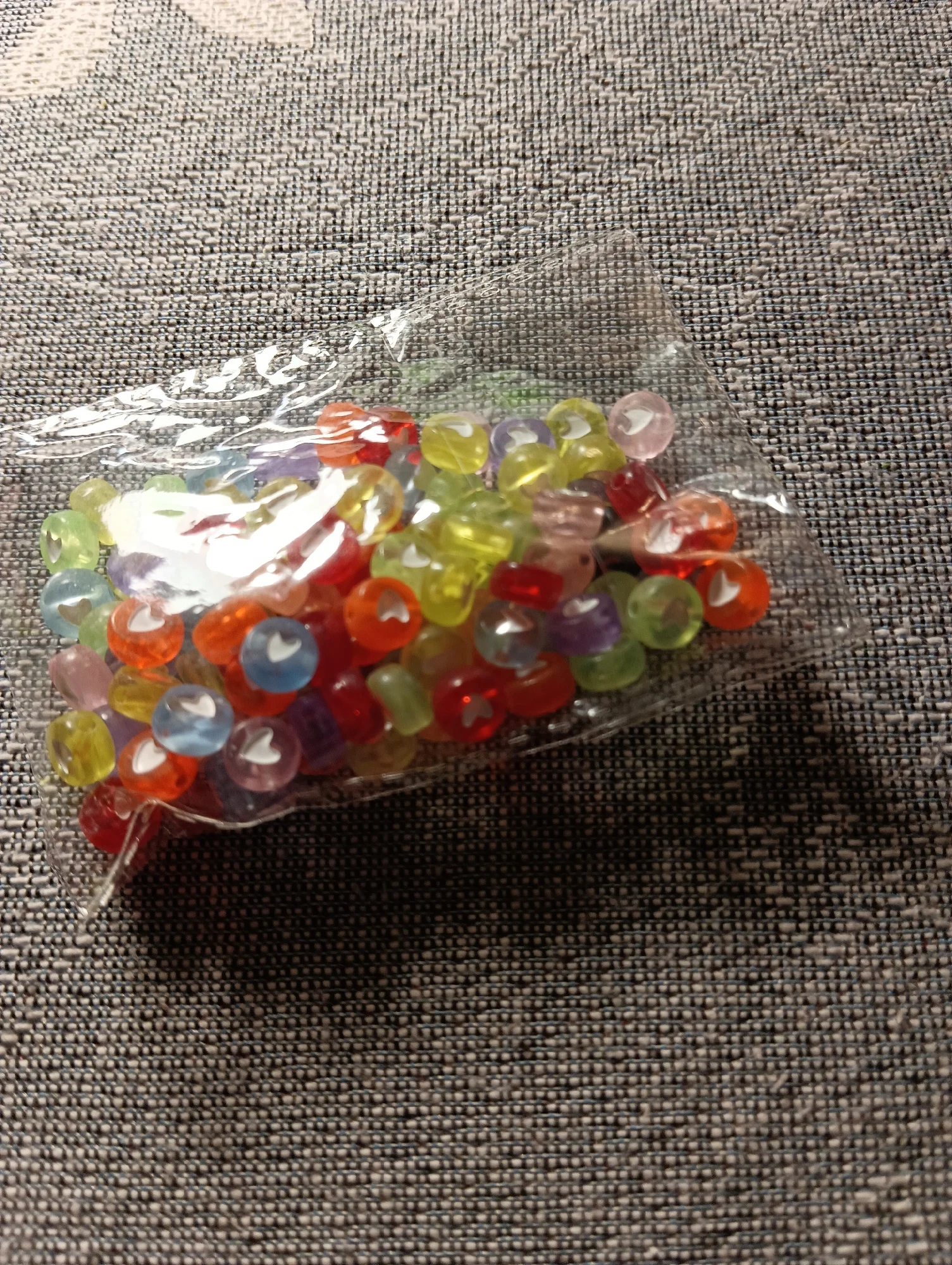 В одном из пакетиков ровно 100 бусин +одна буква, во втором - 101 бусина) Всего 7 цветов.