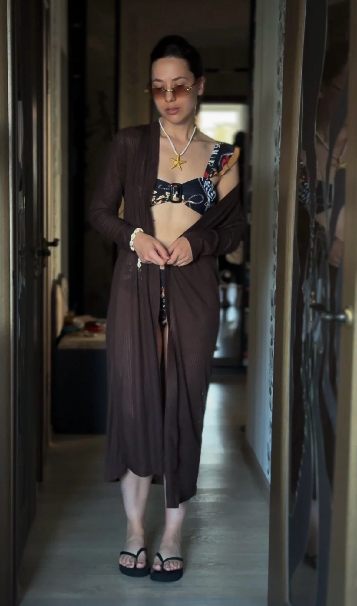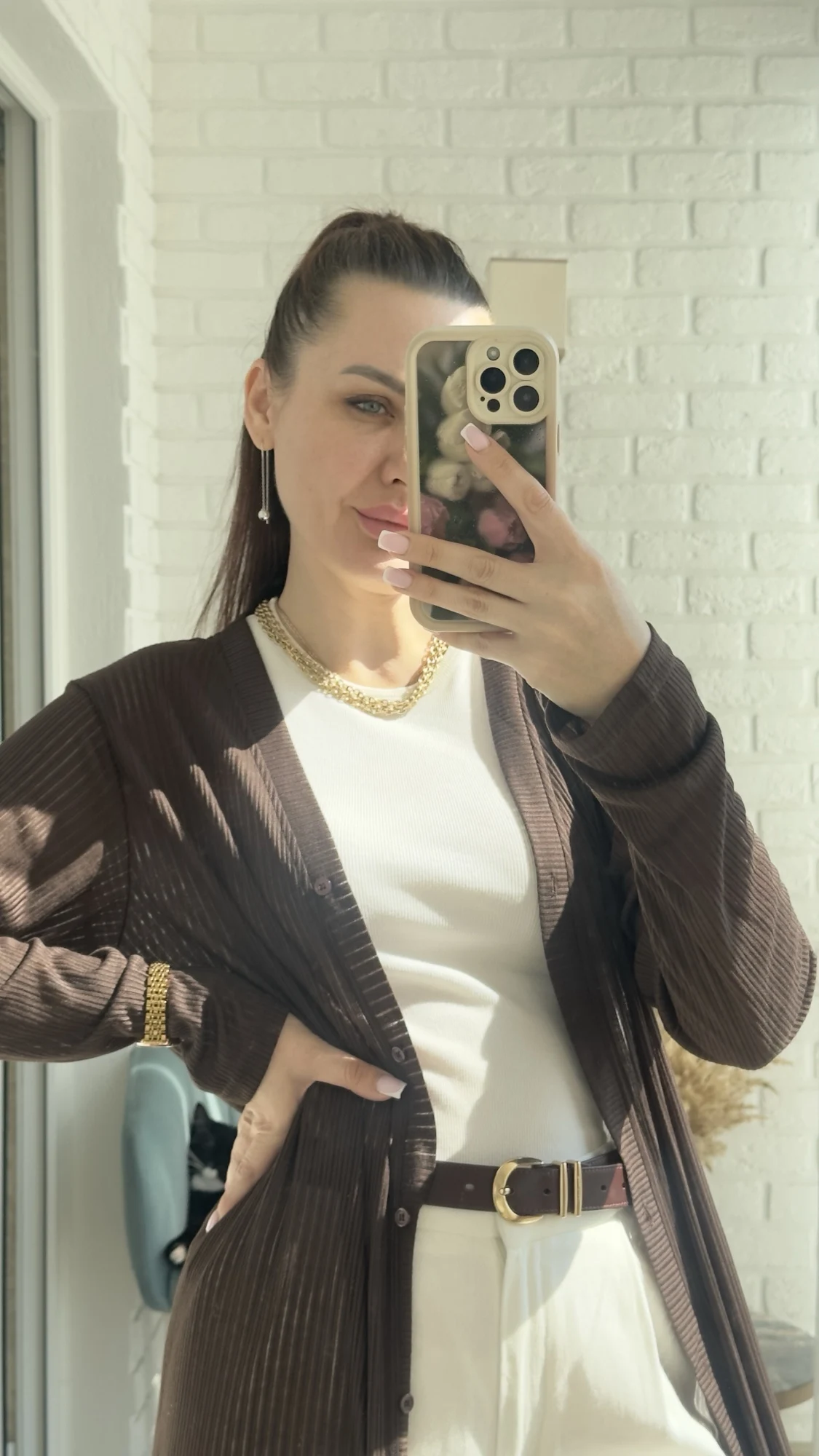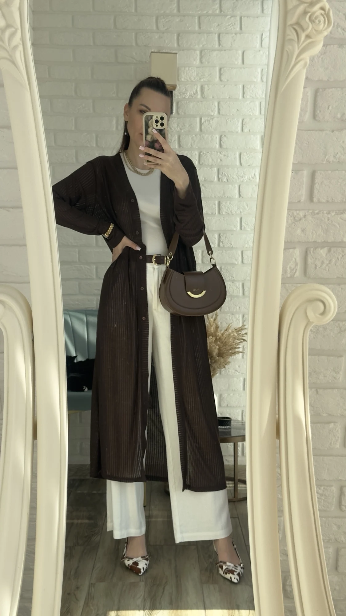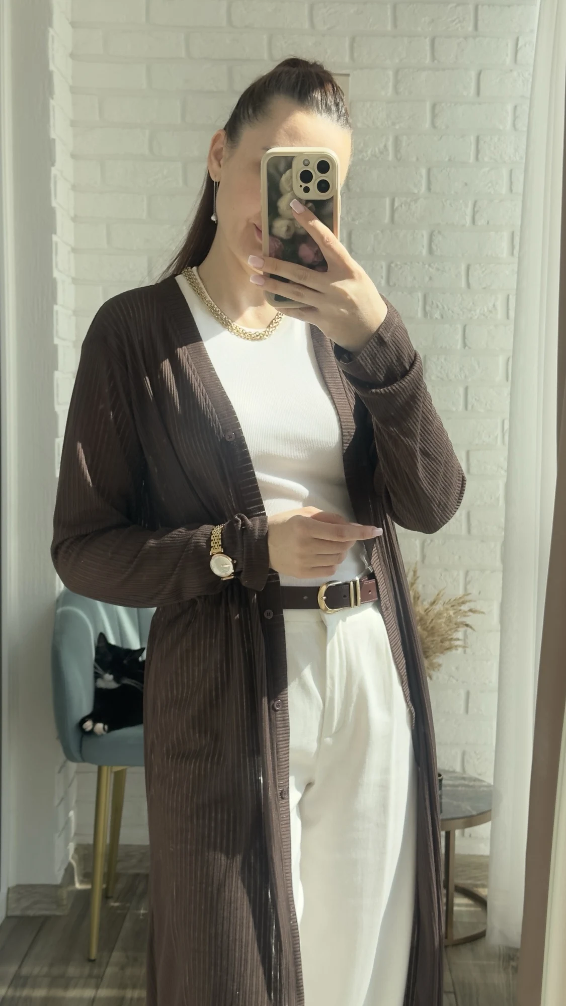 Больше обзоров и находок на моём канале Невесомое стильное дополнение к вечернему летнему образу Мне дико понравился и уже пару вечеров я с ним не расстаюсь, хоть и совсем недавно получила На свои параметры 86-57-86 см и рост 165 см я взяла кардиган в размере S На выбор у продавца три расцветки и, по сути, все базовые Мой вариант - шоколадный Приходит кардиган с бирками бренда + имеется запасная пуговка Материал - пэ-шка, тактильно очень мягкая и приятная на ощупь Шикарная текстура а-ля рубчик + полупрозрачность - вкупе смотрится интересно и неординарно Кардиган сразу вносит определённый "изюм" даже в самый обыденный аутфит На мой рост 165 см длина - миди Размер - полноценная S-ка, посадка свободная Моно по-разному его закалывать брошами, обыгрывать поясами и платками А можно использовать в качестве пляжной накидки в отпуске Вещь самобытная и при этом многофункциональная А исполнение, как всегда у этого бренда, на высоте Качество -ТОП Рекомендую к покупке❤️