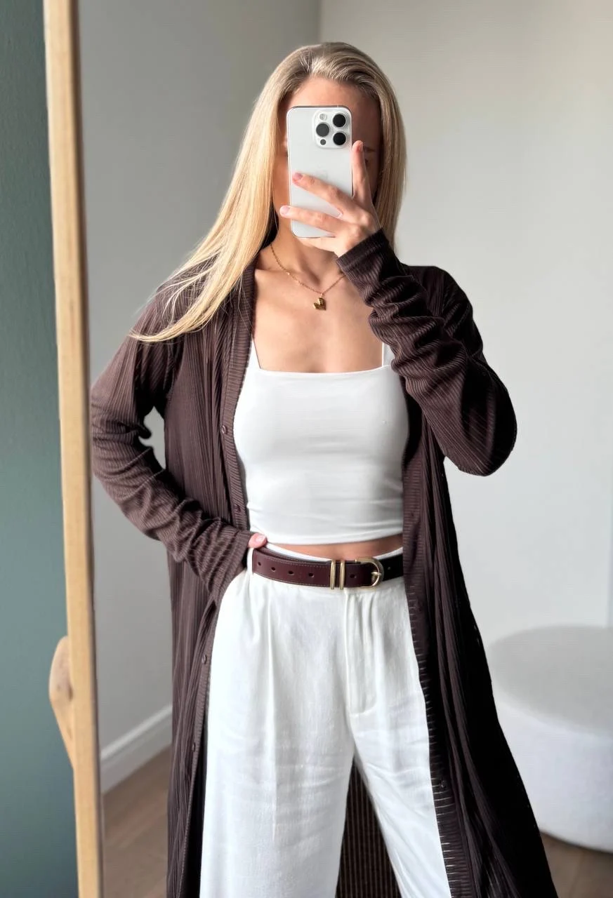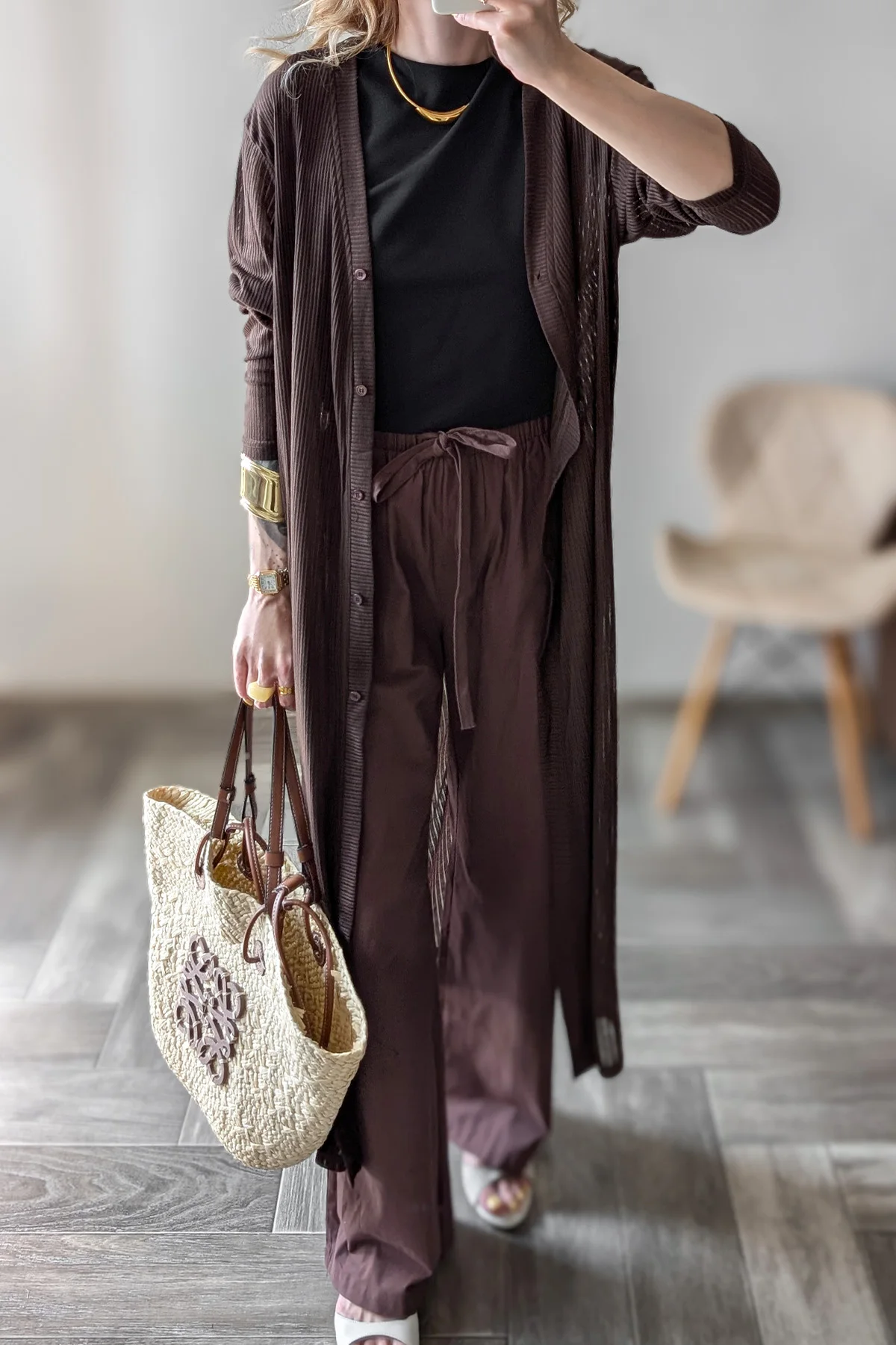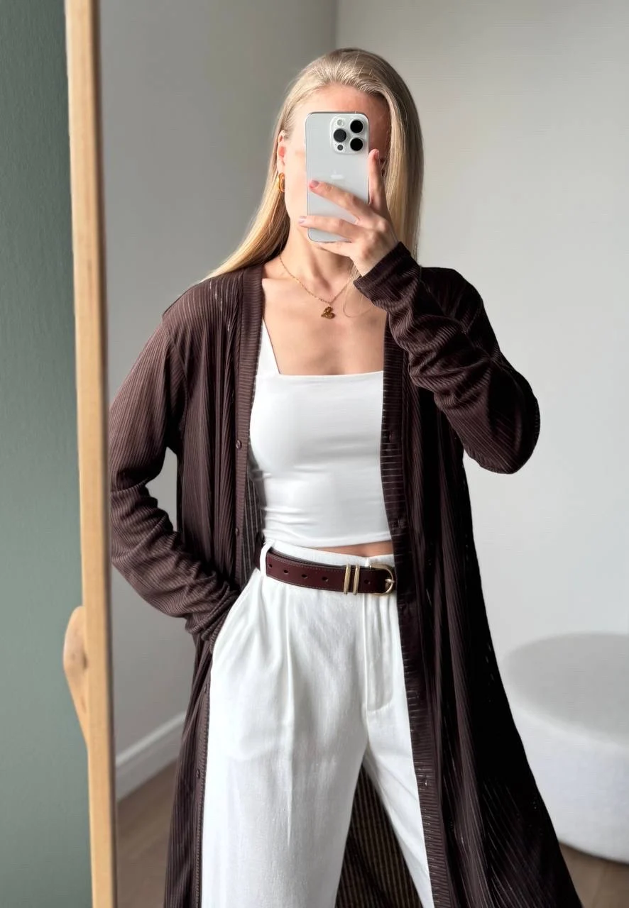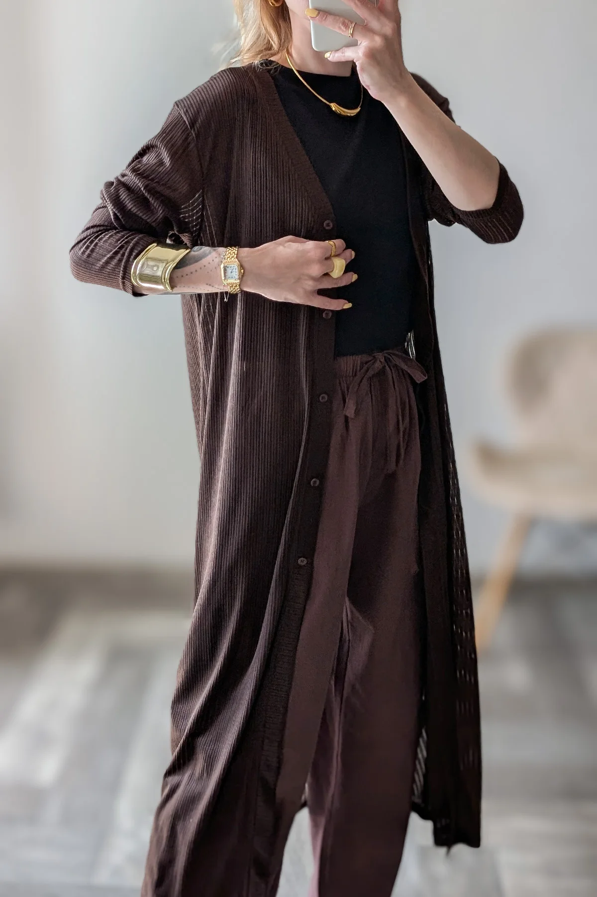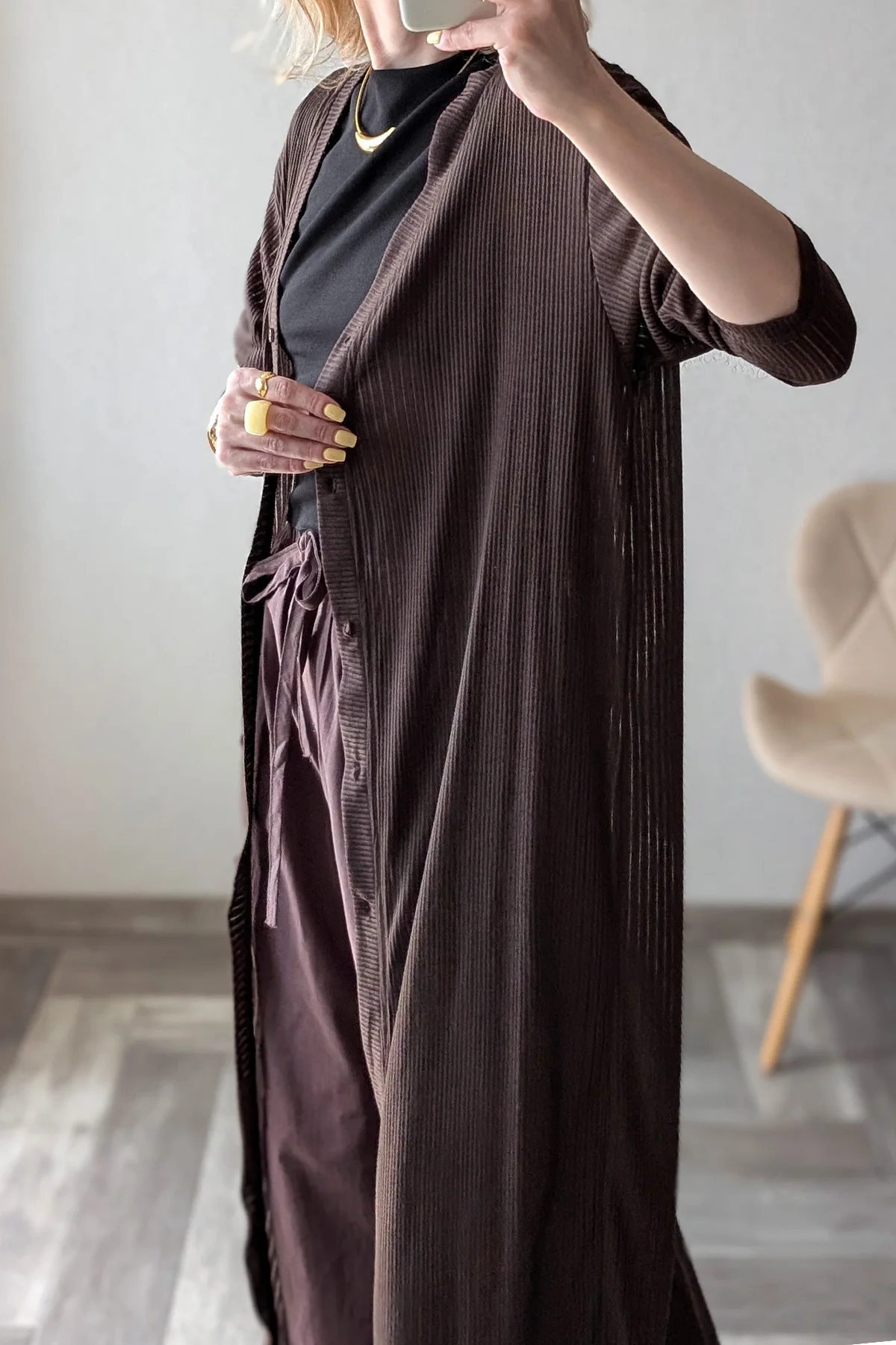 Больше обзоров и находок на моём канале Невесомое стильное дополнение к вечернему летнему образу Мне дико понравился и уже пару вечеров я с ним не расстаюсь, хоть и совсем недавно получила На свои параметры 86-57-86 см и рост 165 см я взяла кардиган в размере S На выбор у продавца три расцветки и, по сути, все базовые Мой вариант - шоколадный Приходит кардиган с бирками бренда + имеется запасная пуговка Материал - пэ-шка, тактильно очень мягкая и приятная на ощупь Шикарная текстура а-ля рубчик + полупрозрачность - вкупе смотрится интересно и неординарно Кардиган сразу вносит определённый "изюм" даже в самый обыденный аутфит На мой рост 165 см длина - миди Размер - полноценная S-ка, посадка свободная Моно по-разному его закалывать брошами, обыгрывать поясами и платками А можно использовать в качестве пляжной накидки в отпуске Вещь самобытная и при этом многофункциональная А исполнение, как всегда у этого бренда, на высоте Качество -ТОП Рекомендую к покупке❤️