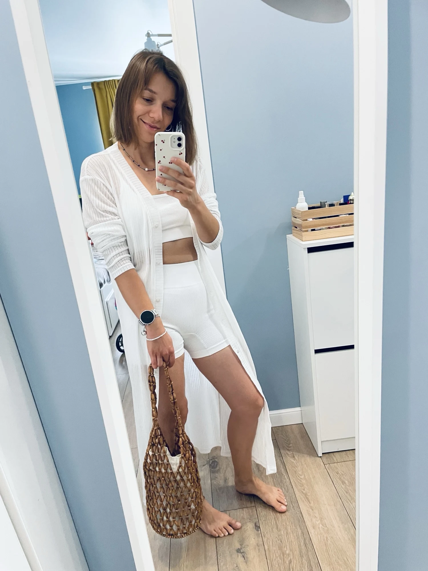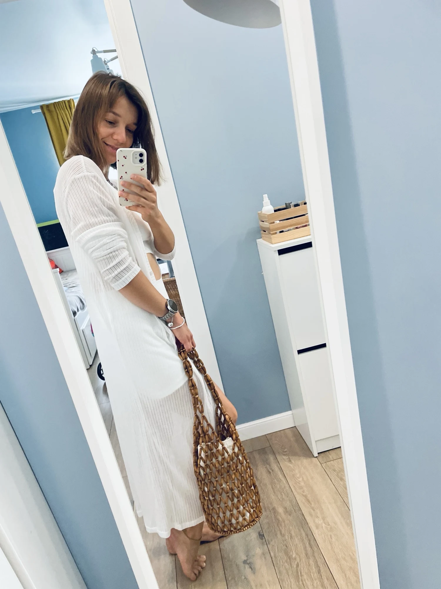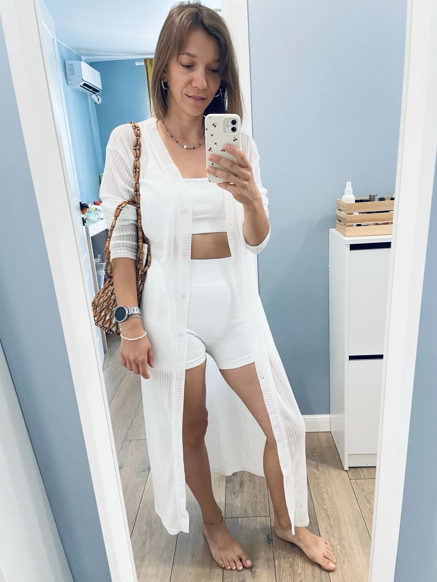Очень классная находка на лето. Невесомый кардиган, у меня в белом цвете и размер L. Обычно я ношу размер S, но такие вещи люблю покупать на пару размеров больше, чтобы сидели более свободно. На пляже такая вещь просто незаменима, спасает от нежелательного загара. Мой рост 165 , кардиган сел отлично.