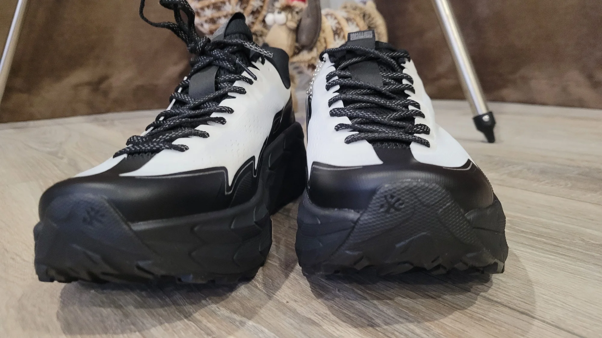 первые мои bmai. вопреки рекомендациям взял на размер побольше (все кроссовки беру 9.5us). да, они реально большемерят. может из-за этого слегка натирает большой палец снаружи. в остальном супер, пена класс, протектор липкий на мокром асфальте и льду, цепкий по грунту. фото после 20км по городской грязи. ну пропиткой обработал конечно перед.