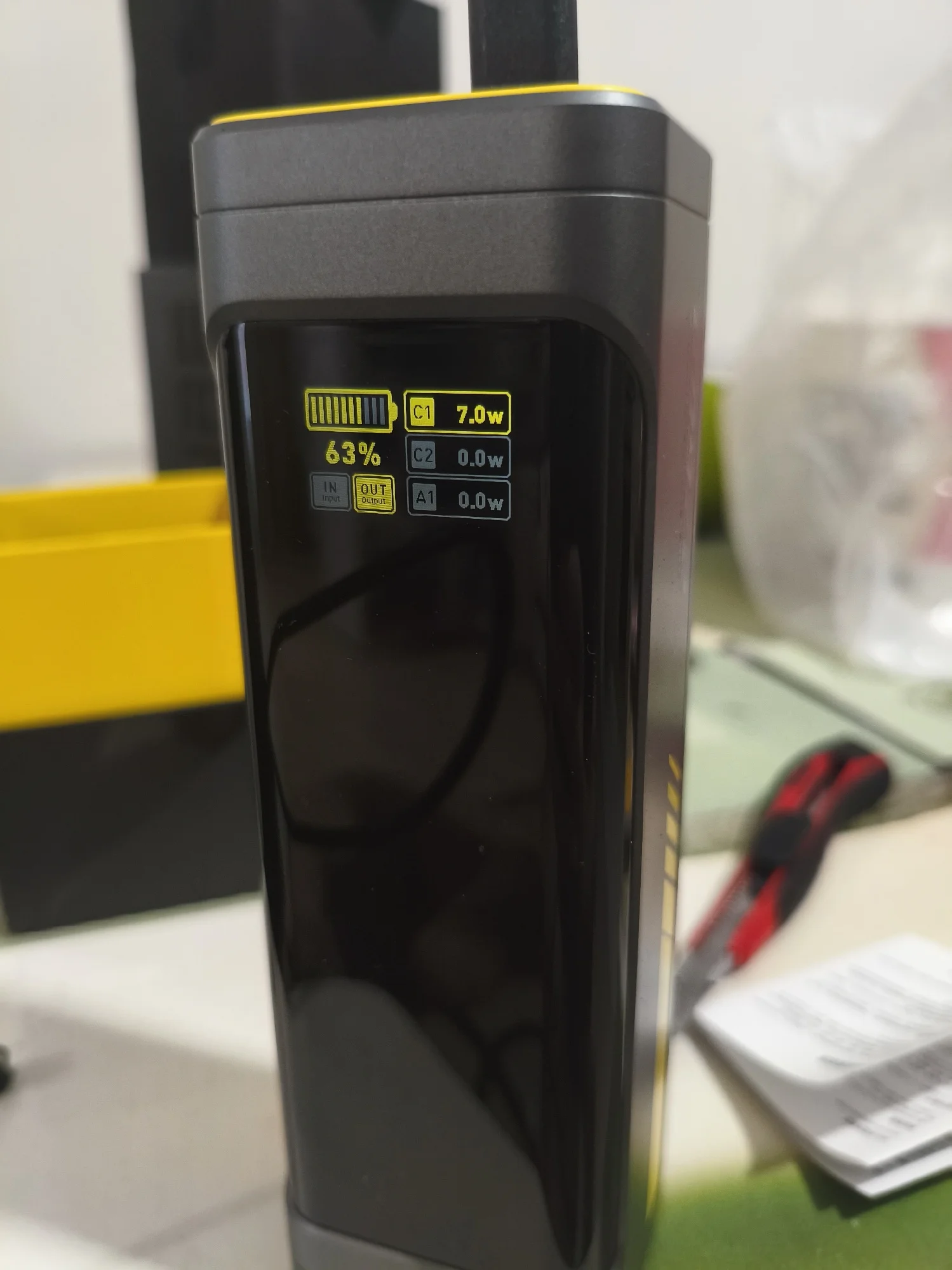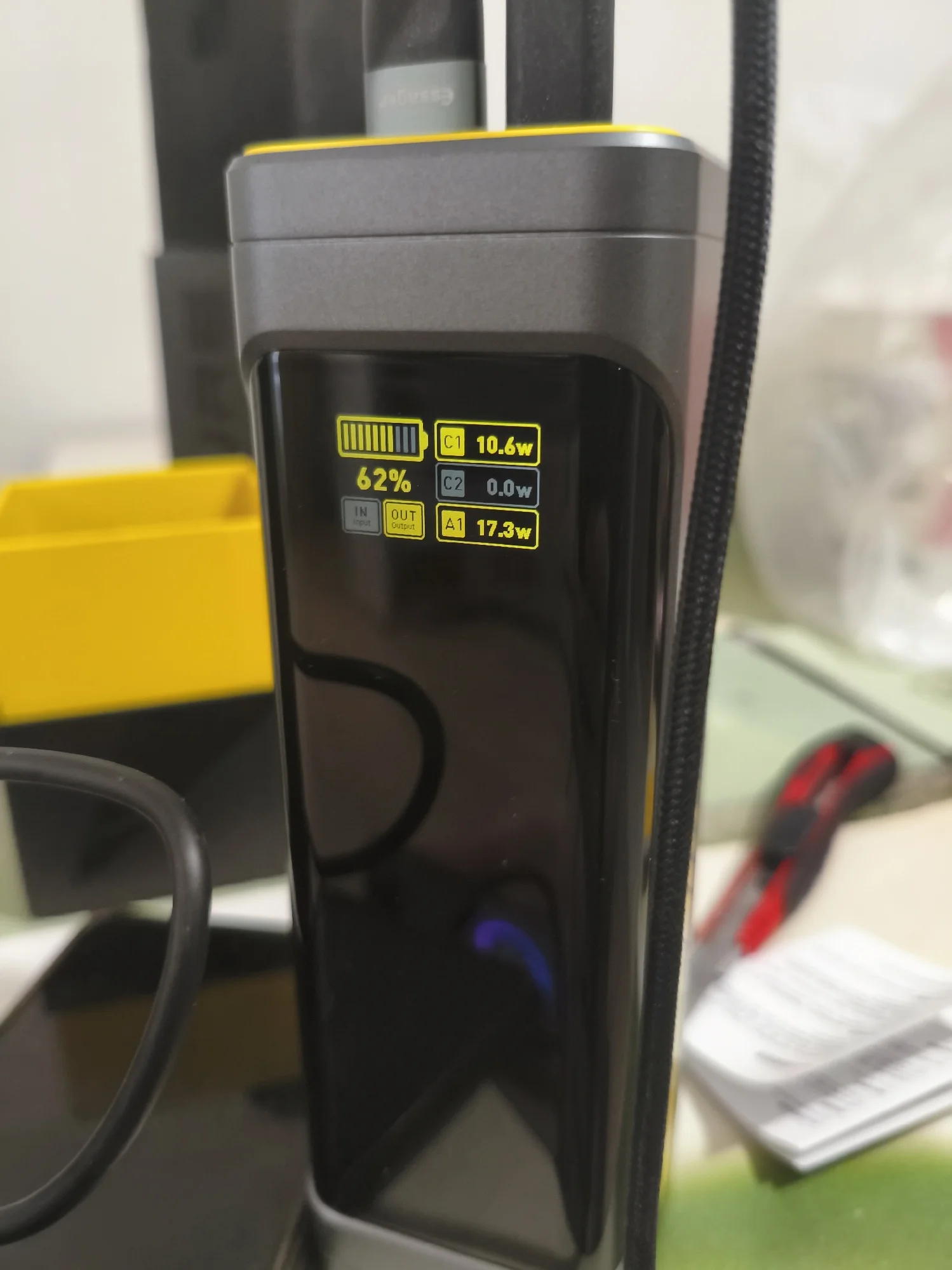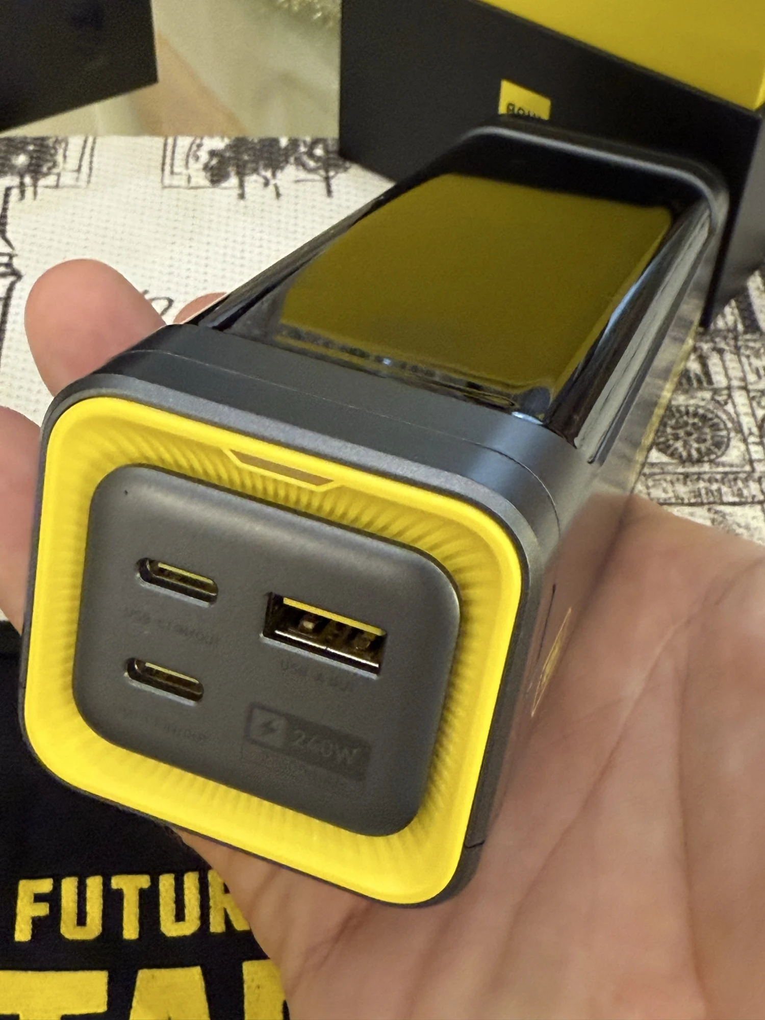 Для тех, кто любит хорошие вещи. Упаковка, комплектация удивили в хорошем смысле слова. Заряжен до 55%, в комплекте шнур 140вт, проверил PD3.1, 28в на выходе, паяльник TS101 взял 90вт. На зарядку от GaN блока взял первоначально 100вт, затем по мере увеличения уровня зарядки плавно уменьшается. Рекомендую! Спасибо продавцу!
