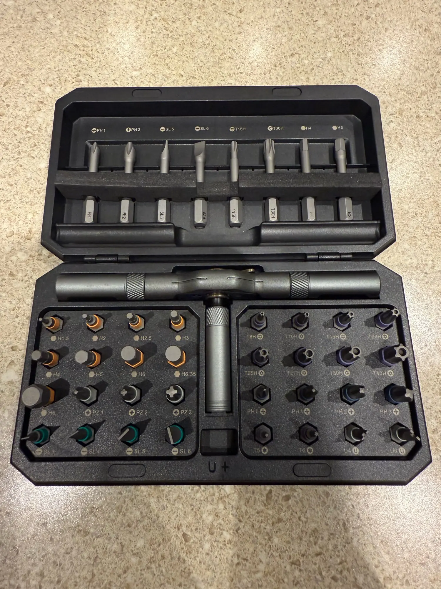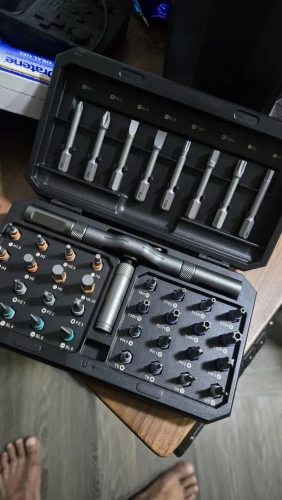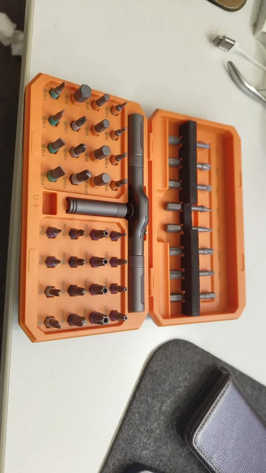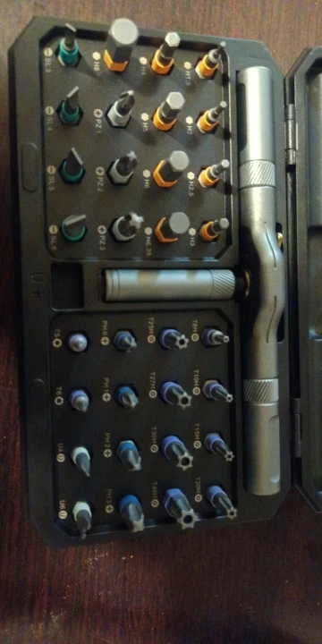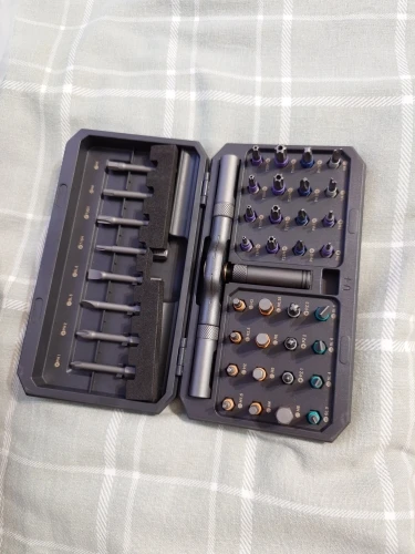 Набор отверток 42-в-1 : оснащен 40 магнитными насадками из хромомолибденовой легированной стали S2, каждый из которых имеет диаметр 6.35 мм (1/4 дюйма), включая 32 коротких бита (25 мм), бит PH (4), бит SL (4), бит Torx (10), шестигранные биты (9) и биты PZ (3), U-образные биты (2) и 8 длинных бит (45 мм).