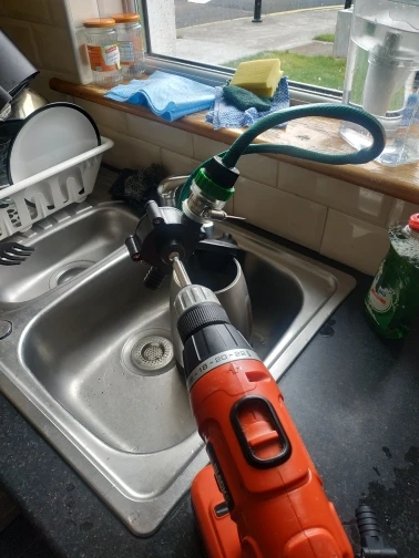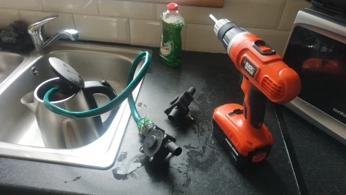 Это четвертый, который я купил. Они дешевые и долговечные, но если обращаться с ними без осторожности (пустить их без воды), они перегорают. Стрелка, указывающая поток воды, очень мала и ее невозможно увидеть. Насос сцеживает воду, когда дрель находится в положении «отвертки». Вода внутри насоса проходит длинный путь. Таким образом, вы сможете понять, где вода должна входить и выходить.