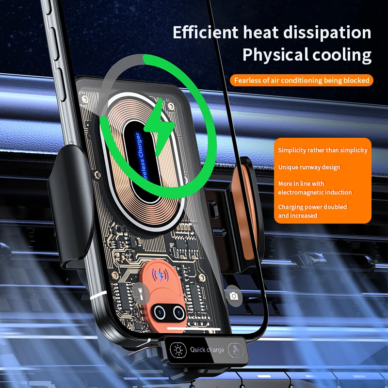 Модернизированная интеллектуальная автоматическая зажимка Ручки и ножка беспроводного автомобильного зарядного устройства автоматически открываются после подключения к источнику питания и надежно зажимаются после того, как телефон вставьте, не нужно вручную отрегулировать ножку, чтобы зажать телефон.