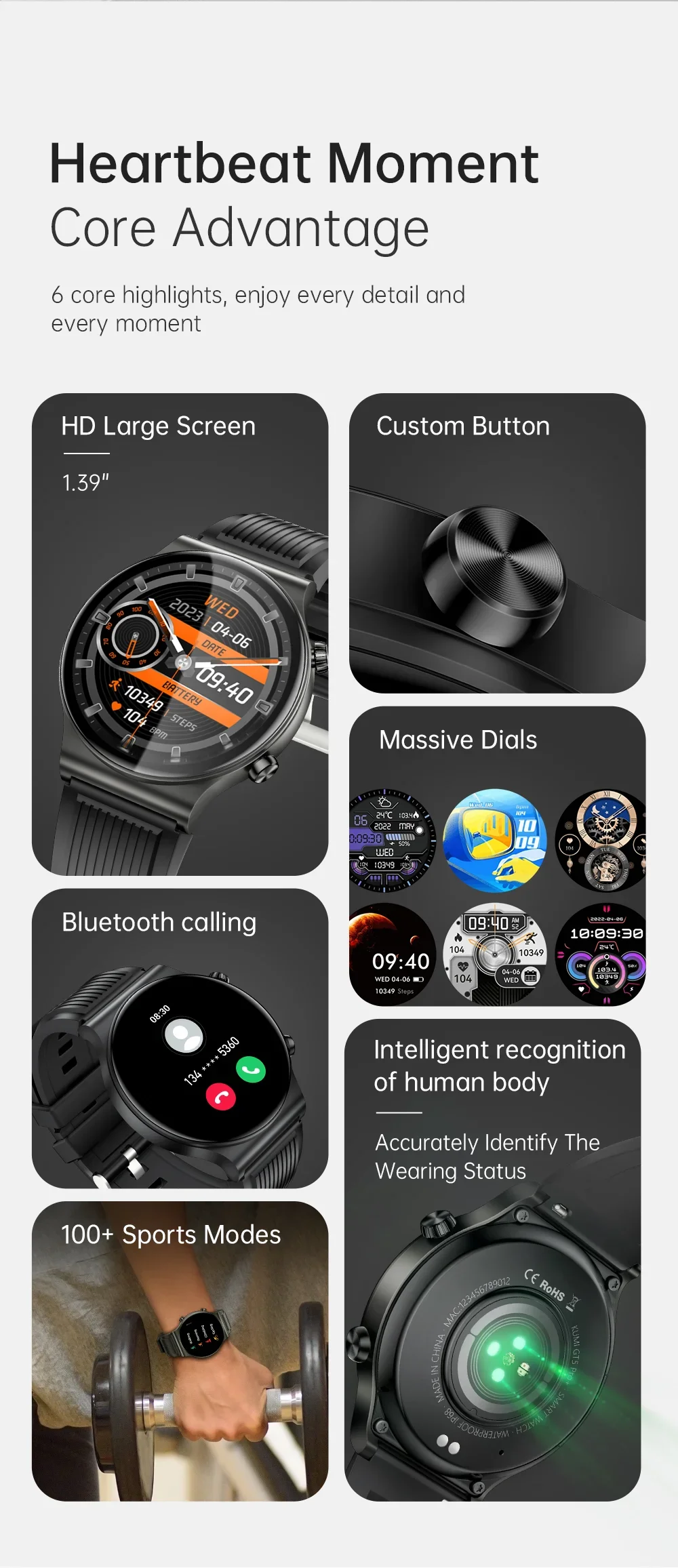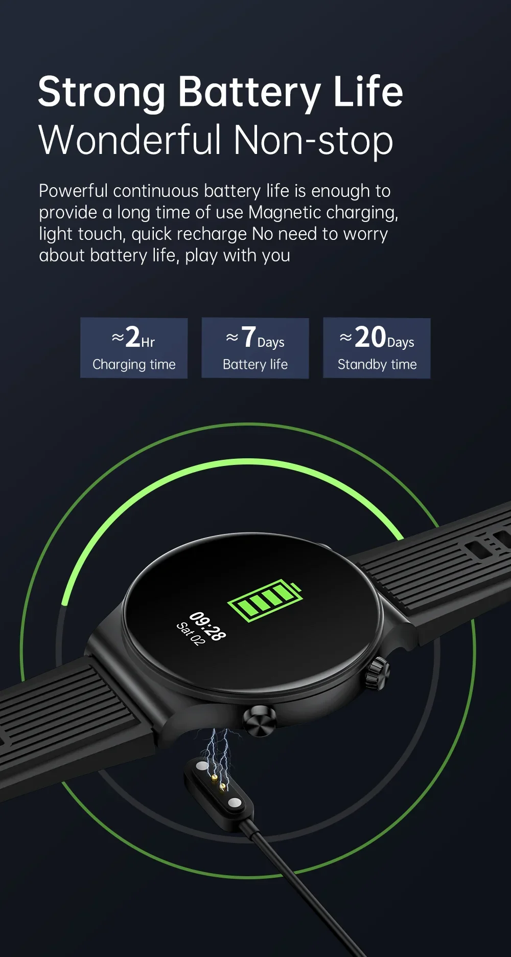 Basic Functions: Clock, Date Display, Multi-dial( 5 built-in dials in the watch), Bluetooth calling, Split Screen (Sidebar), Always-on screen (rest clock), Password lock...