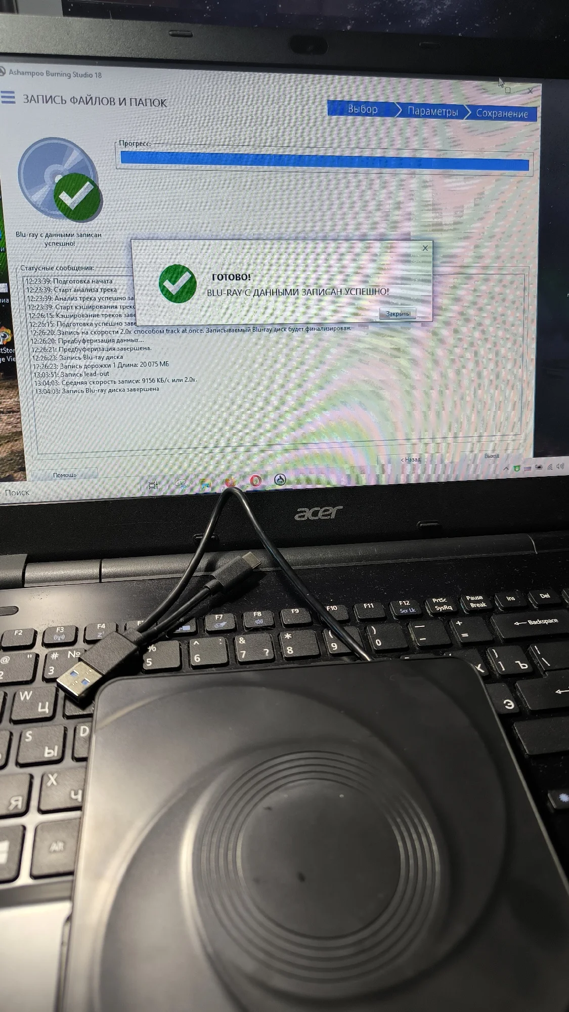 Работает, записывает BD-R. Диск потом читается на другом устройстве. Работает как с USB-A так и с USB-C, удобно.