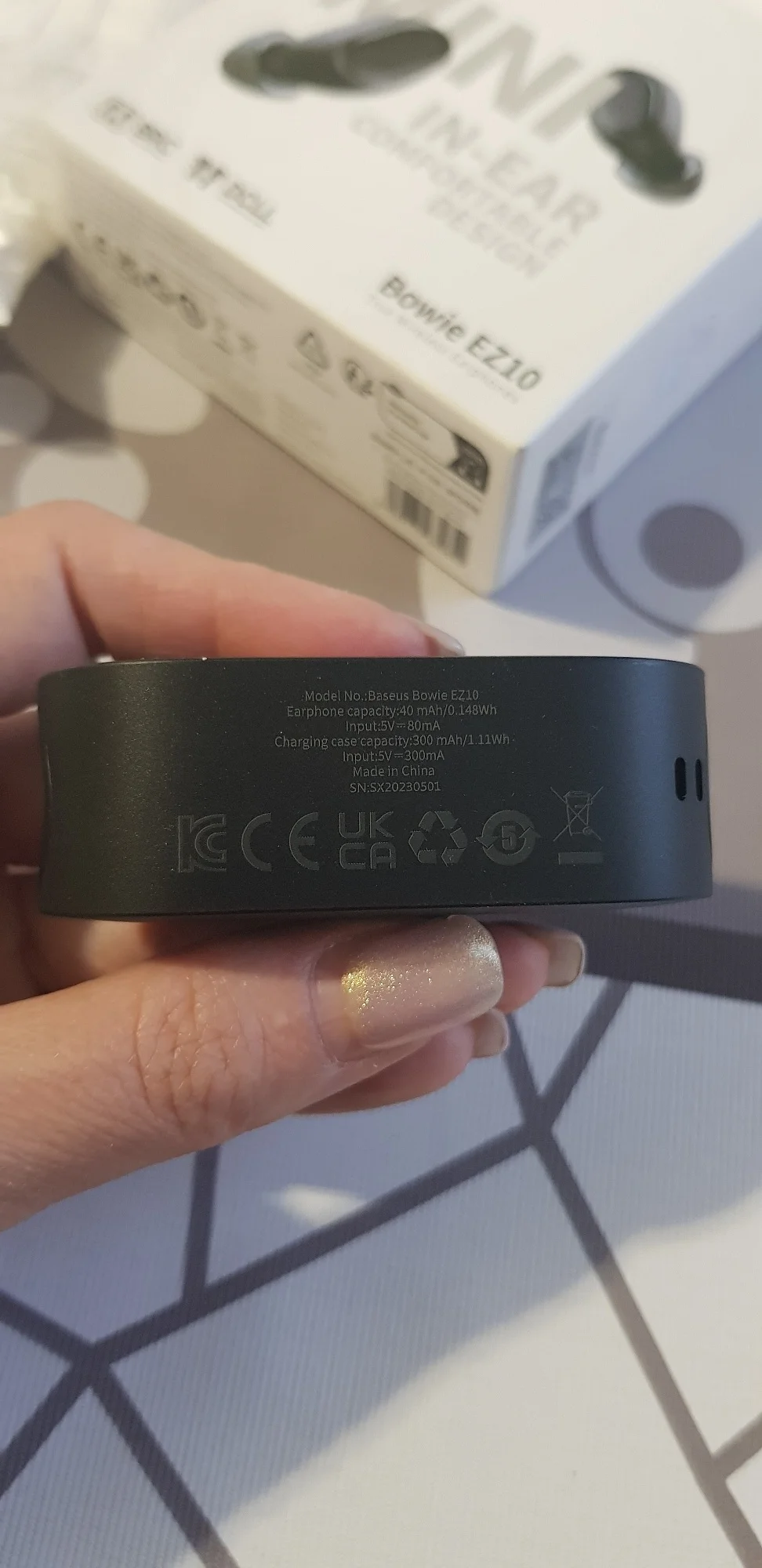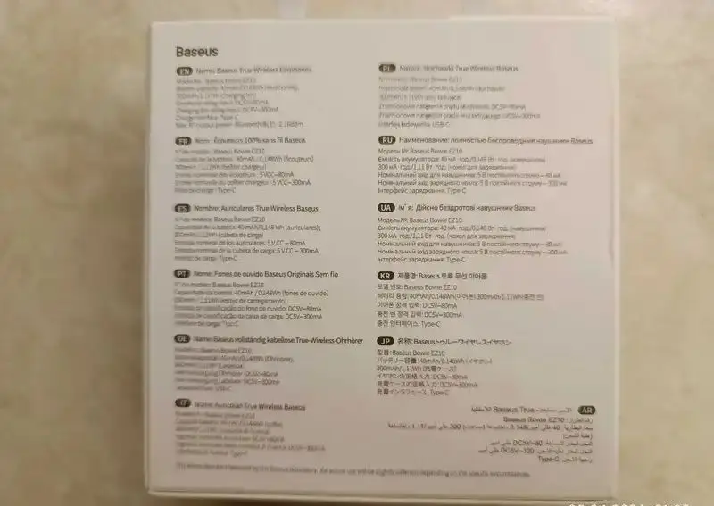 - Емкость аккумулятора [мАч]:40mAh/0.148Wh(earphones) 300mAh/1.11Wh(charging bin)