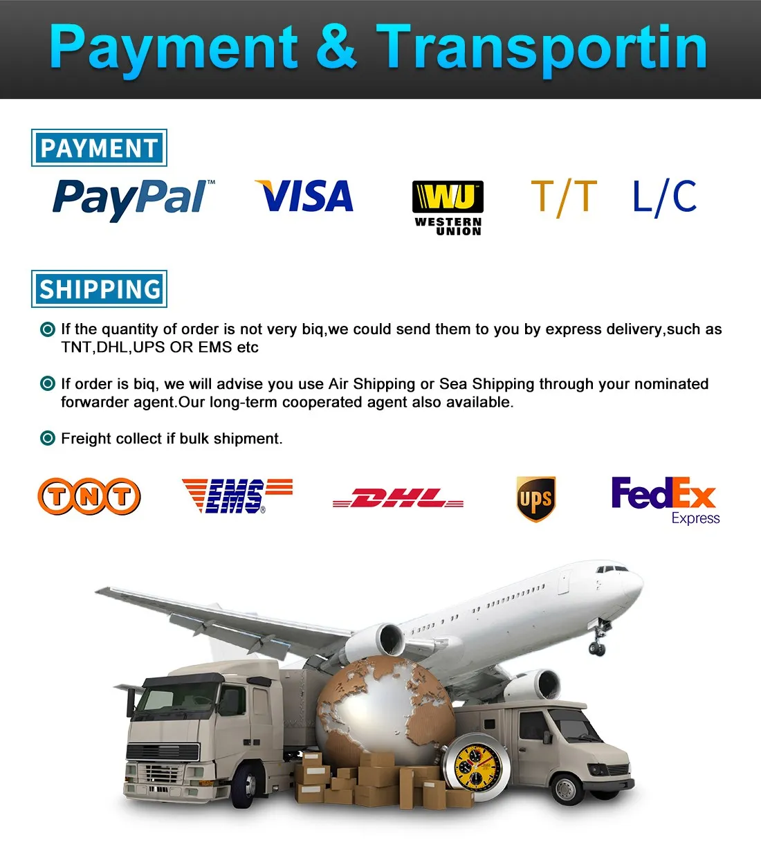 A4: T/T, Paypal, Western Union или вы можете оплатить заказ через Alibaba.