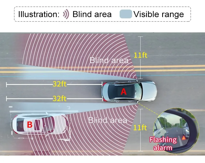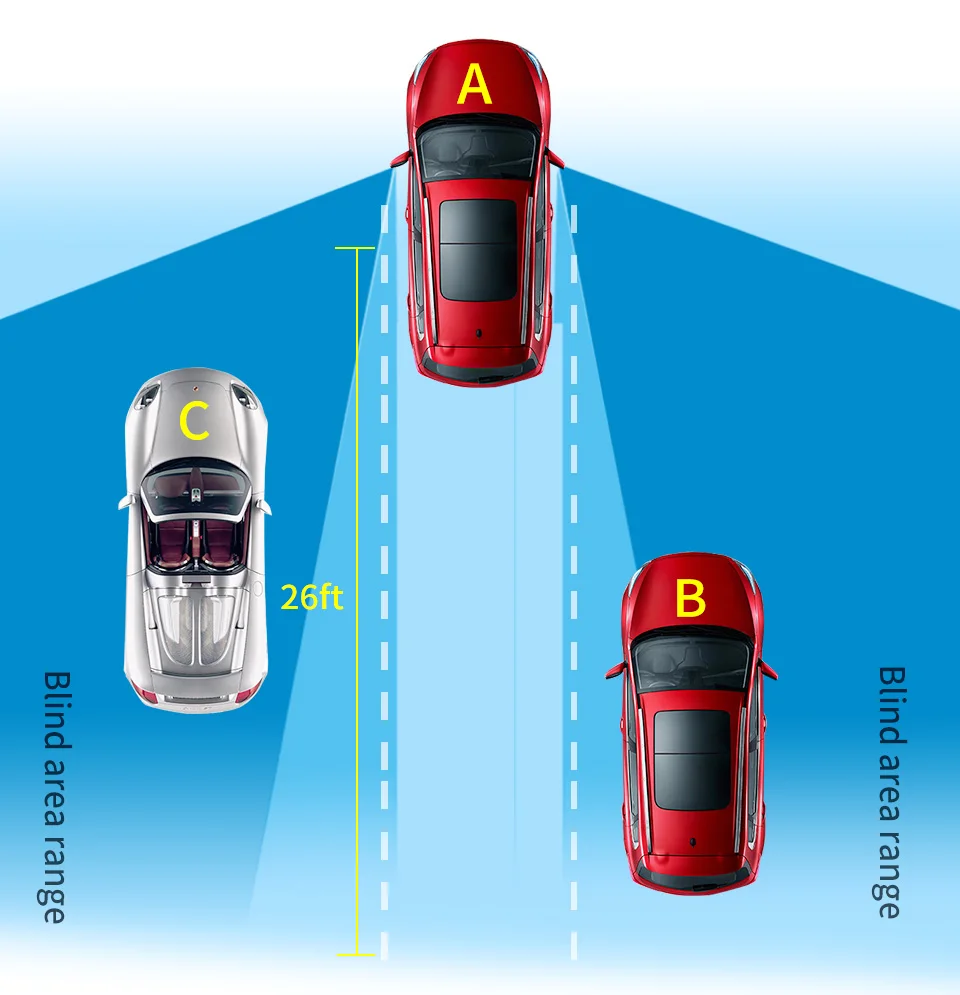 Дальность действия слепых зон в пределах 8 метров позади автомобиля с B-образной стойкой обнаружения обнаруживается. Когда транспортные средства в зоне обнаружения двигаются с той же скоростью, будет начинаться напоминать владельцу.