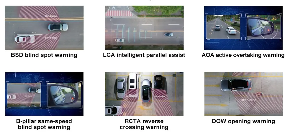 6 вспомогательных функций BSD обнаружение слепых зон;LCA помощь по изменению полосы движения;DOW Предупреждение об открытой двери;RCTA оповещение о заднем перекрестном движении;AOA активное предупреждение обгоне;Последующее предупреждение о движении на стойке B с той же скоростью;Помогите водителям более эффективно избежать несчастных случаев при боковых авариях.