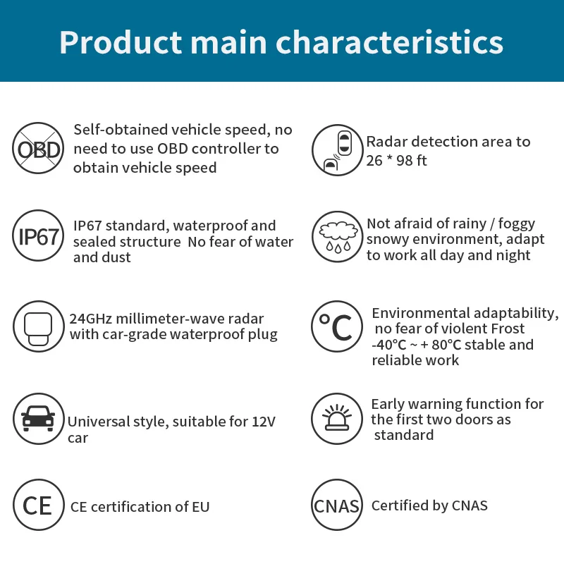 Функция предупреждения сигнализации Независимо от того, ночное время, под дождем, в тумане или даже на снегу. Всякий раз, когда движущийся объект внезапно входит в зону обнаружения, светодиод мигает, и раздается звуковой сигнал, напоминая водителю.