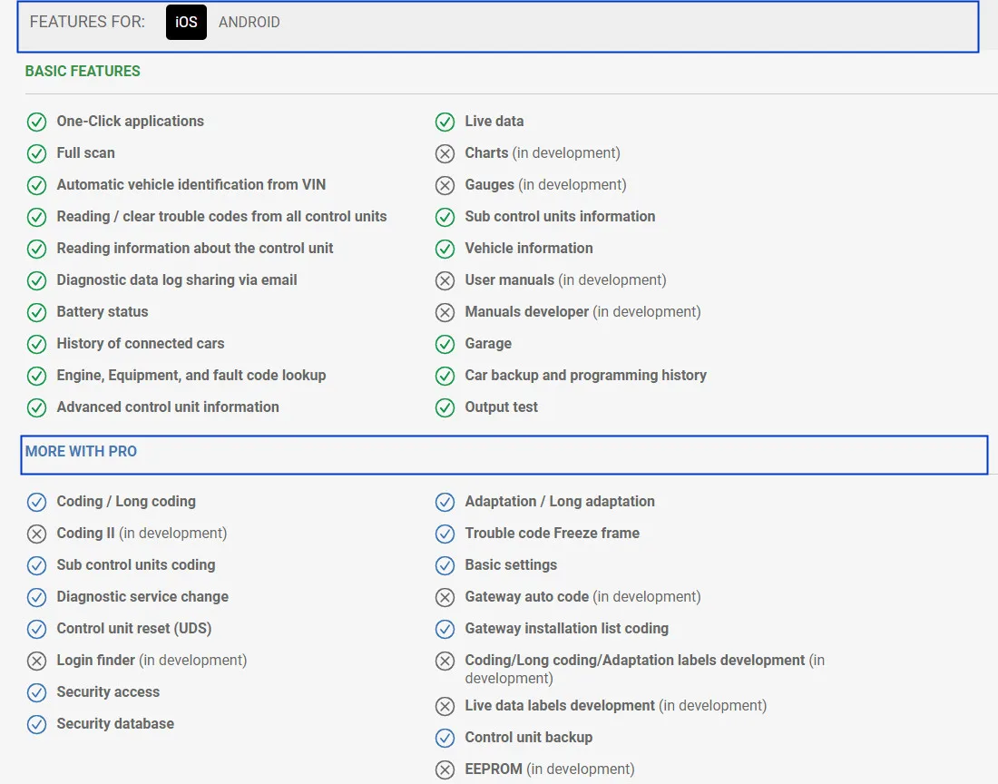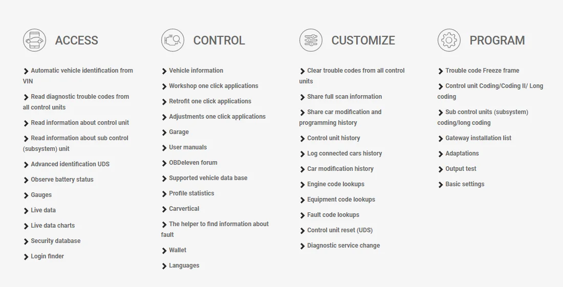 OBDeleven device becomes a professional tool upgraded with 12-month PRO subscription, which unlocks the functionality of advanced diagnostic systems for all VAG group cars: Audi, Volkswagen, Seat and Skoda. Operating with easy to use application it allows you to fully access all car systems, program, monitor and activate various functions via your smartphone.