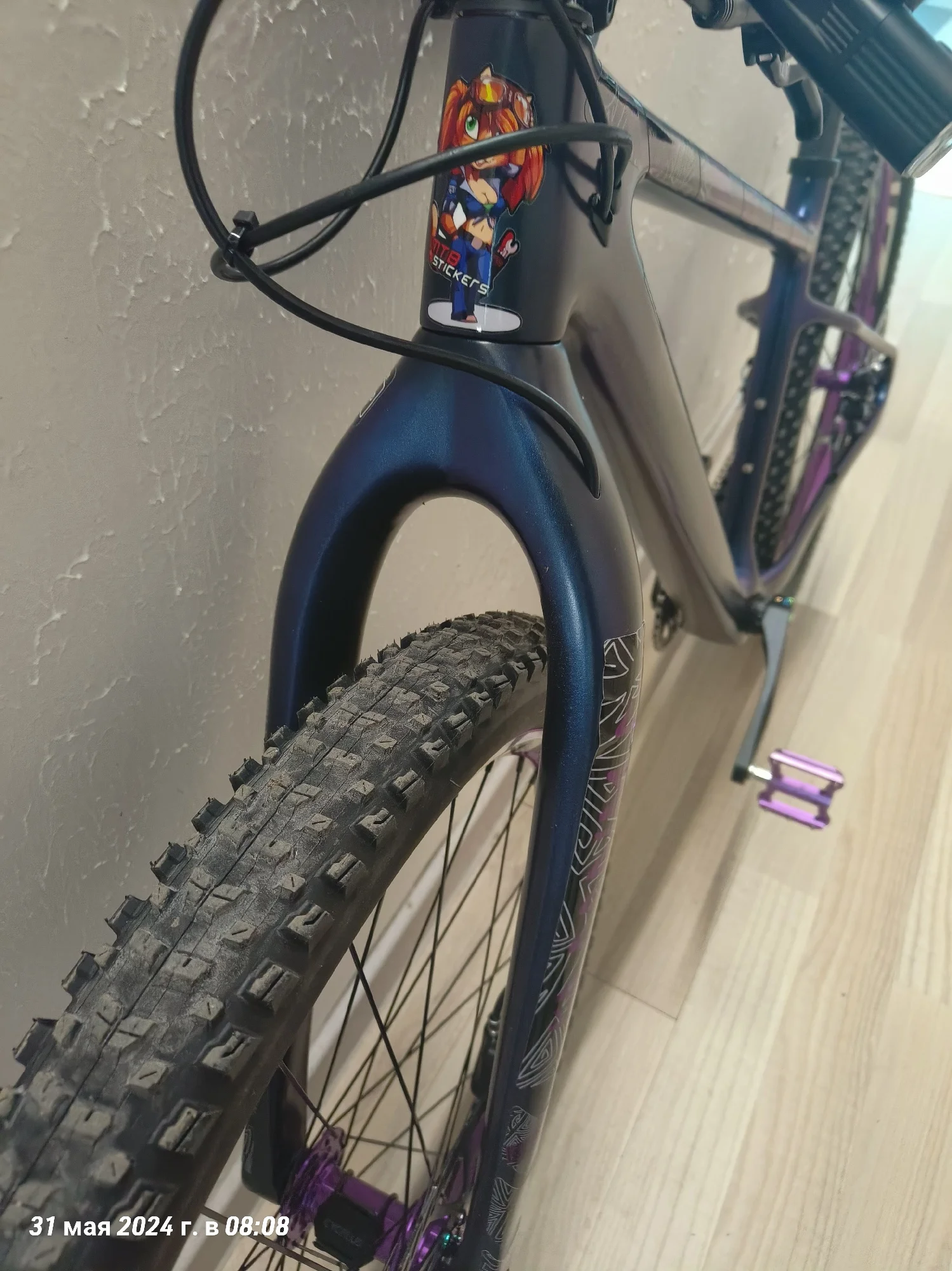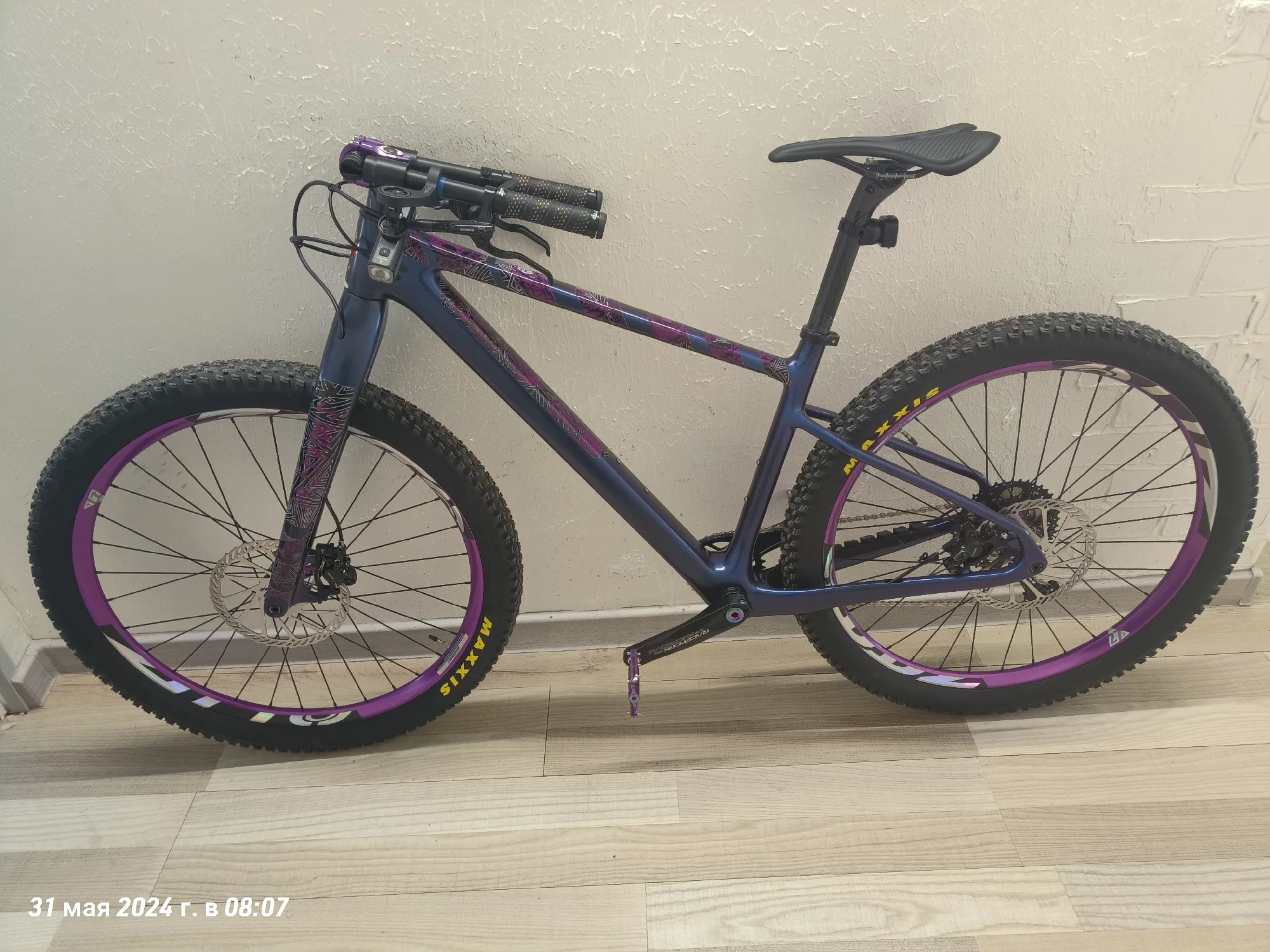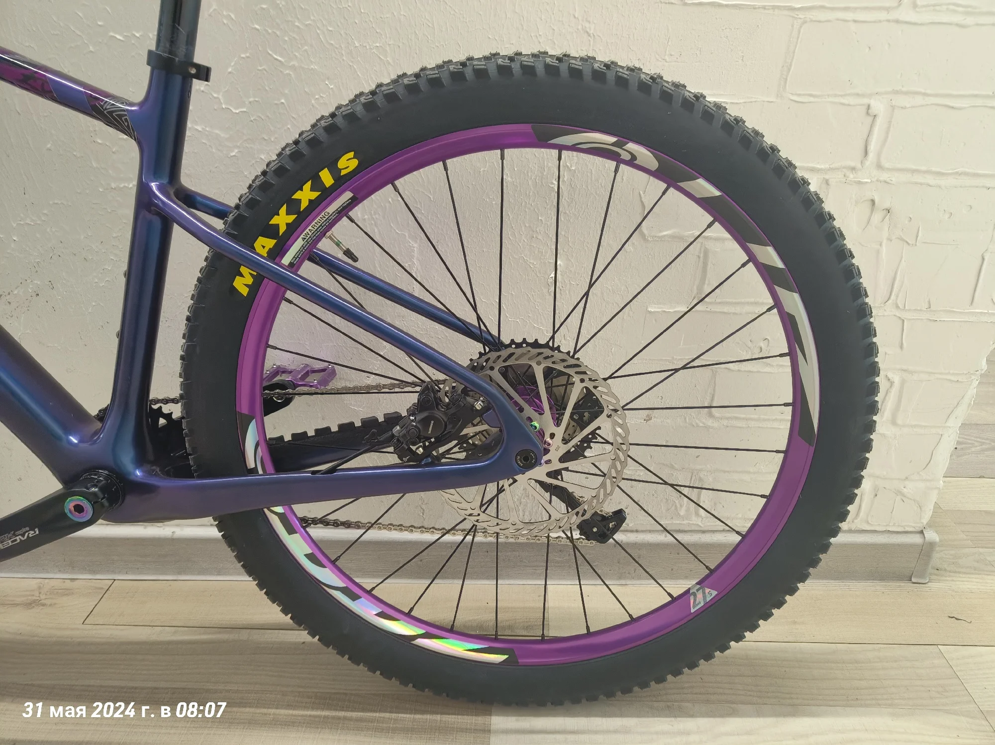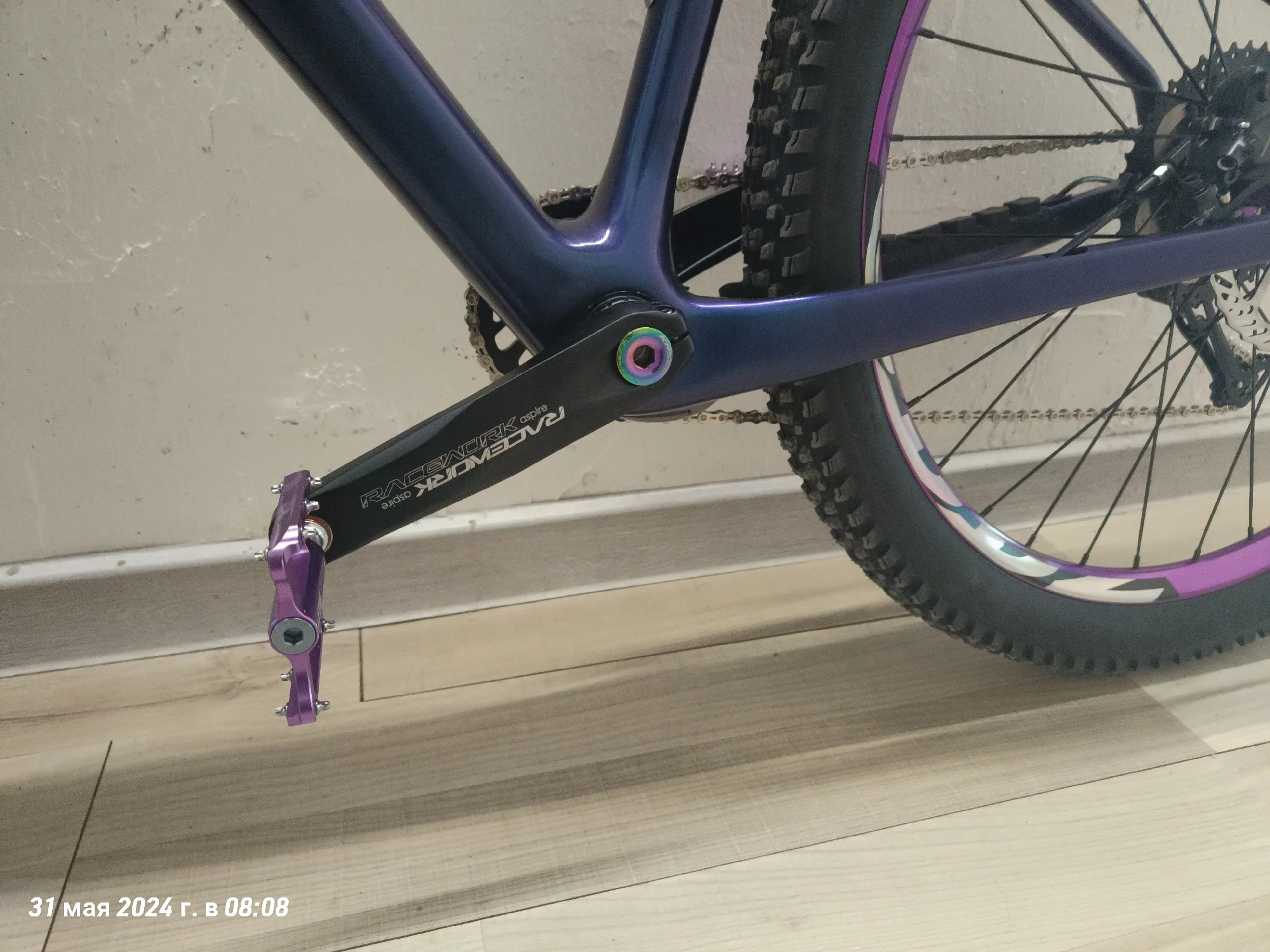 Ну вот и я напишу отзыв о раме. Рама пришла очень быстро, за неделю, неожиданно конечно. Красили раму сами, цвет хамелеон "неоновый космос". Выход для рубашек выглядит удобно, протягивать тросы конечно очень сложно, с переключателем не сильно мучилась, но вот с гидролинией пришлось повозиться, т к прокладывала ещё шум трос. Рама для 29 колес, но я установила 27,5 на 2,6 maxxis recon, обода внутренний 29 мм, ширина покрышки получается 65 на таком внутреннем ободе. Думаю, что влезут и на 2,8 дюймов покрышки, т к место внизу есть. Про подшипники в рулевой. Нижний подшипник лёг отлично в свое место, не выпирает снизу. А вот верхний нет, выпирает, из-за этого есть щель, надеюсь она не критична, т к есть люфт, но мне не нравится. Шатуны выбирала долго, не знала какие подойдут, но сразу скажу можно смело брать 98 мм, внутреннее расстояние шатуна для каретки. На счёт место под тормоз, изначально там под 160, но мне захотелось на 203, купила переходник на 203, но он видимо на место, которое сверху идёт, а на этой снизу, ну и пришлось пилить переходник. Думала, что будут проблемы с настройкой тормоза, но все идеально и быстро настроилось. Собрала на днях, т к ждала все. Сегодня 31.05.24 первый раз поеду на нем, если что дополню отзыв.