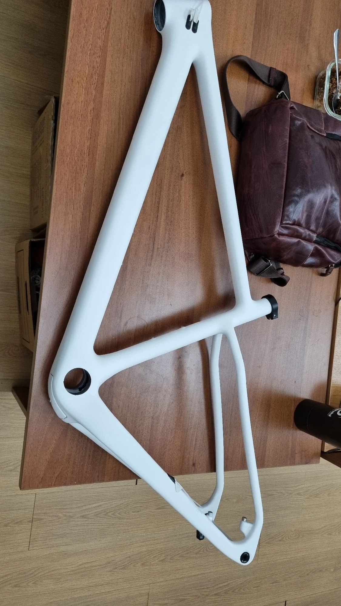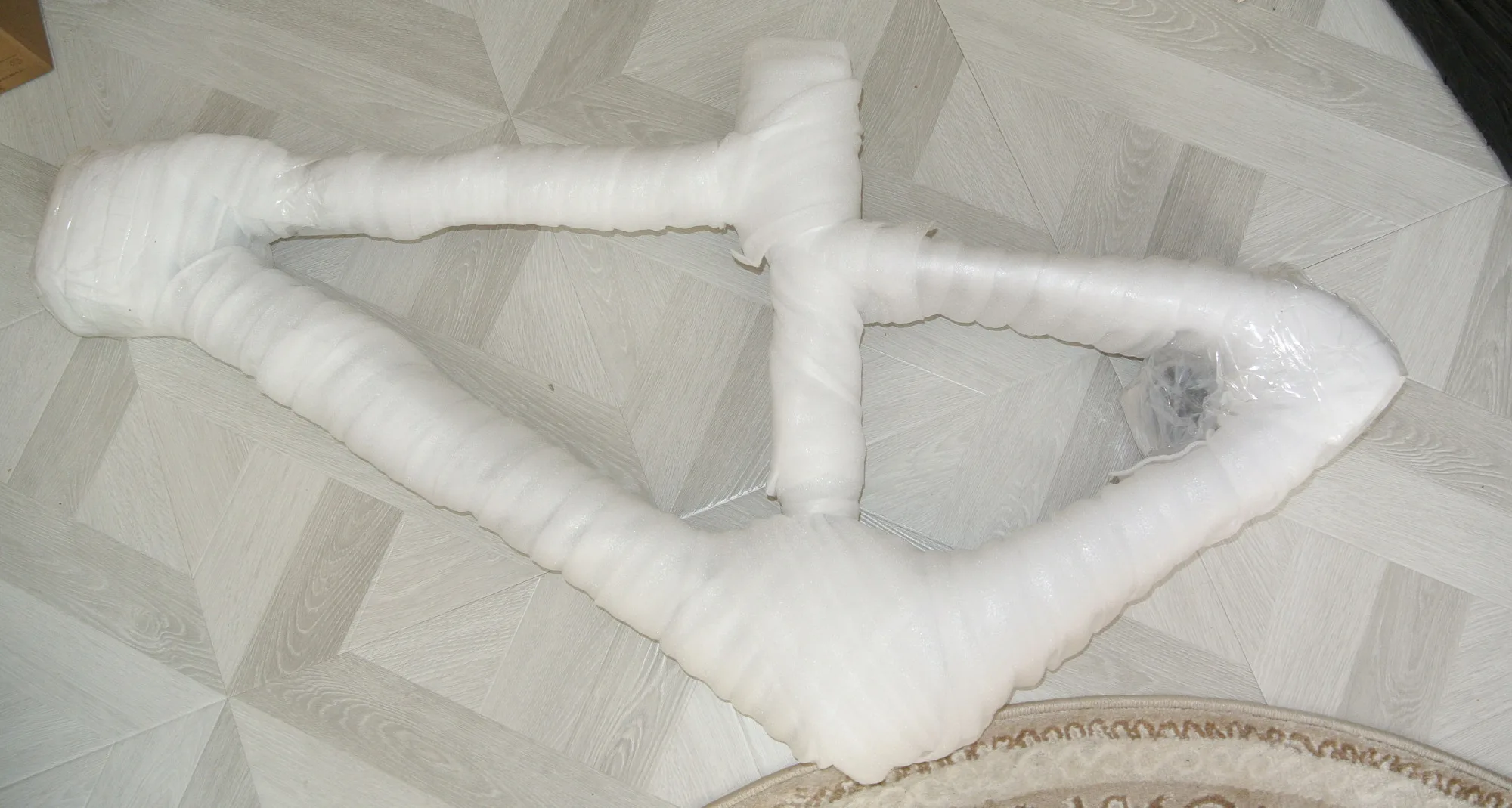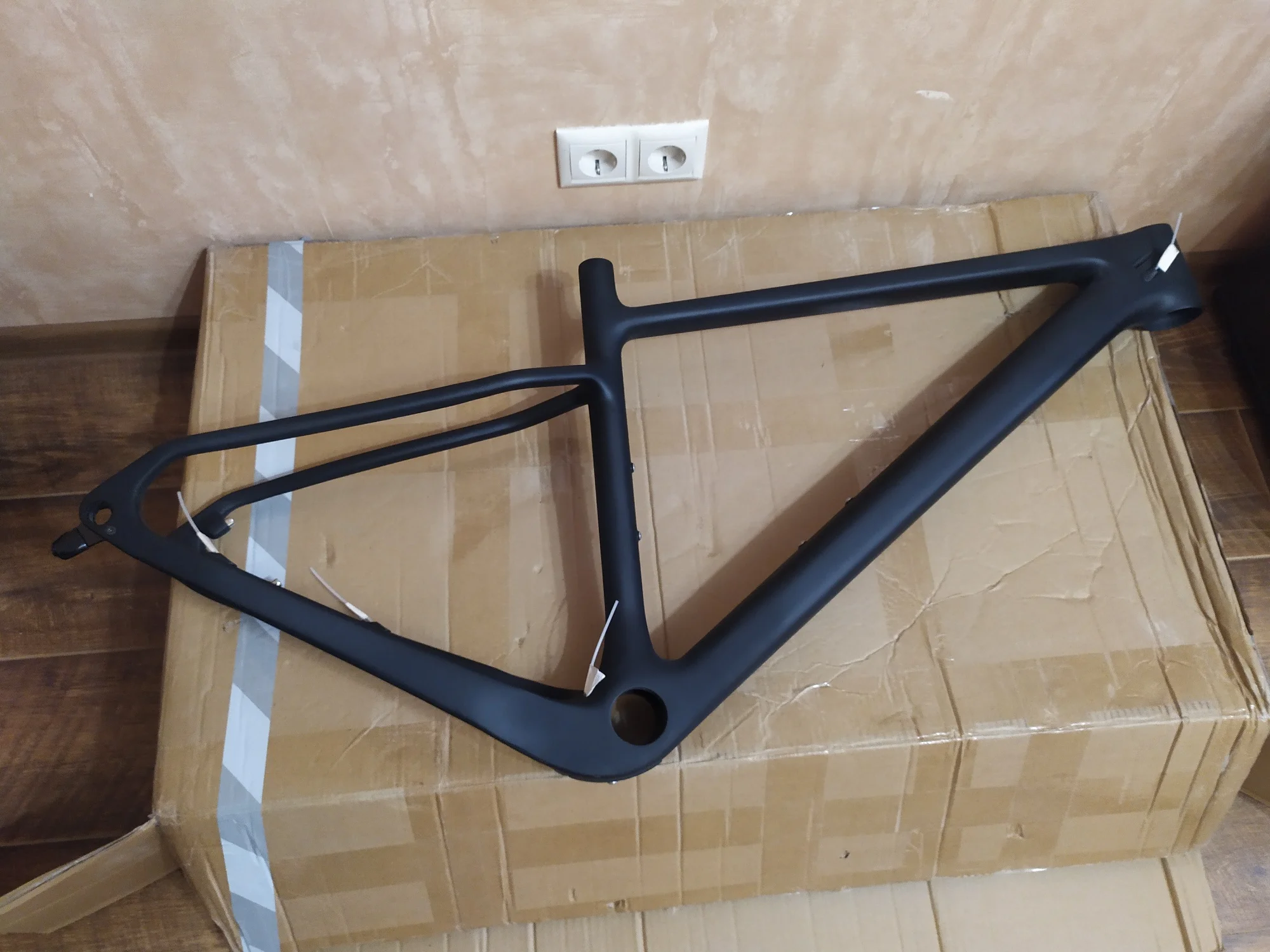 Рама целая, упаковка хорошая. -1 звезда за не оторцованые места крепления калипера. Цвет при заказе указывал серый матовый (grey), а как видно по фото - антрацит или графит.
