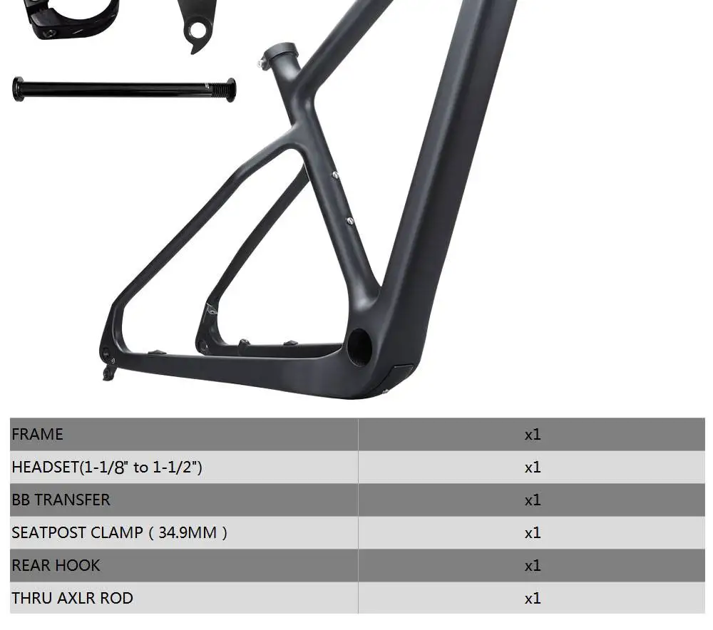 18. В комплект входит: рама, гарнитуры, перевод BB, зажим подседельного штыря, стержень сквозной оси, алюминиевые детали.