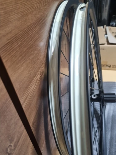 Это изготовлено на заказ, поэтому доставка немного медленная, но колесный комплект прочный и качественный. Срок доставки составил около 40 дней с даты заказа. Коробка была доставлена в поврежденном состоянии, но колесный набор был без проблем. Пара обуви выглядит похожей на оригинальный дизайн. Вам необходимо приобрести ободную ленту для бескамерных шин отдельно, вместе с бескамерным клапаном. Я использовал его коротко как клинчер, а теперь как бескамерный, но даже без добавления герметика воздух не уходит.