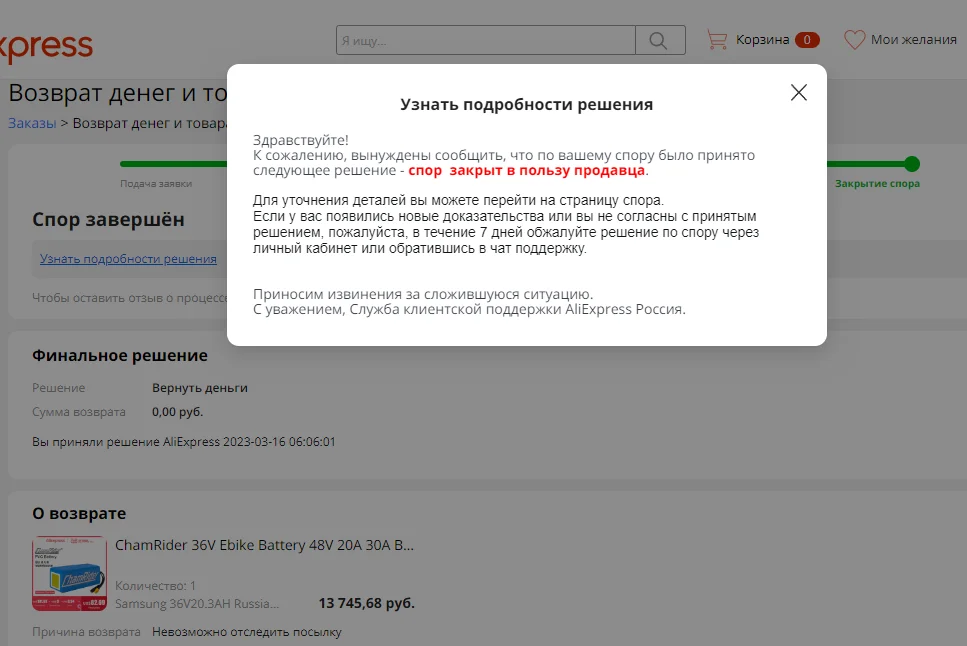 Доставка месяц из Китая, хотя заказал экспресс. Доставлено СДЕКом. Аккумулятор пришёл полностью разряженным и не реагировал на зарядку. Отправил видео продавцу, он попросил разобрать аккумулятор и померить напряжение внутри. Я это сделал и отправил видео. Все ячейки 18650 разряжены до 0.3-0.4В, что недопустимо. Ячейки дохлые. Заметил на одной ячейке дату изготовления 2019г. Продавец обещал прислать другую батарею после того как подтвердит брак. Я не стал дожидаться этого и открыл спор пока была возможность. Продавец просил меня закрыть спор и после он якобы отправит батарею. АлиЭкспресс не рекомендует закрывать спор. После закрытия спора заказ считается завершённым и остаётся только надеяться на честность продавца. Открыть спор снова нельзя. Спор длился 2.5 недели. АлиЭкспресс вернул мне деньги. После спора изучил батарею подробнее. Батарея собрана из аккумуляторов 2017, 2018 и 2019 годов производства, а разрядила их в 0 неисправная BMS. До этого момента успел сделать второй заказ, думая что мне пришла старая батарея случайно. За второй заказ деньги вернул АлиЭкспресс. Качество батарей одинаковое.Sergei B. 3 ноября 2024