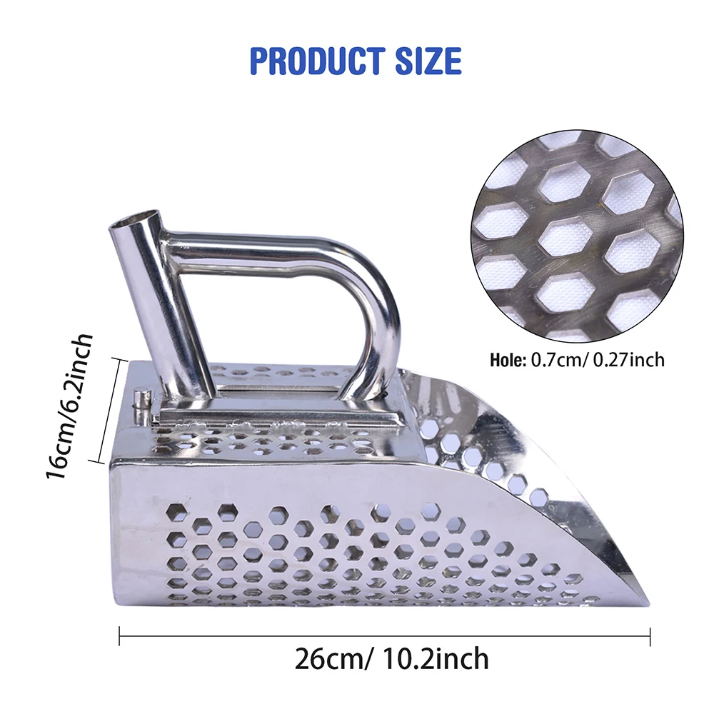 Сверхмощный Совок лопаты:Изготовлен из высококачественной нержавеющей стали 304 толщиной 1,5 мм, а диаметр отверстия для утечки составляет 0007 м, что позволяет быстро и легко зашкурить скрининг. Безупречное качество увеличит счастье от охоты за сокровищами.