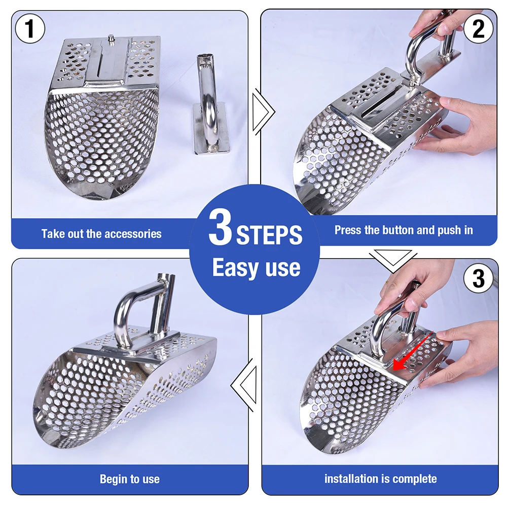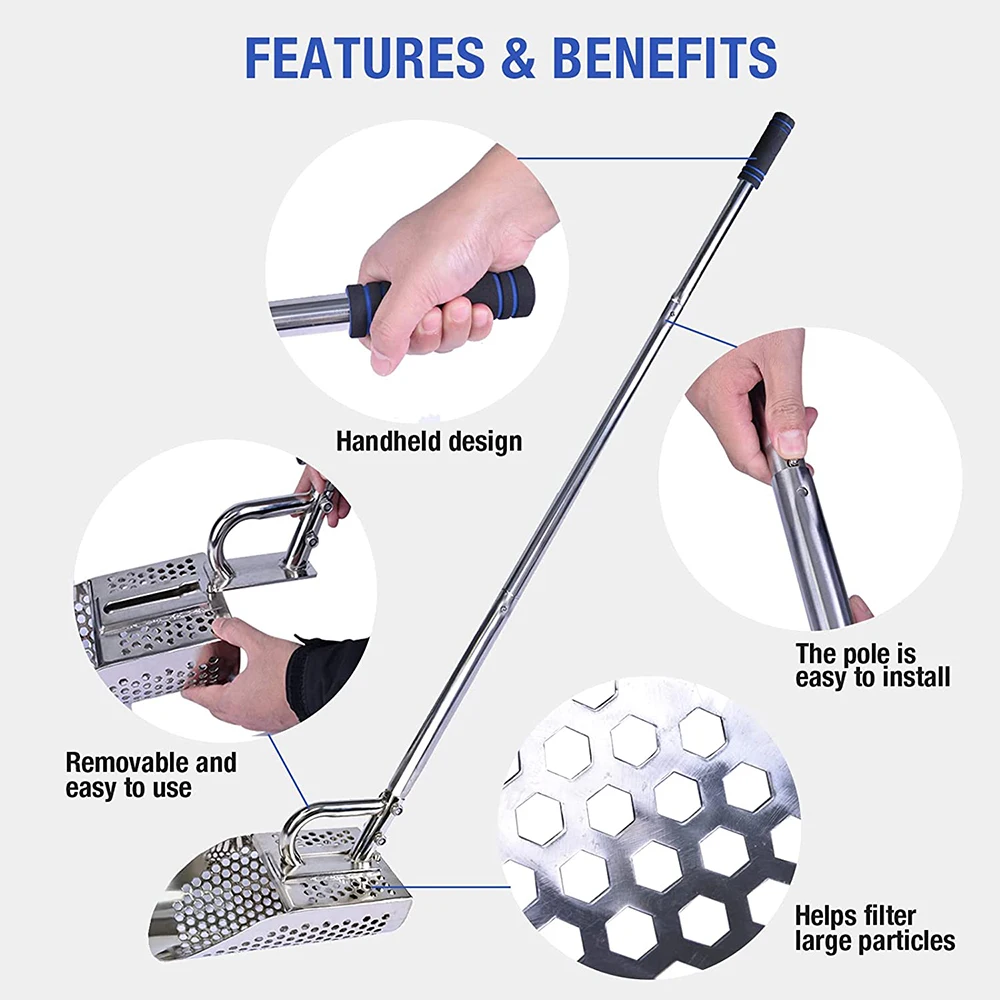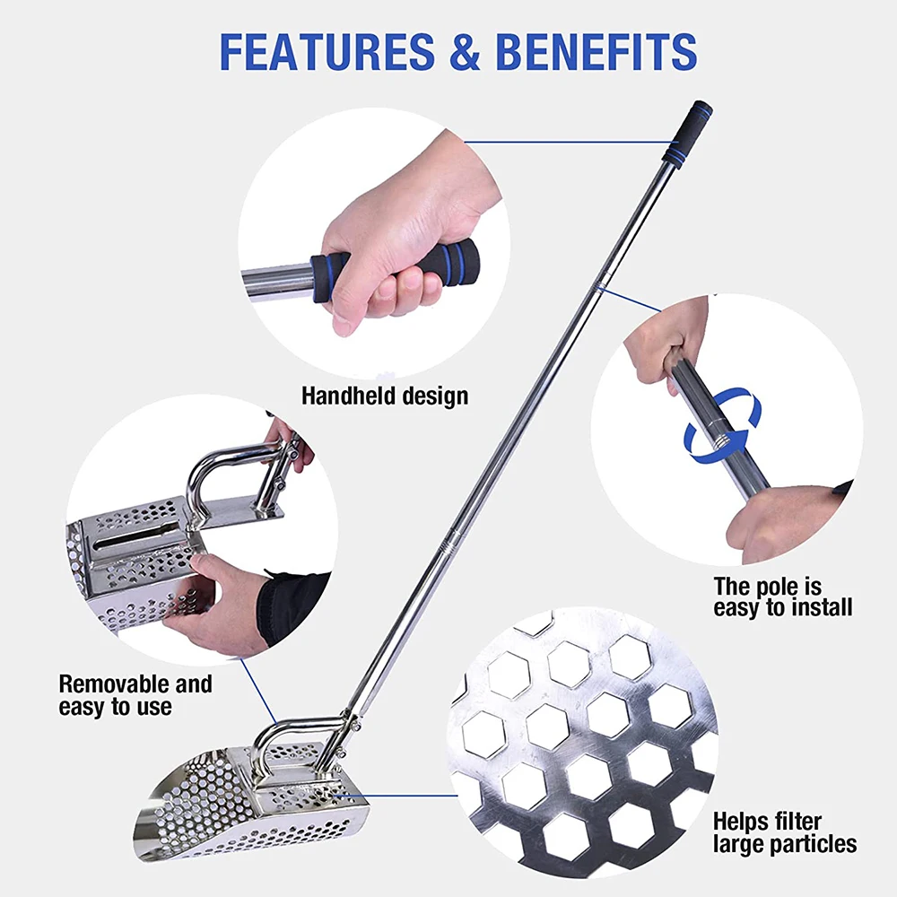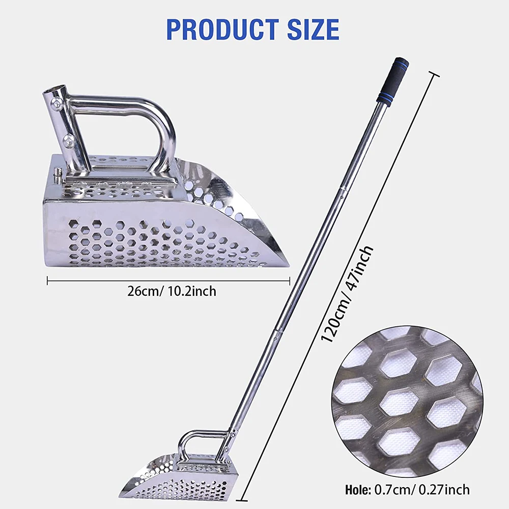 Ручной с длинной ручкой Полюс: Специальная съемная конструкция и Удлиненная ручка для стоя; Усовершенствованный дизайн: уникальный внешний вид и более гибкая ручка, так что это больше экономия труда при просеивании. Передняя овальная форма лопаты экономит усилия при гребке и лучше снижает сопротивление.