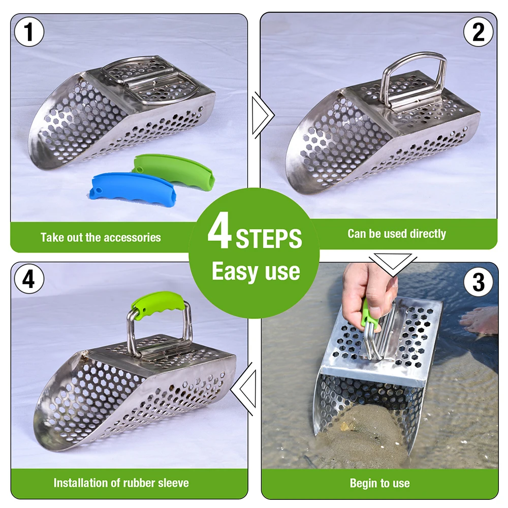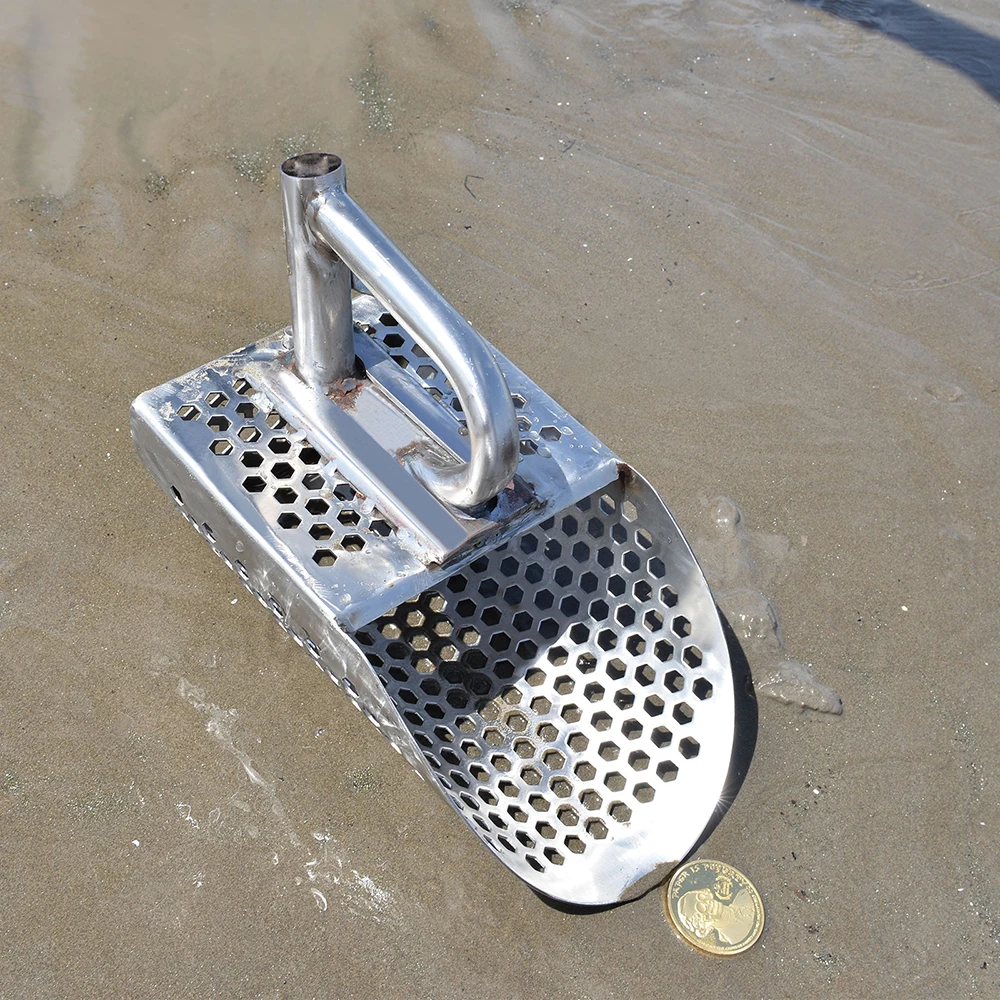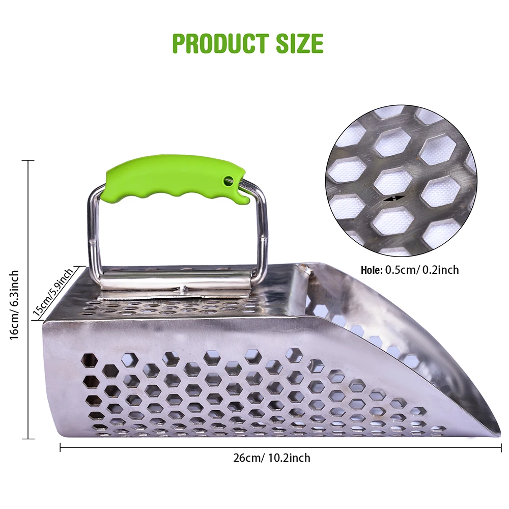 Сверхмощный Совок лопаты: изготовлен из высококачественной нержавеющей стали 304 толщиной 1,5 мм, а диаметр отверстия утечки составляет 0007 м, что позволяет быстро и легко зашкурить скрининг. Безупречное качество увеличит счастье от охоты за сокровищами.