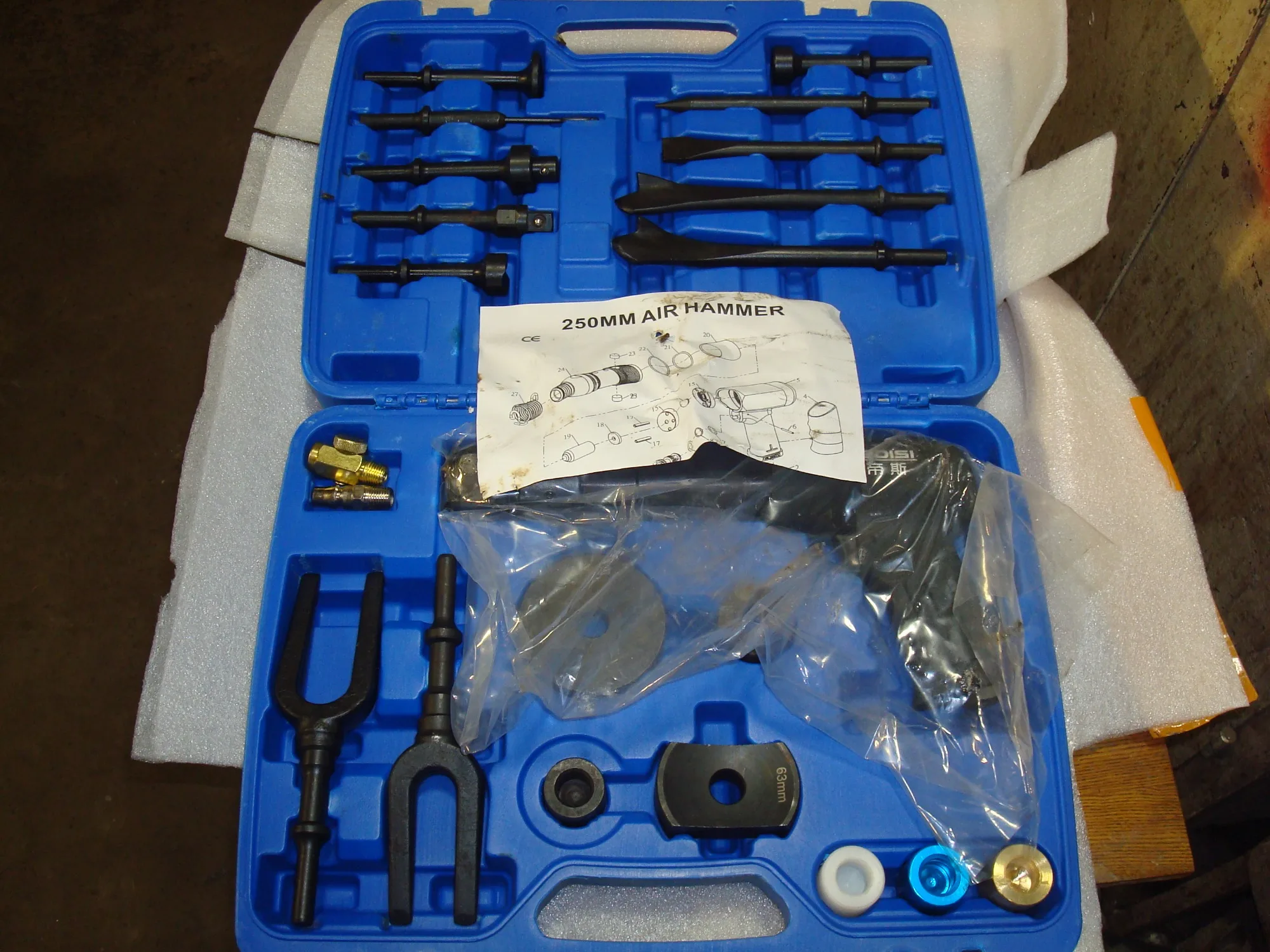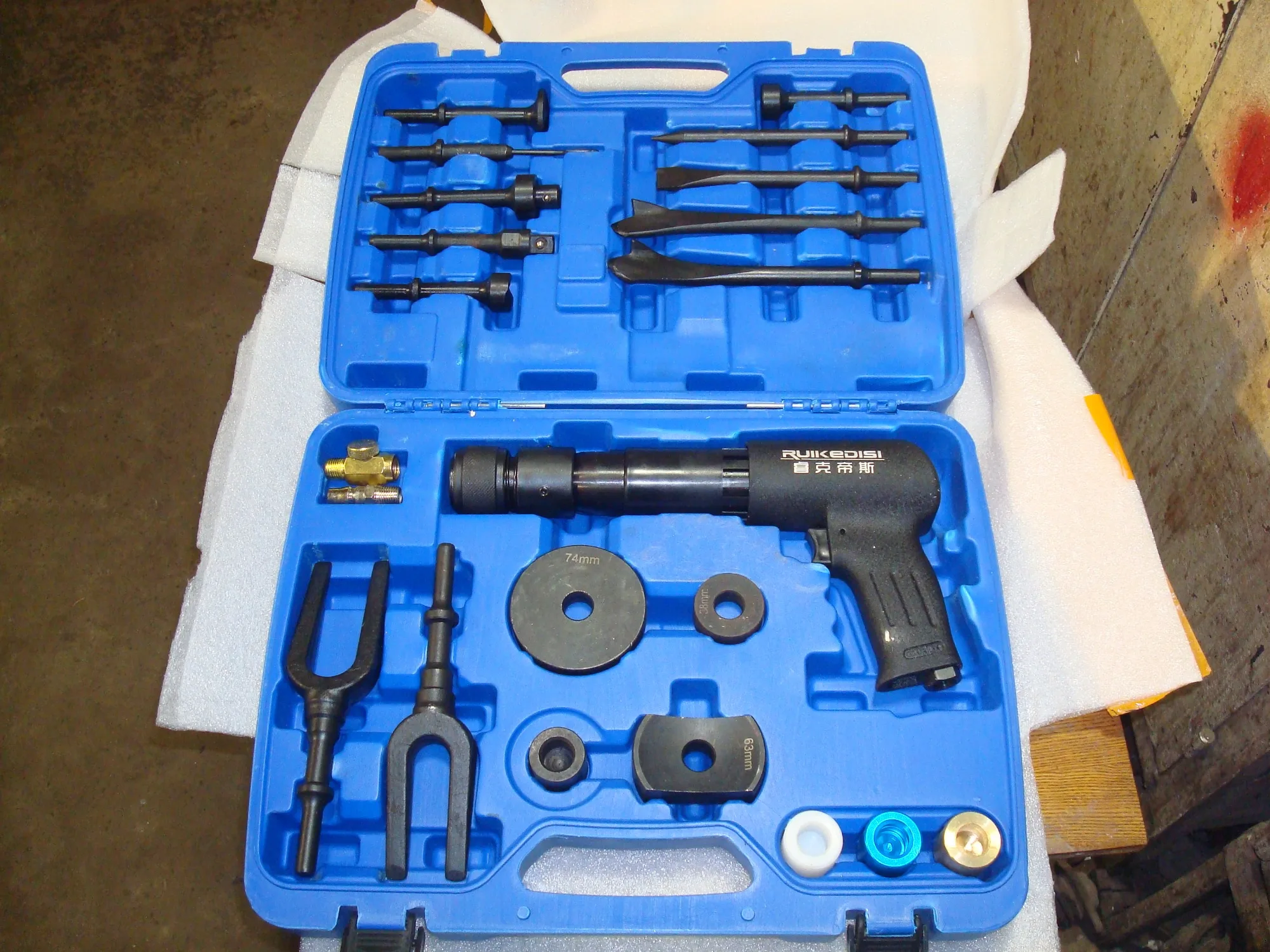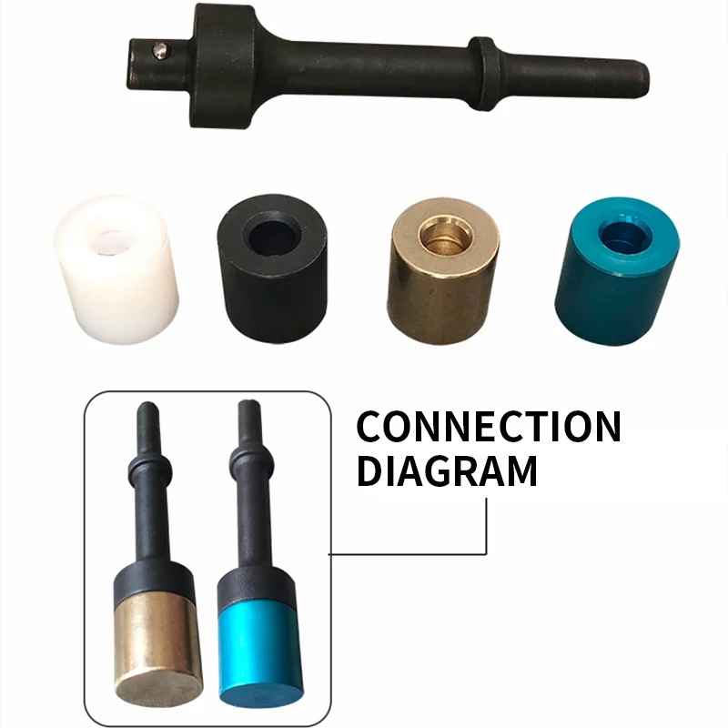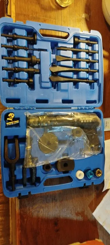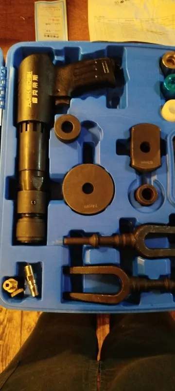 Функция: Набор воздушных молотков подходит для обслуживания автомобиля, разборки вибрации различных автомобильных винтов, разборки свободного полувала/тормозного диска, шаровой головки/шариковой клетки/тормозного диска, удаления клея, ослабления алюминиевых деталей, разделения листового металла, двух адаптеров пластин используются для выдачи подшипников/втулок небольшого размера.