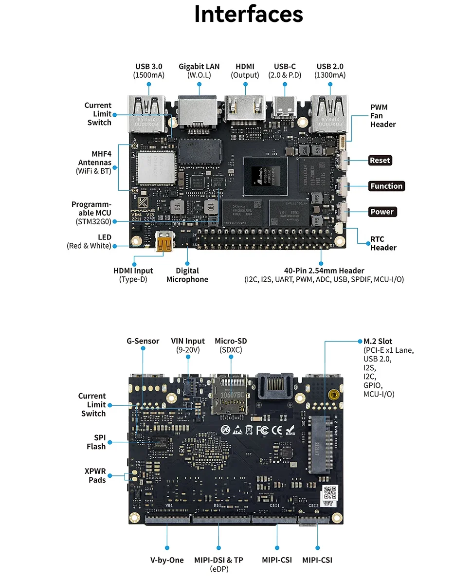 - 40-Pins Header(2.54mm):CPU: USB, I2C, I2S, SPDIF, UART, PWM, ADC, GPIO MCU: SWCLK, SWDIO
