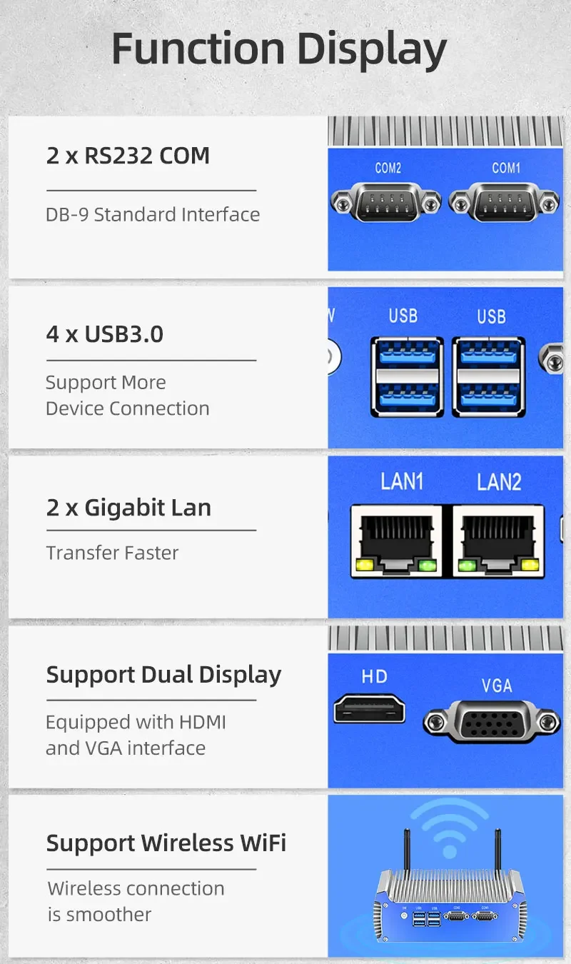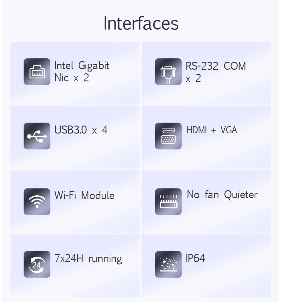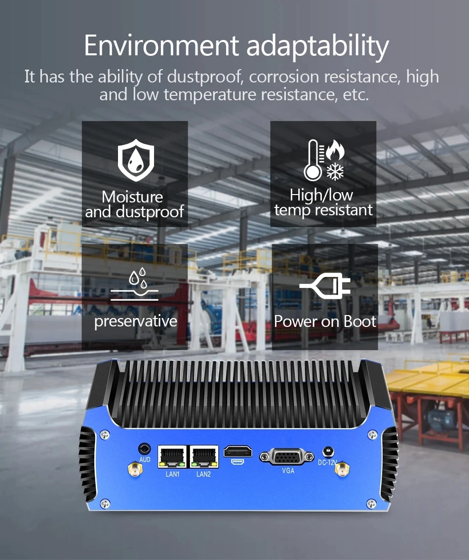 - interface:2*LAN 4*USB3.0, 2*COM, VGA HDMI, WIFI