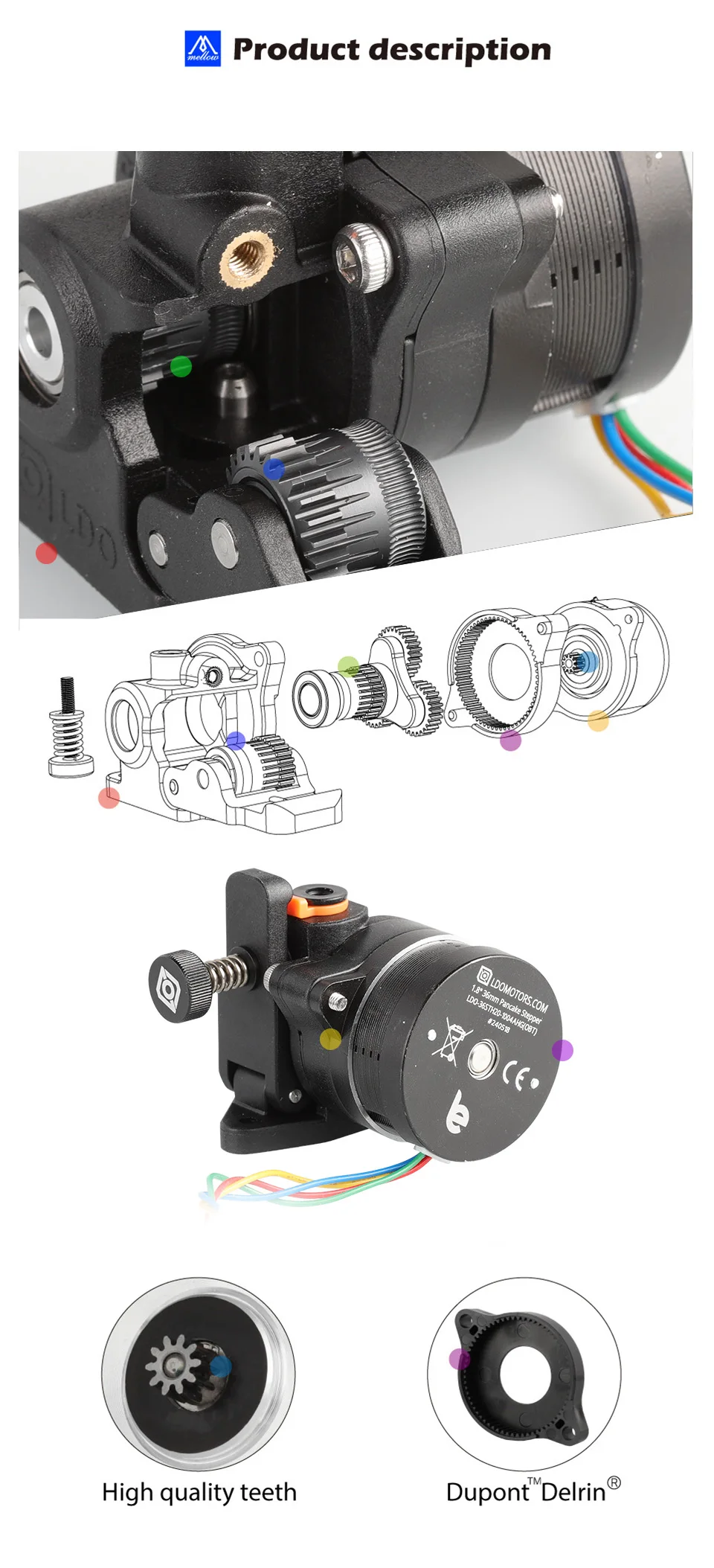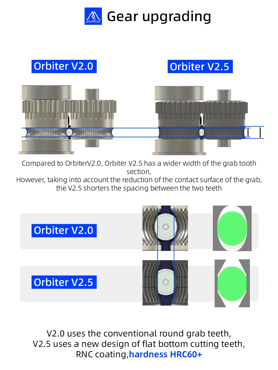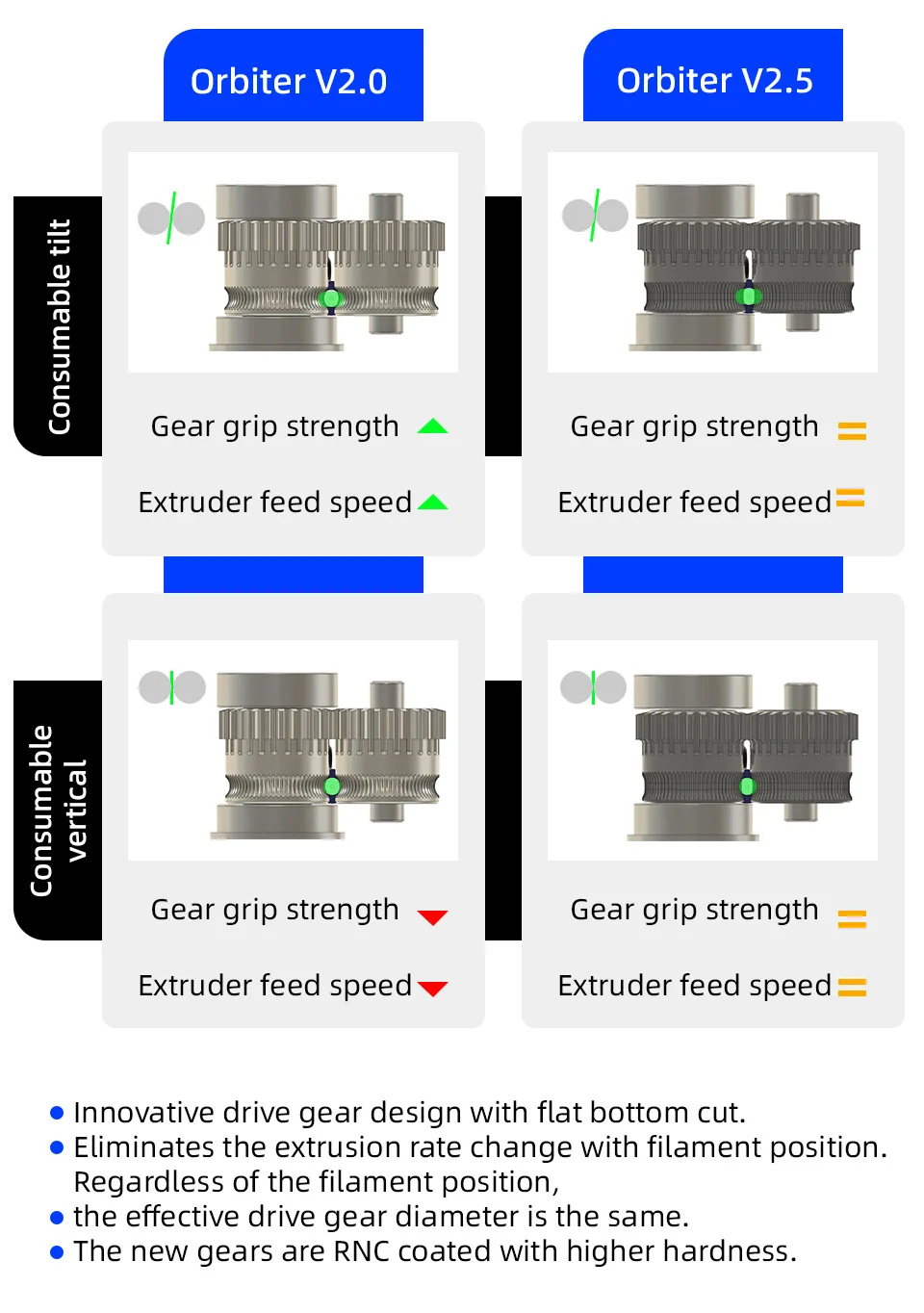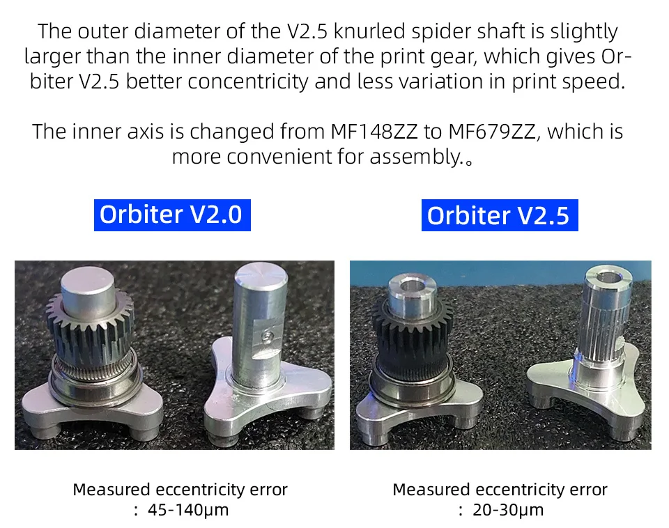 Экструдер Orbiter V2.5 имеет прочную литую под давлением внешнюю оболочку, повышающую долговечность.Он использует высокотемпературный двигатель LDO для обеспечения высокого крутящего момента и улучшения производительности.Высококачественные шестерни с нанопокрытием RNC (HRC60+) имеют инновационную конструкцию с плоским дном, поддерживающую постоянную скорость экструзии независимо от положения нити.Модернизированный вал-паук с рифленой поверхностью и запрессованной приводной шестерней обеспечивает лучшую концентричность шестерни, дополнительно повышая надежность и точность.