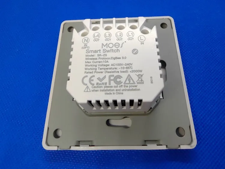 Умный кнопочный переключатель MOES Star Ring Smart Switch Zigbee 3.0 версия 1 кнопка (1 gang white) модель SR-ZS магазин MOES Online Store В комплекте 1. Выключатель MOES 2. Инструкция на английском языке 3. Винты 2 шт 250 мм. Материал: пластик Вес выключателя: 121 грамм Вес в упаковке: 173 грамм LED индикатор Размеры внешние рамки: 86 x 86 мм. Тонкая рамка: 8.4 мм. Глубина установки внутрь: 29.6 мм. Размеры посадочные для крепления: 60 мм. между центрами 50 x 50 мм. 100-240V, 10A Max, -10 - +65 C В инструкции схема подключения, рассказано про установку и переключатель Для работы через приложение необходимо купить Zigbee Gateway Hub, который работает через 2.4 GHz Wi-Fi сеть, Zigbee протокол, Bluetooth, Mesh Для удаленного управления - Tuya Zigbee, а также Alexa и Google Assistant для управления голосом. L - линия (фаза) N - нейтраль (ноль) Производитель: Wenzhou Nova New Energy Co. Ltd. Доставка около месяца из Китая Упаковано в пузырчатый пакет и коробку MOES