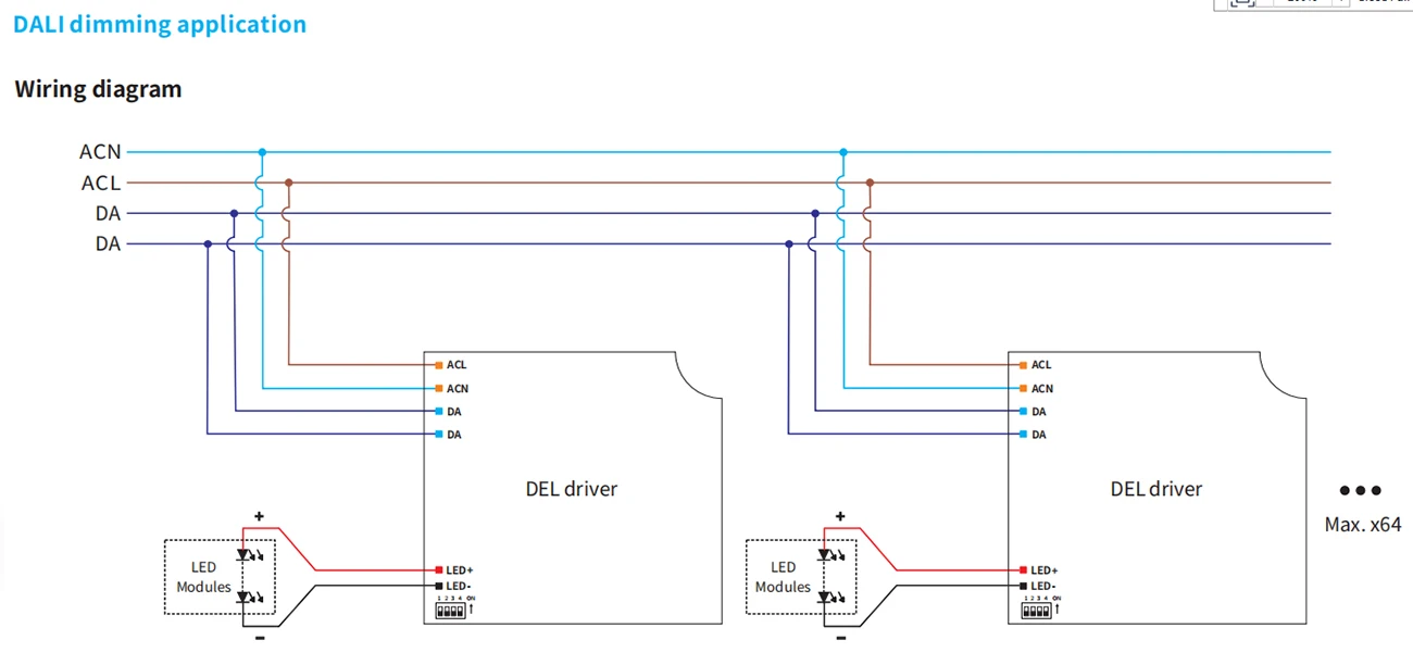 -После установки в соответствии с схемой проводки приложения DALI dimming драйвер автоматически переключается в режим Управления DALI после получения любой команды DALI.