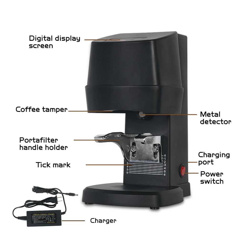 Материал:Пластик (корпус машины) + алюминиевое серебряное покрытие (держатель ручки) + нержавеющая сталь 304 (тампер для кофе)