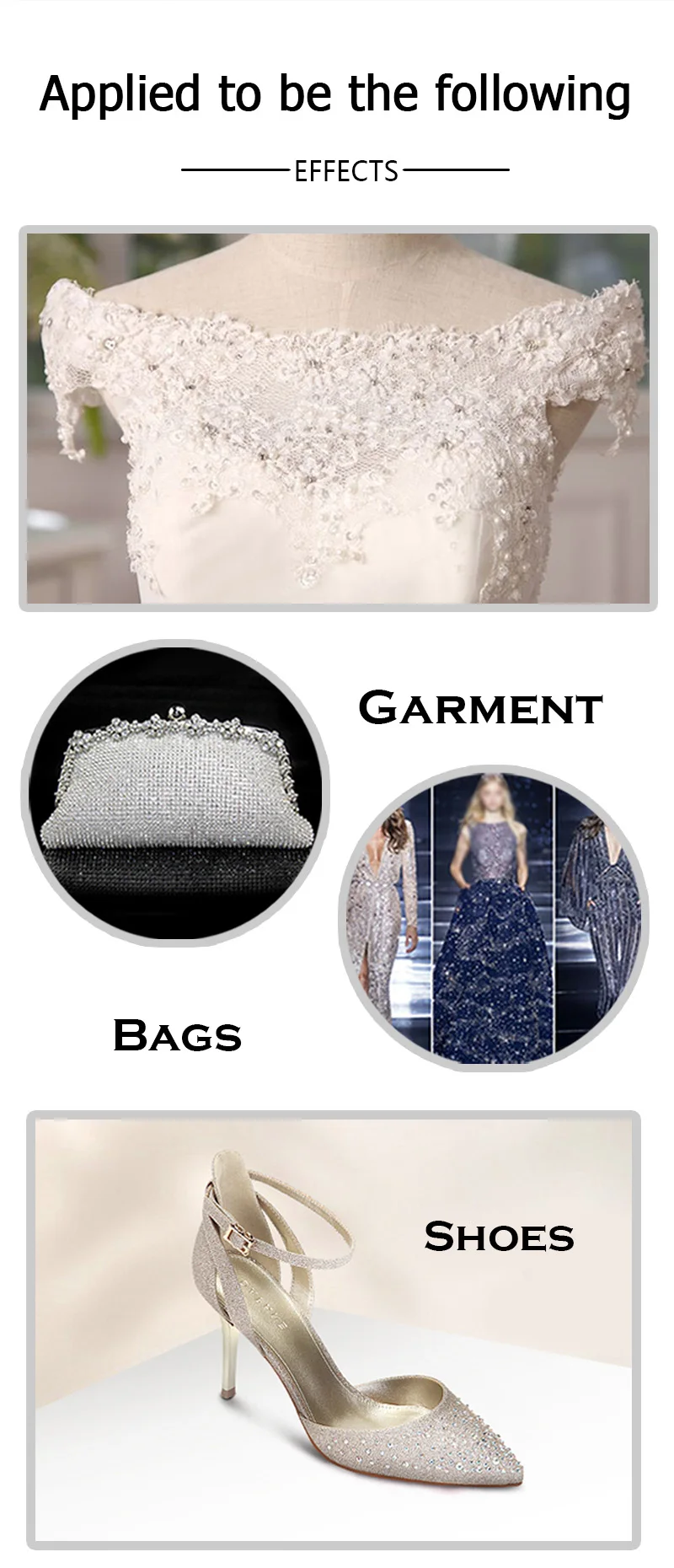 - Used on:Bridal Dresses Wedding Dresses Fashion Bags Phones Cell Mask