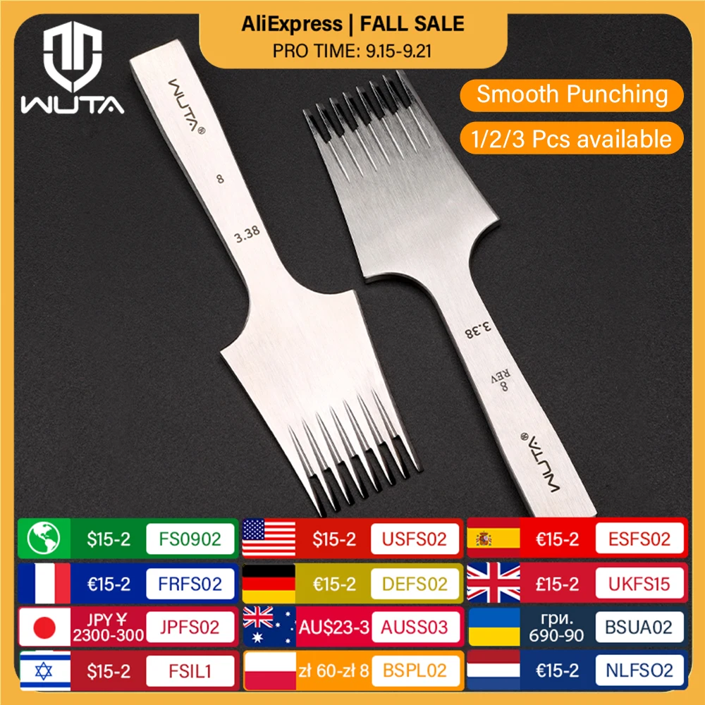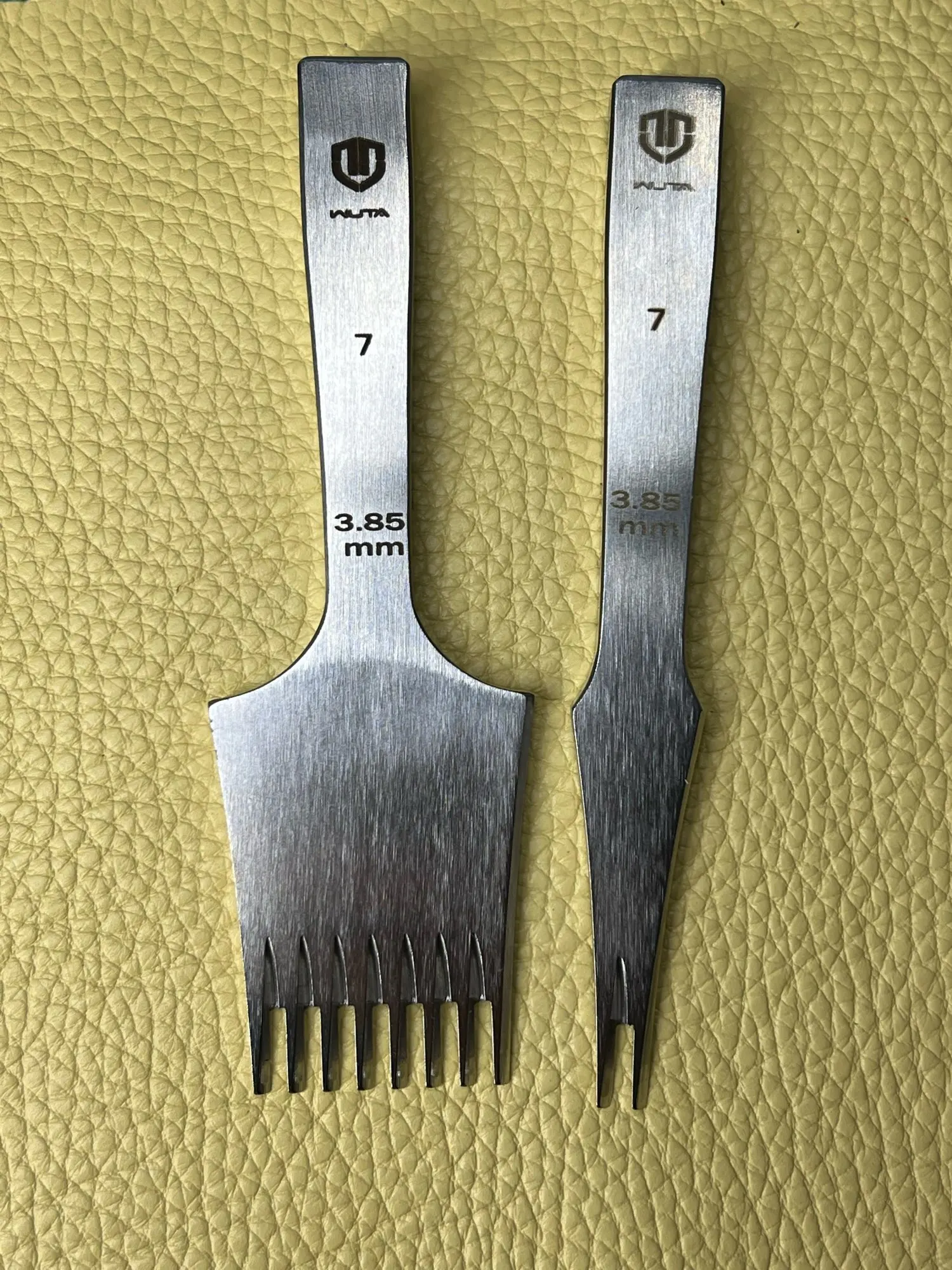 Высококачественный комплект прямых пробойников для кожи от Wuta из инструментальной стали, с полированными зубьями. Такие пробойники европейского (французского) типа, бывают двух видов: прямые (лицевая сторона) и обратные (изнаночная сторона).