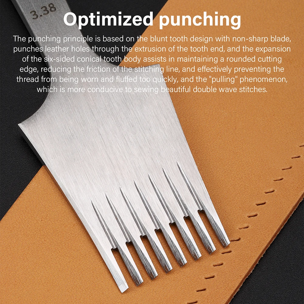 3------ Оптимизированная штамповка: Принцип штамповки основан на конструкции с тупым зубом и неострым лезвием, благодаря чему отверстия в коже пробиваются за счет выдавливания конца зуба, а расширение шестигранного конического корпуса зуба помогает сохранить закругленную режущую кромку, уменьшая трение режущего инструмента. линия сшивания и эффективное предотвращение слишком быстрого изнашивания и распушения нити, а также явление "вытягивания", которое в большей степени способствует получению красивых двойных волнообразных швов.