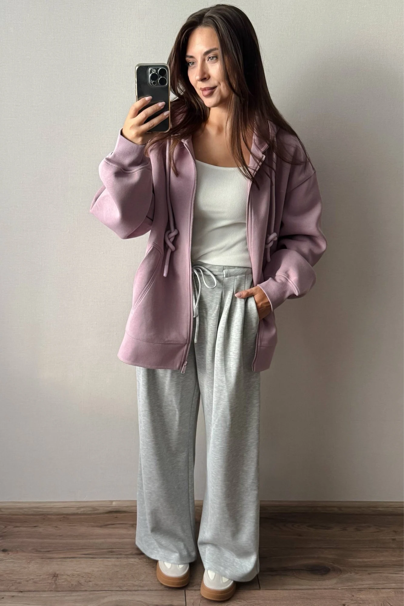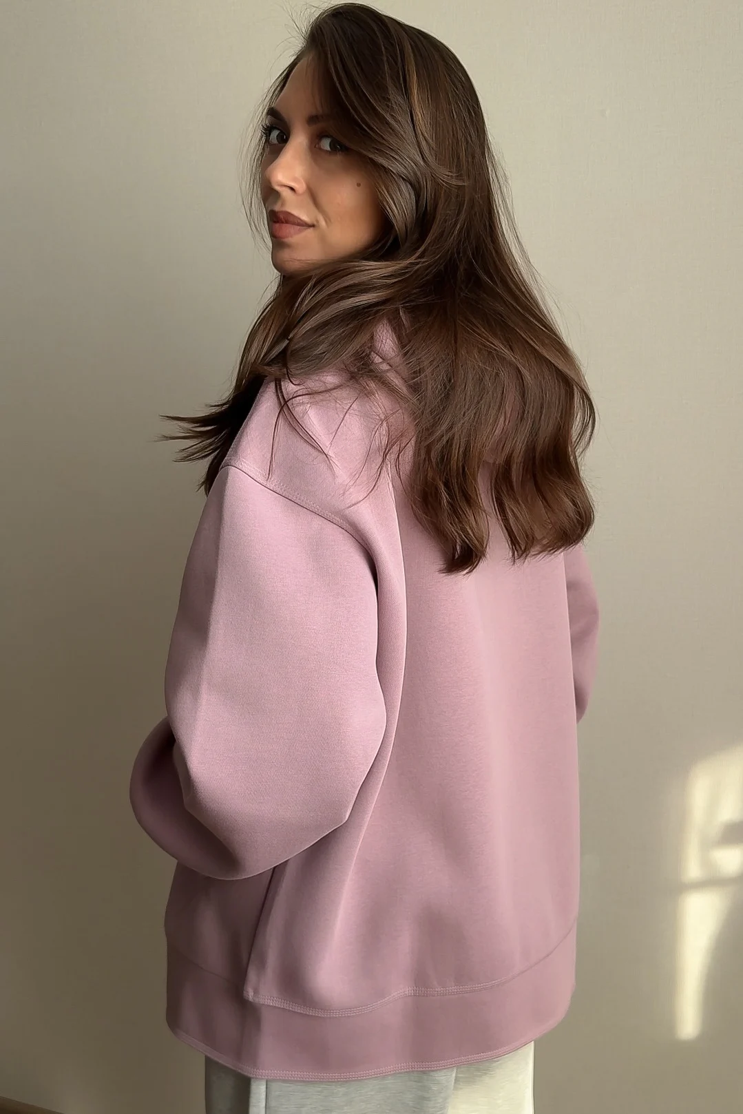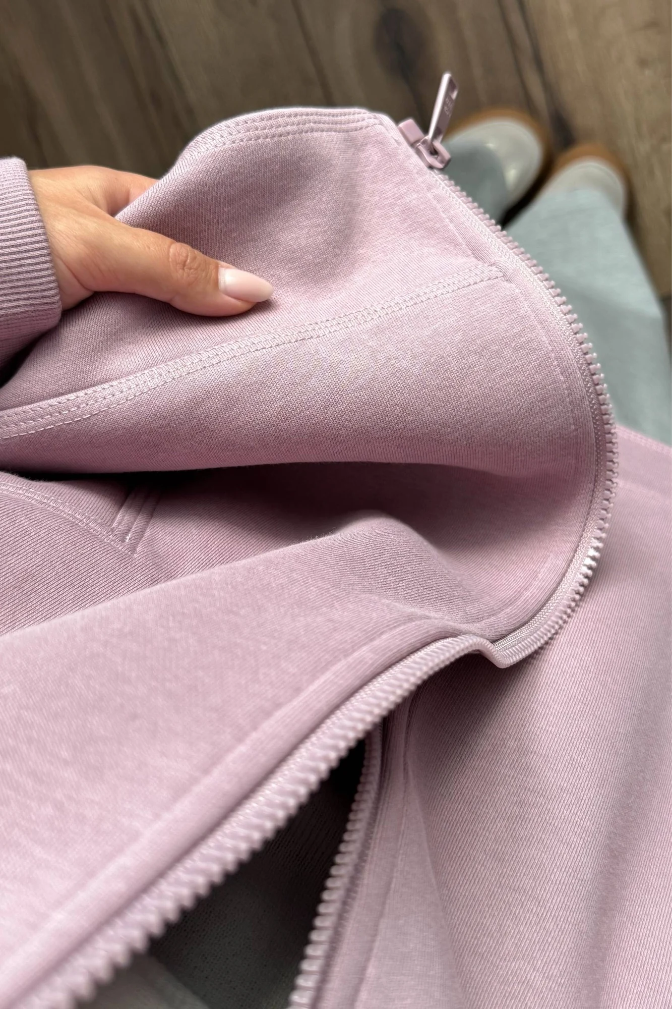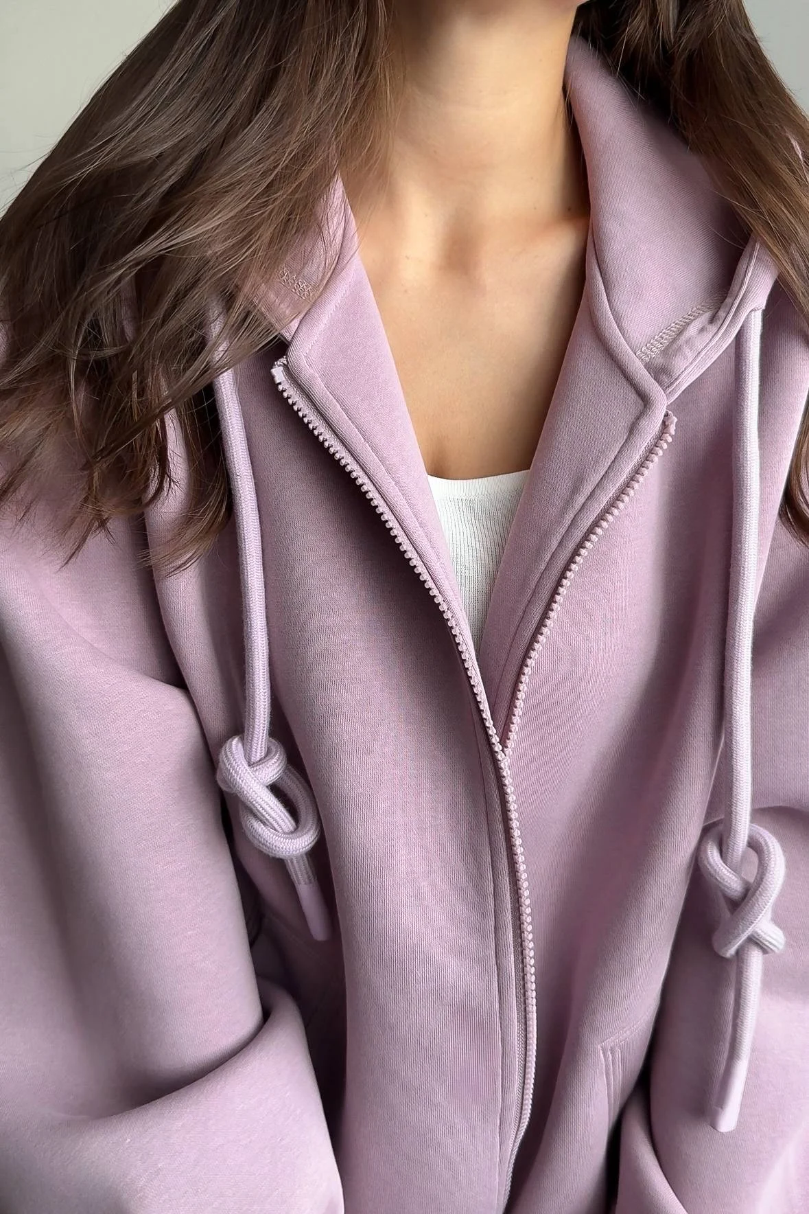 Больше обзоров Вы найдете в моем тг канaлe - заглядывайте в гости! Постоянно заказыю вещи от этого бренда, потому что их стиль мне очень по душе! и, конечно же, качество никогда не подводит - аккуратный и качественный пошив и материлы, хорошая длина изделий, необычные дизайны! Вашему вниманию, мой обзор на олимпийку от этого бренда! На свои параметры 88/66/88 см, грудь 75С и рост 160 см выбрала зипку в размере S в цвете Purple. На выбор ещё в черном цвете. Сама по себе олимпийка свободной посадки. Хорошая длина рукавов и самого свитшота - подойдет высоким и ещё лучше сядет на рост от 165 см (в размере S). На мои параметры олимпийка, в целом, велика - по росту и по объемам. Состав: 80% хлопок, 20% полиэстер. Материал очень плотный, толстый, добротный и хорошо держит форму. Уже носила ее в ветренную прохладную погоду - за счет плотного материала в ней не только тепло, но и не продувает (внутри материал из полиэстера). Модель прямая. Олимпийка не утеплена внутри, но все равно очень плотная и далеко не хлипкая. Даже по своему весу она ощутима на теле. Спущенная линия плеча. Рукава на манжетах. Хороший глубокий капюшон, аккуратный, по форме головы., дополнительно регулируется шнурками. Спереди расположены глубокие боковые карманы как у худи - очень удобное положение для рук. Как и всегда просто идеальное качество и материалов, и пошива! Красивый нежный лавандовый цвет! Самое главное - теплая на предстоящие первые похолодания! Если выбирать между олимпийской в персиковом цвете (другая модель у этого бренда, на которую у меня тоже есть обзор в тг) или этой - я бы выбрала первый вариант: утепленная, лучше подходит мне по размеру, материал тактильно мягче и нежнее, высокая горловина стойка, двойной замок на молнии. В общем, по качесву и самой олимпийке у меня абсолютно нет нареканий, просто она не подошла мне по моим параметрам - размер XS бы подошел, но его, увы, нет.